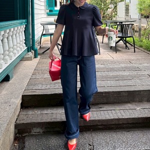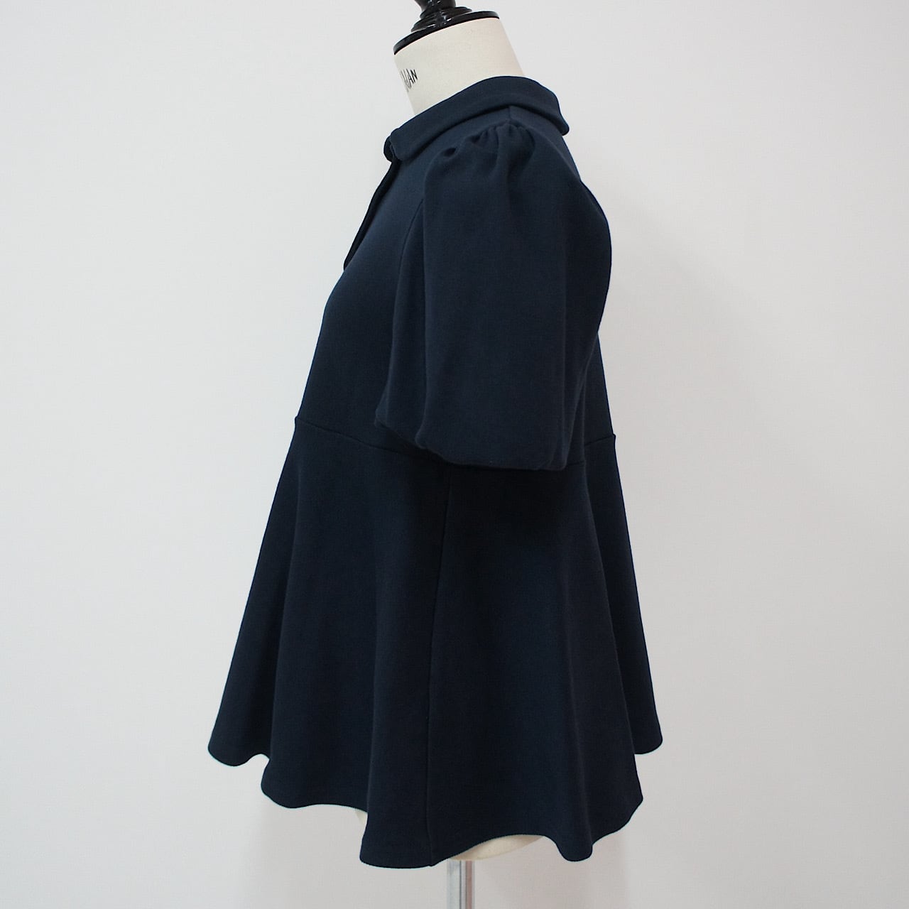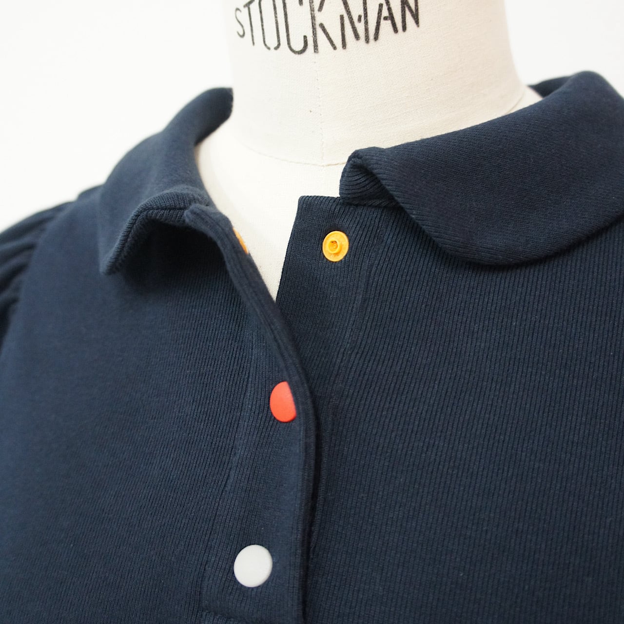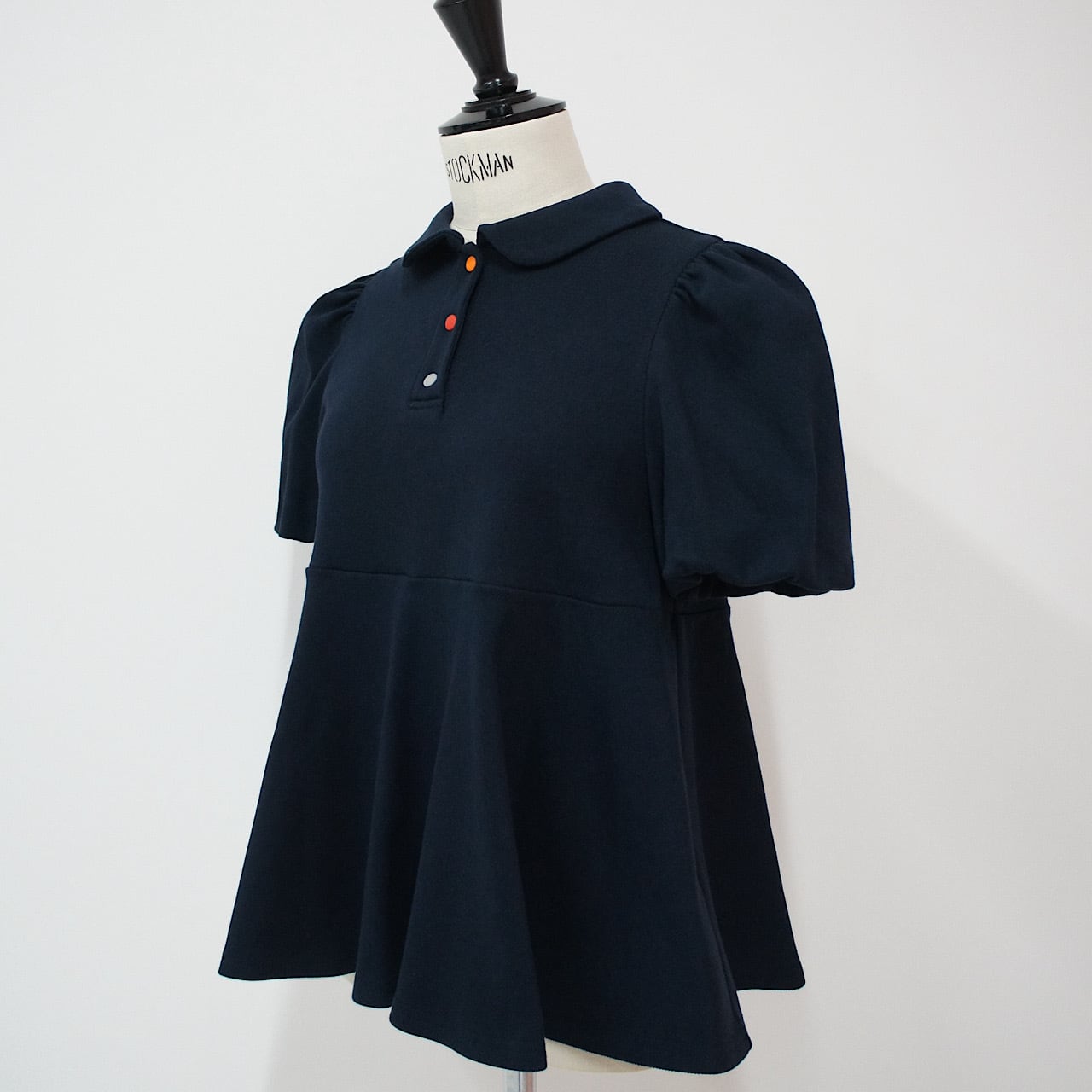 丸襟、マーブルボタンのポロシャツ。ぽわんとしたお袖にフレアになった裾部分。適度なハリ感がややしっかりとした風合いを醸し出すこだわりの詰まった新商品!