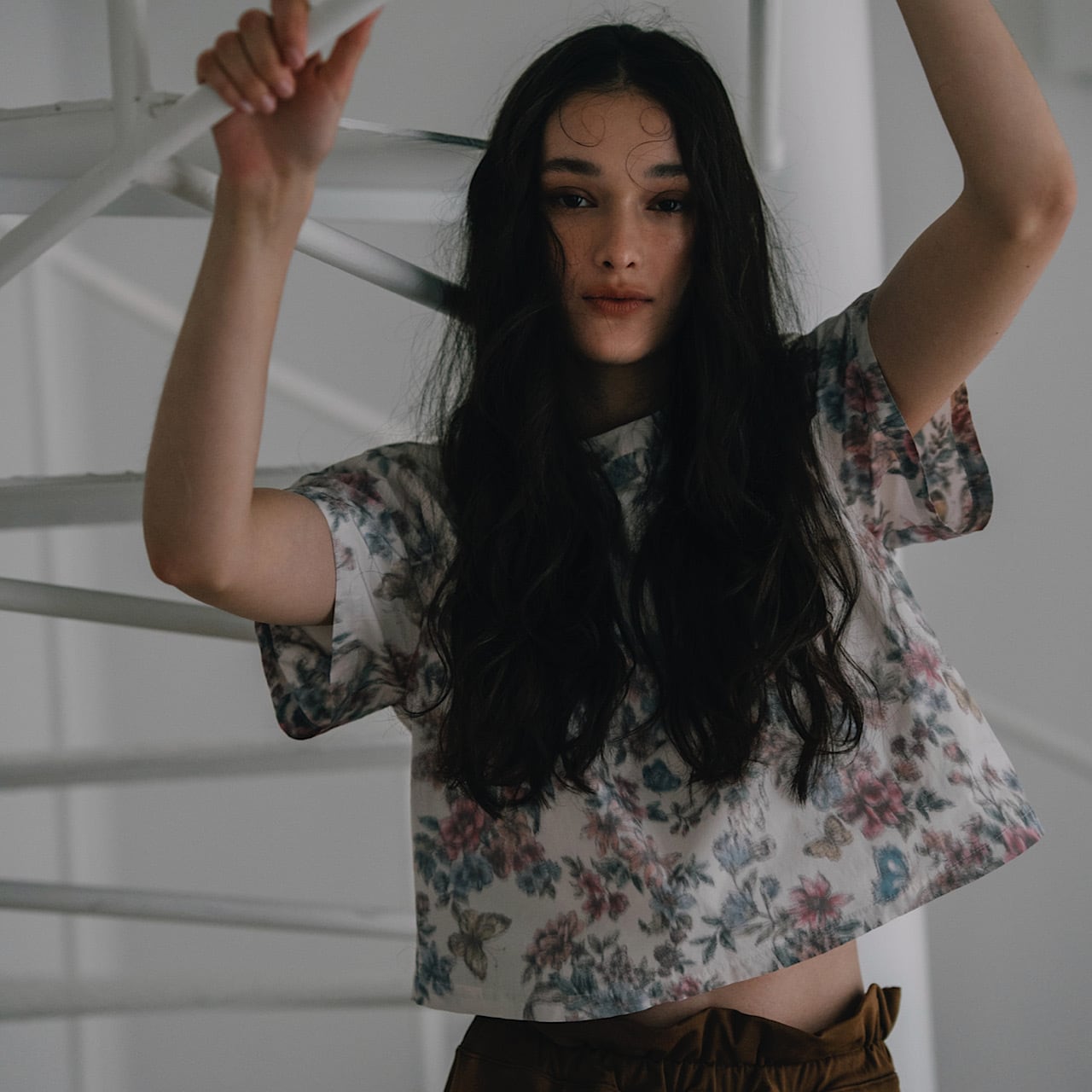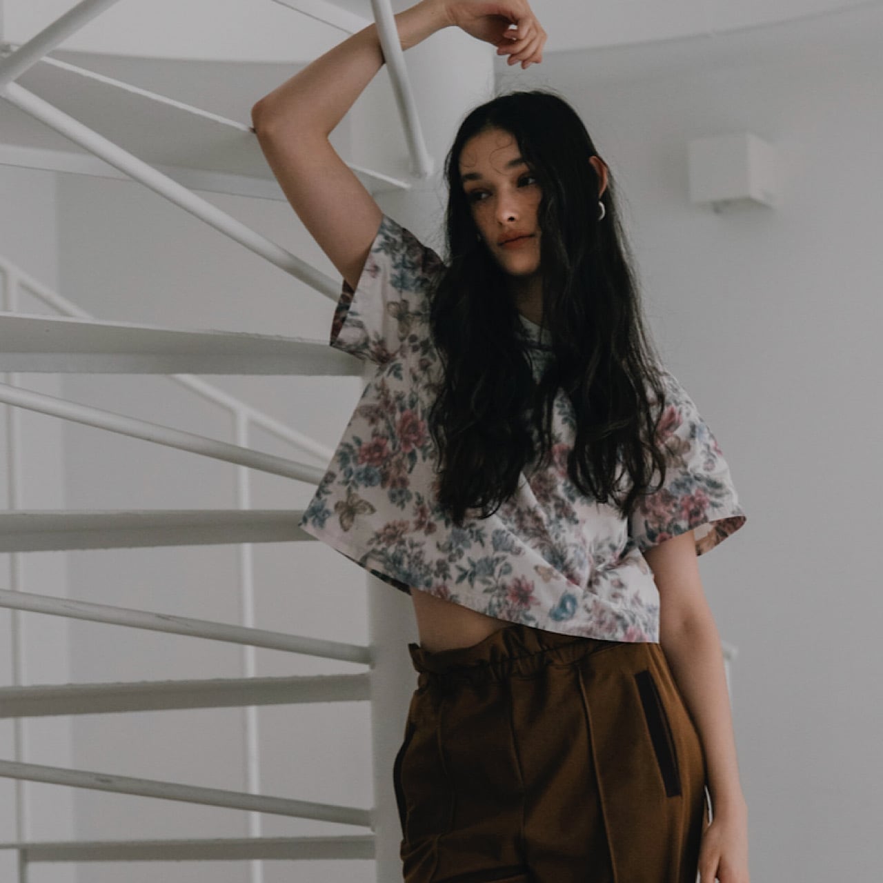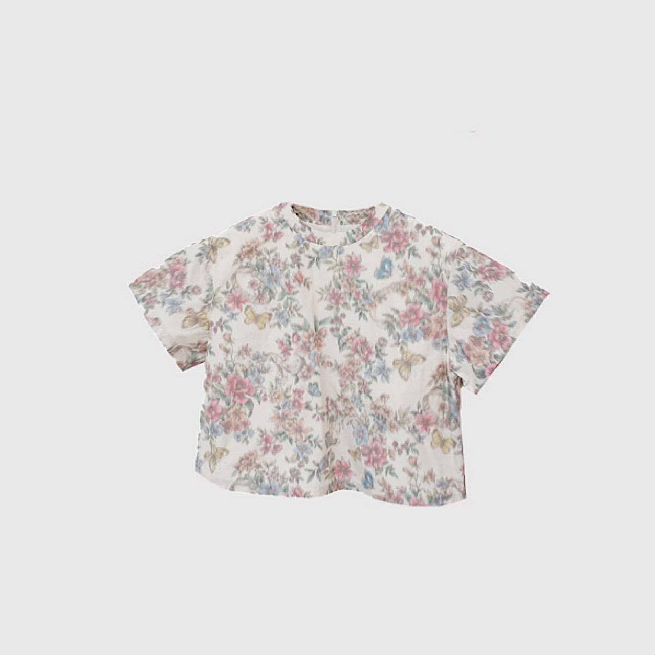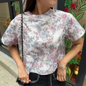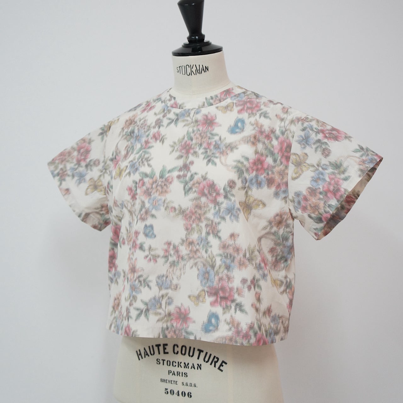レトロでダスティーカラーの品のあるトップス。シンプルな形で短めの丈がボトムスを選ばない。