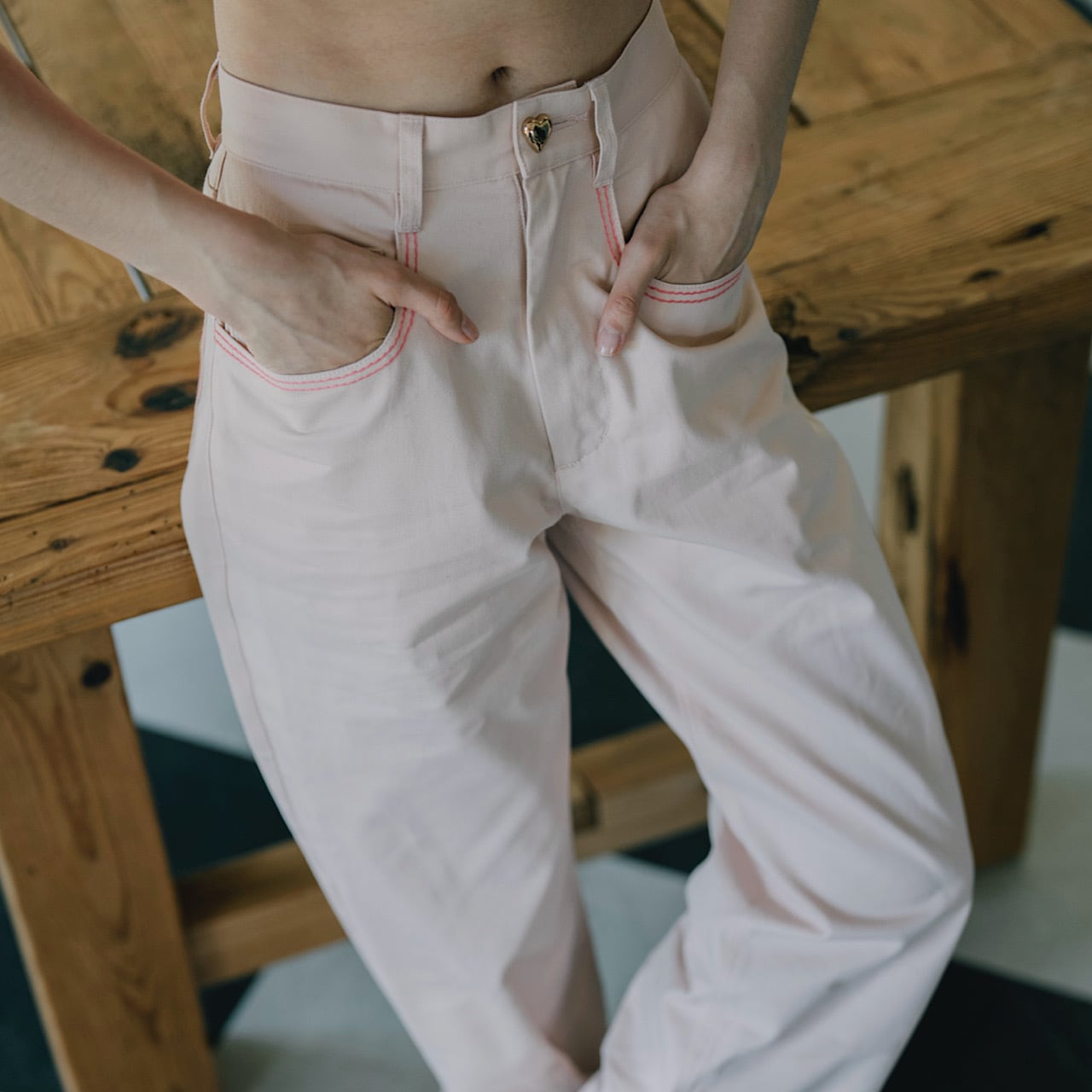 カラーステッチがポイントのパンツ。後ろのハートポケット、ウエストのハートのボタン。他にはないデザインをとことん追求した愛らしいボトムス。履いてくださるお客様に熱い想い♡が伝わりますように…。