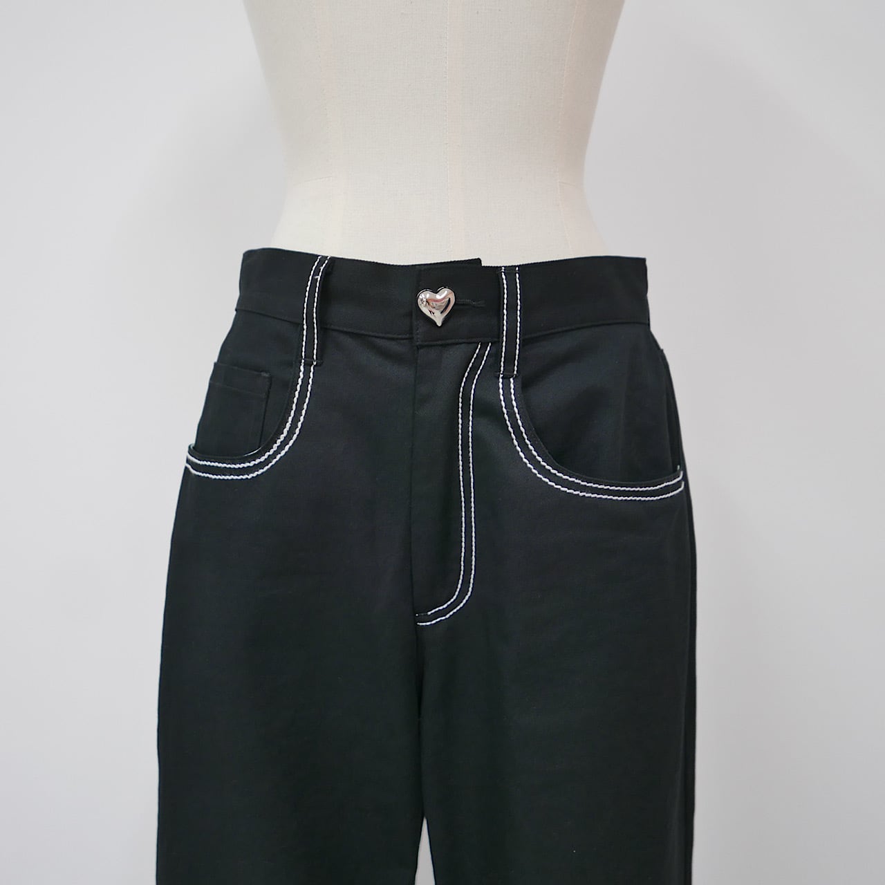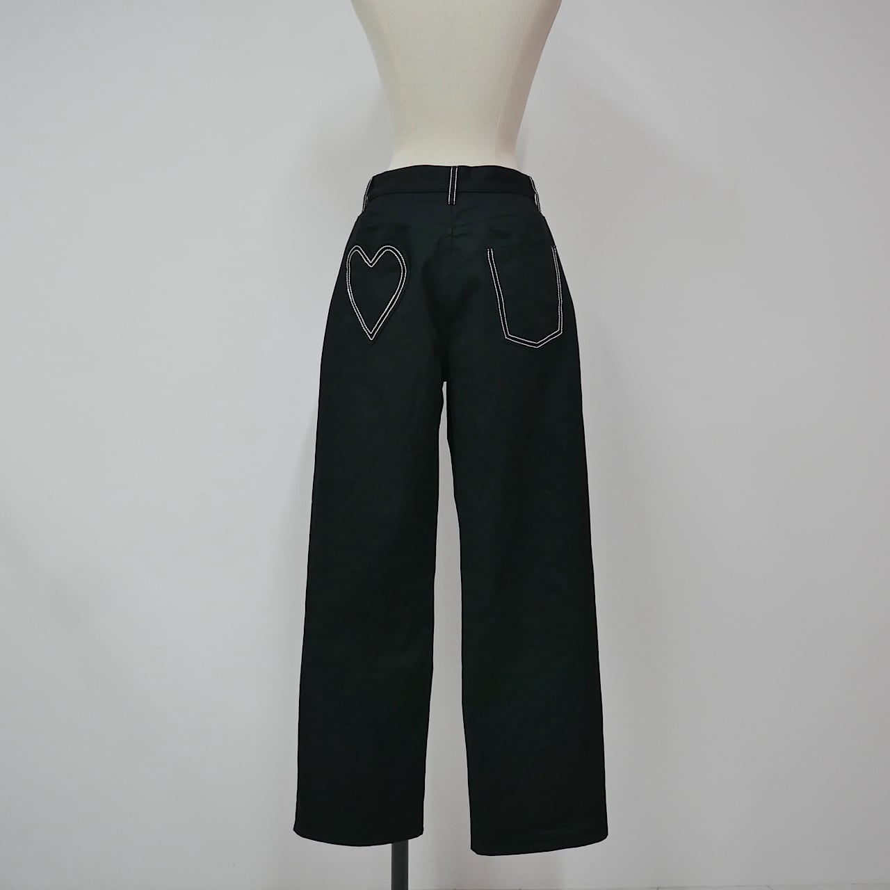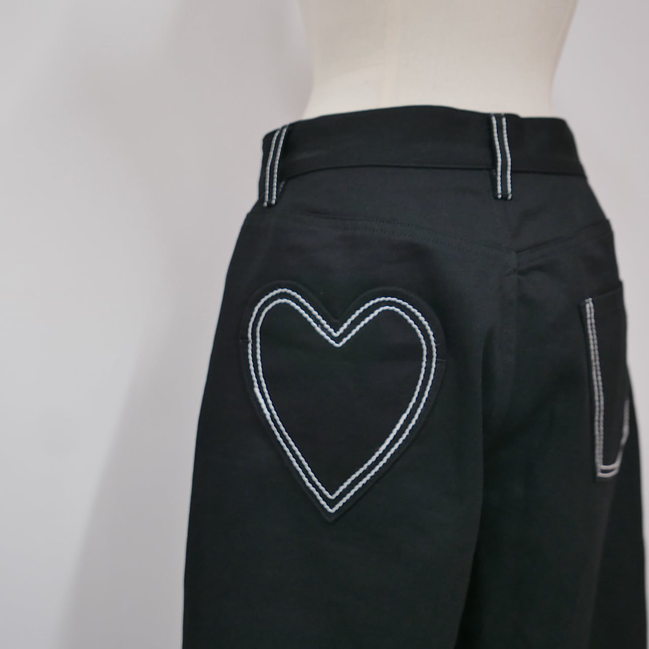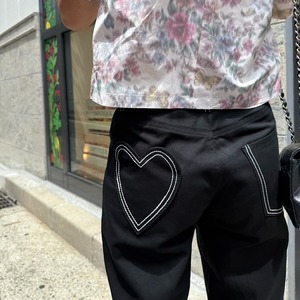 カラーステッチがポイントのパンツ。後ろのハートポケット、ウエストのハートのボタン。他にはないデザインをとことん追求した愛らしいボトムス。履いてくださるお客様に熱い想い♡が伝わりますように…。