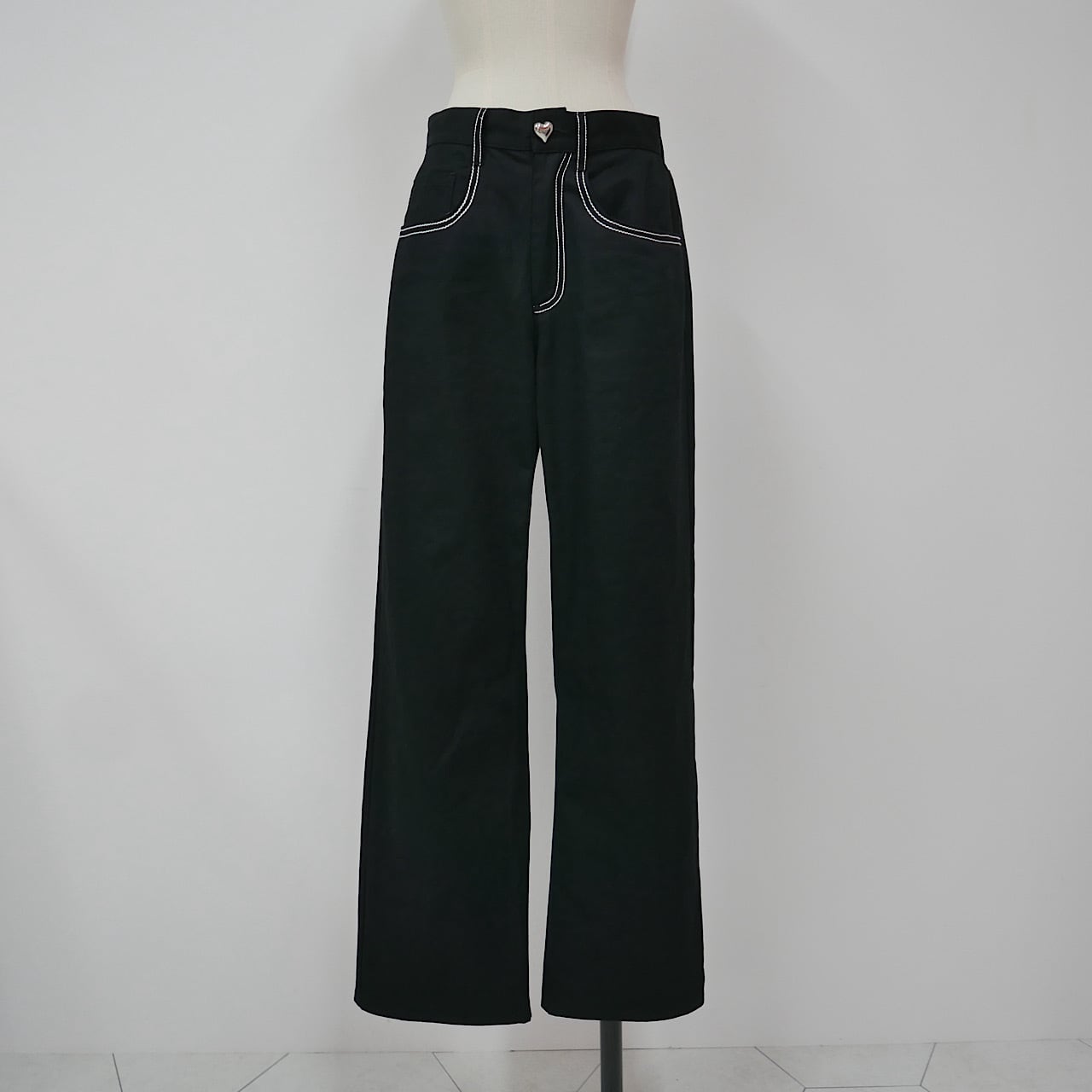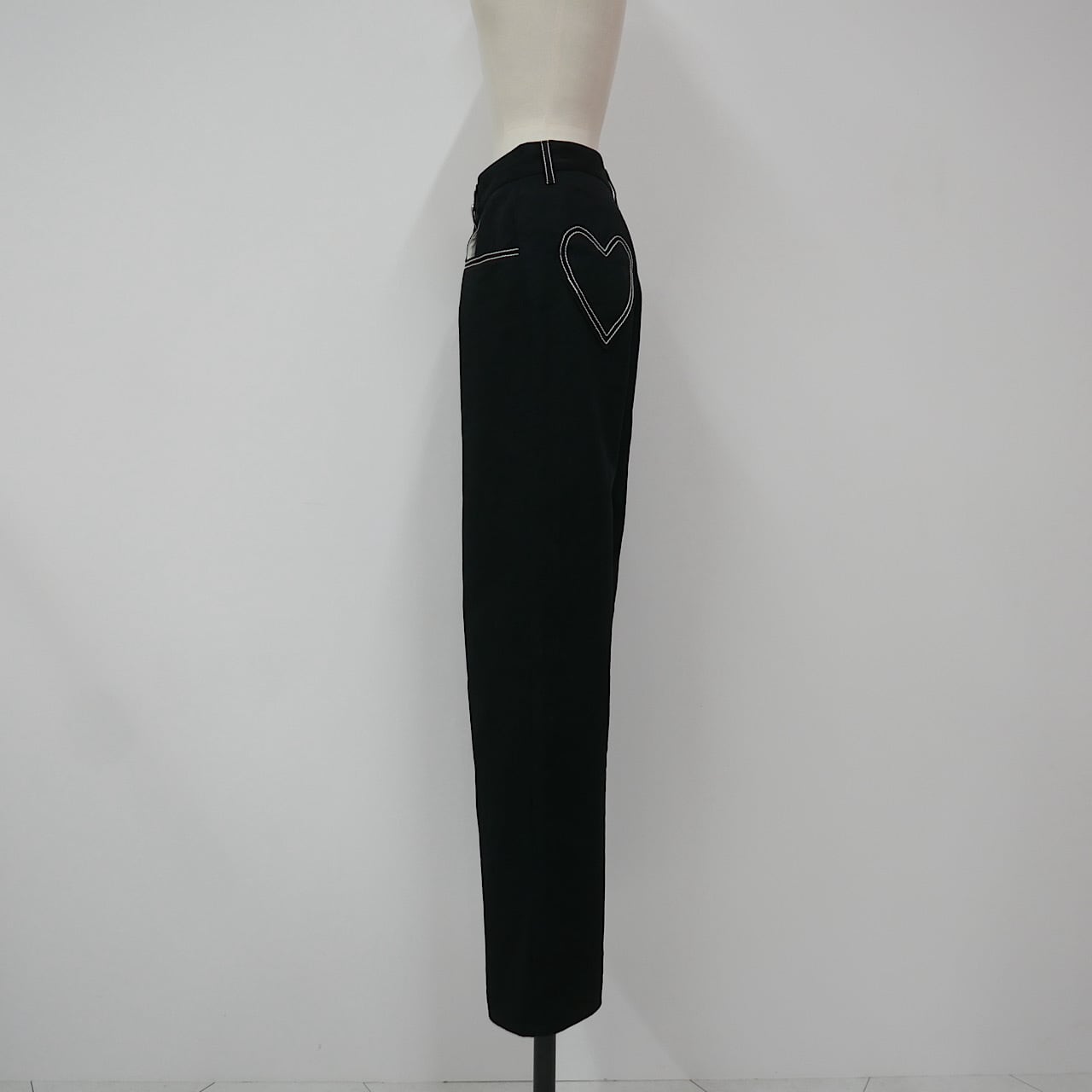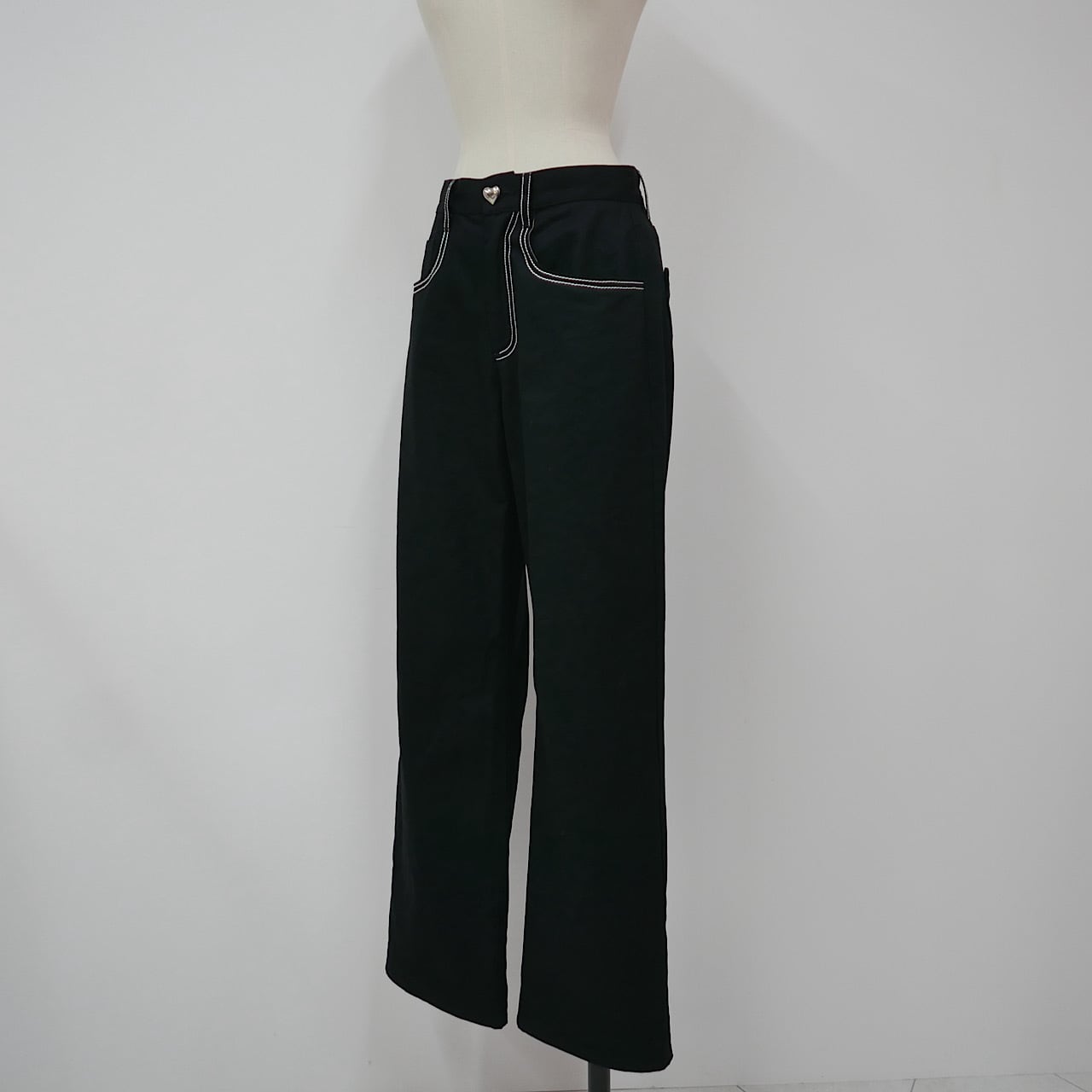 カラーステッチがポイントのパンツ。後ろのハートポケット、ウエストのハートのボタン。他にはないデザインをとことん追求した愛らしいボトムス。履いてくださるお客様に熱い想い♡が伝わりますように…。