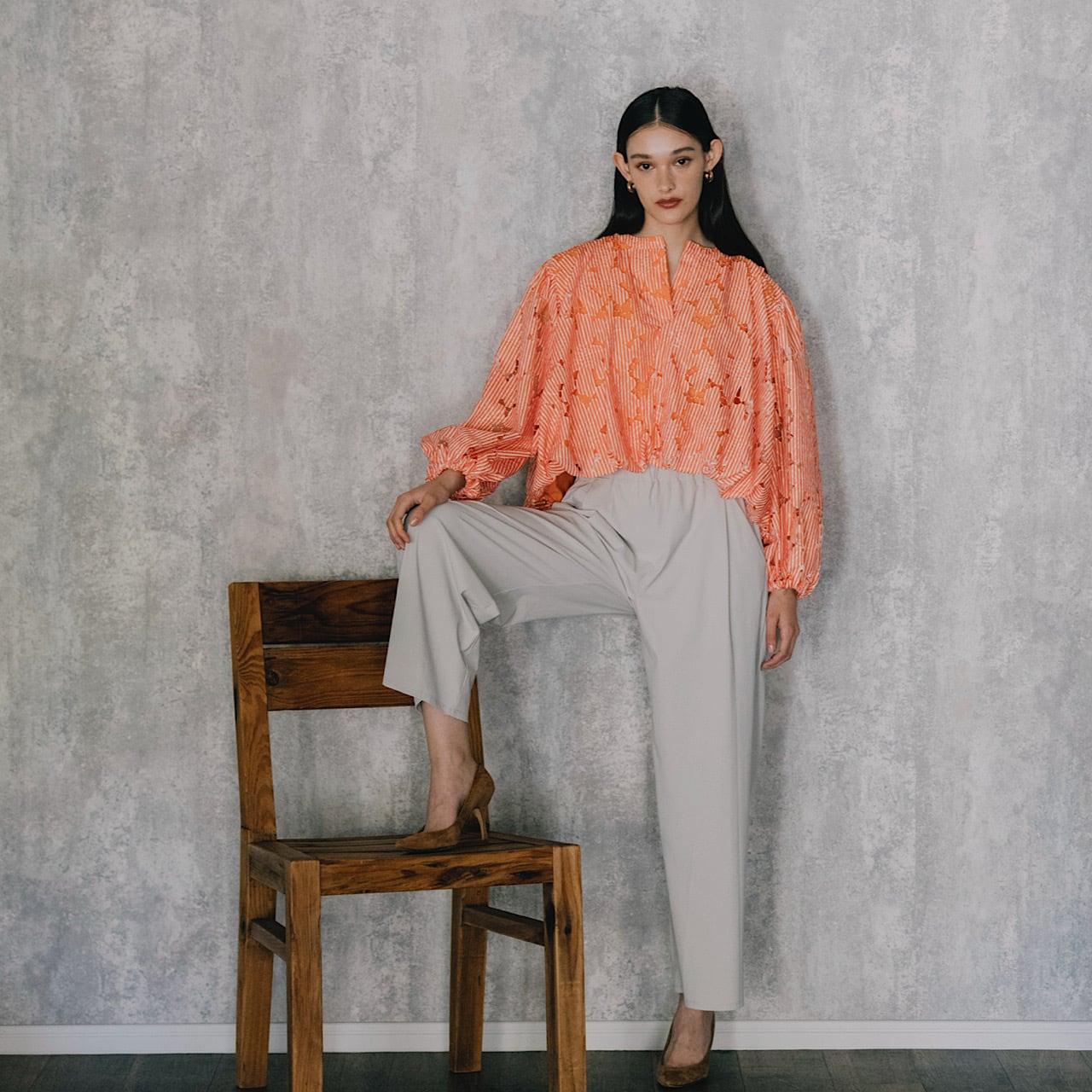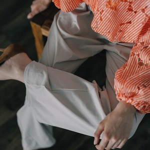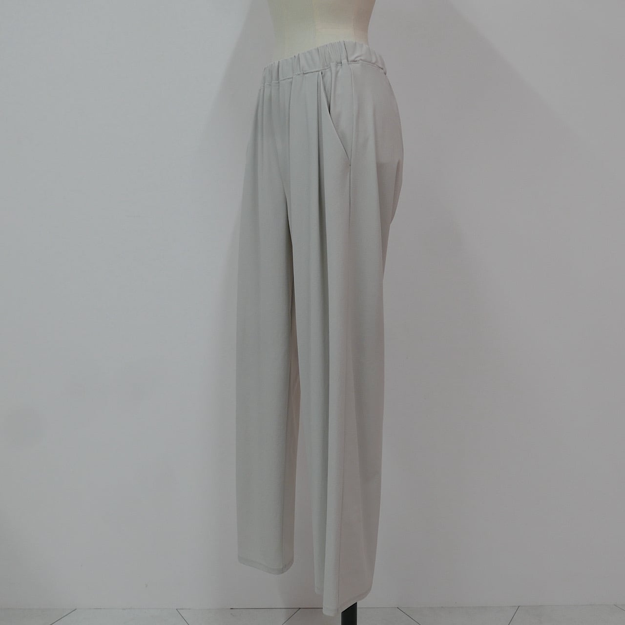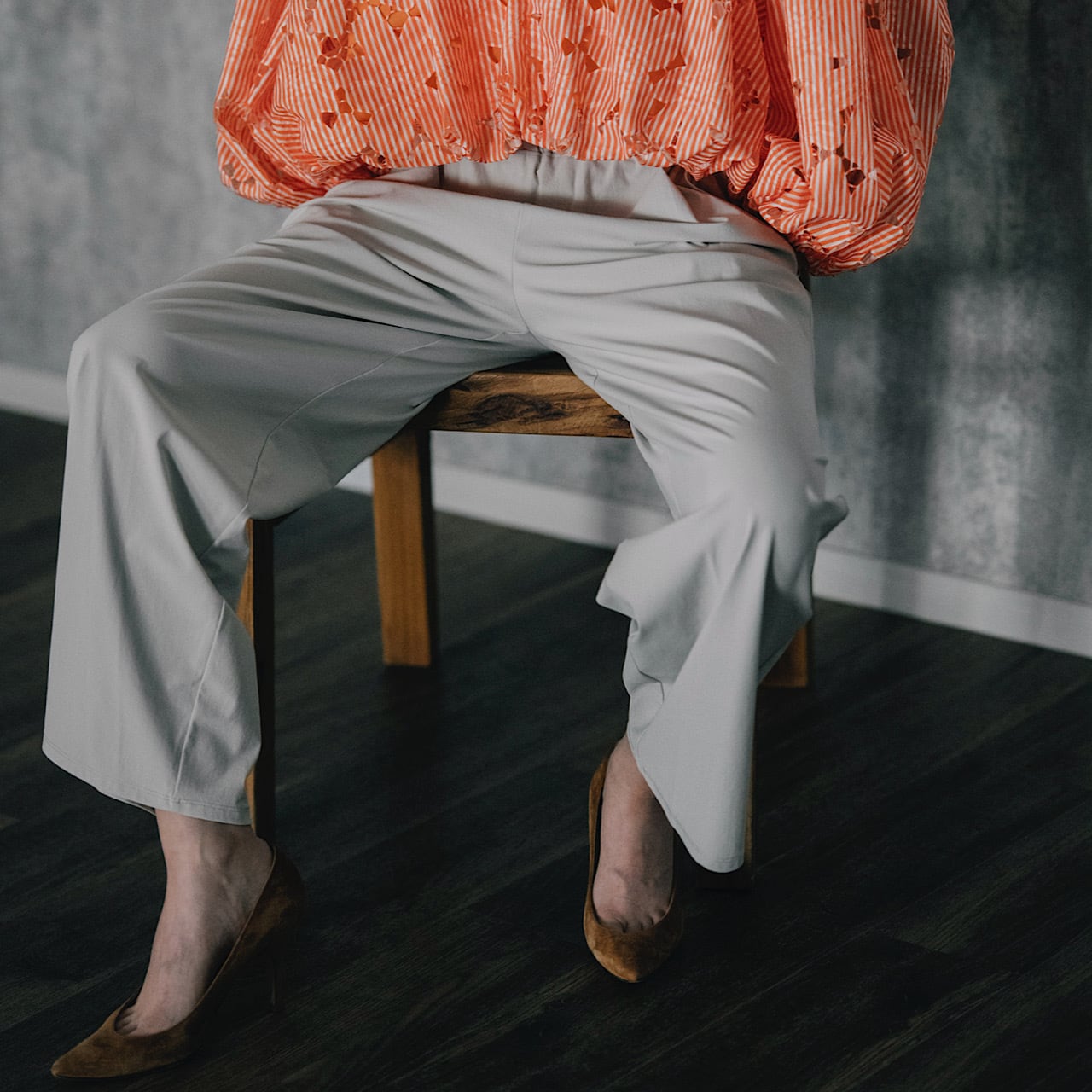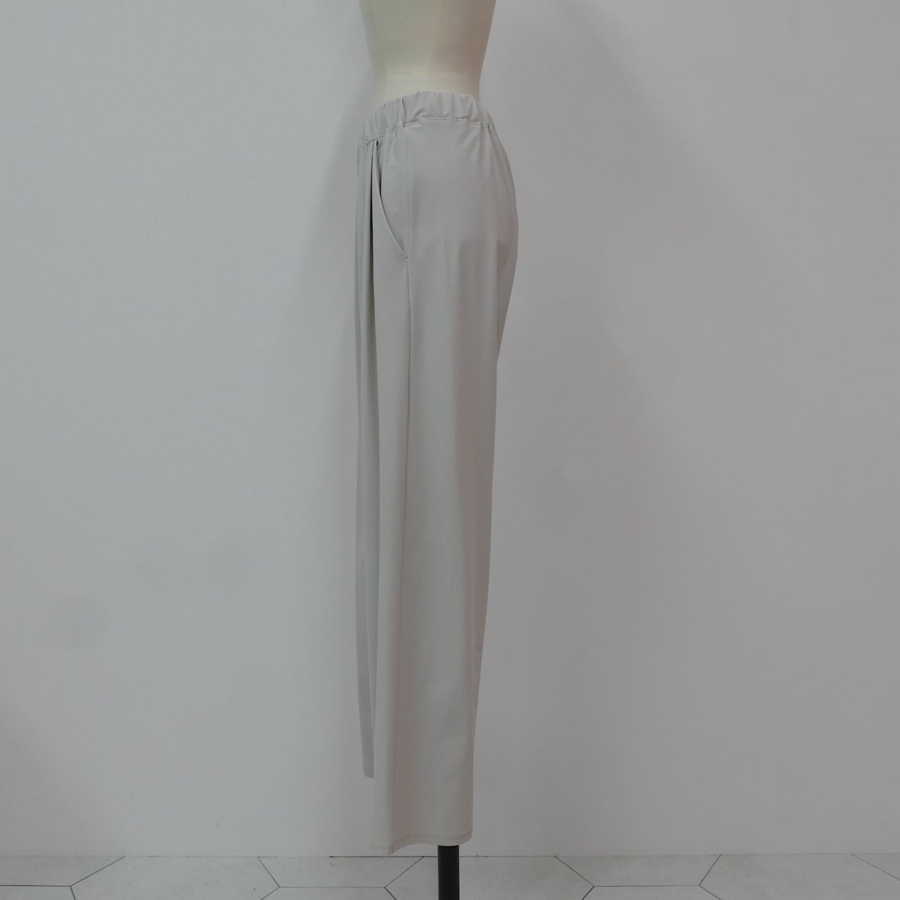 タックがあることでゆとりをもたせ裾に向かって程よく細くなるテーパードなシルエットにもこだわったパンツ。幅広い体型、ご年齢の方にお召しいただきやすくお作りしました。
