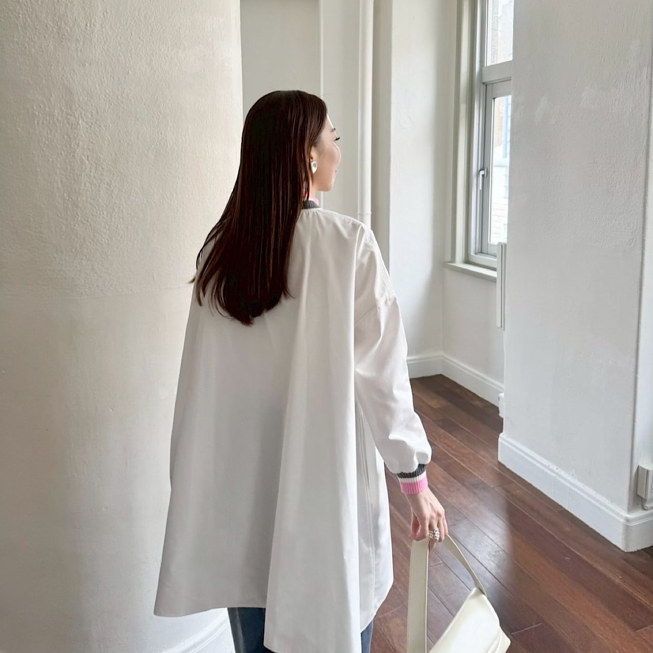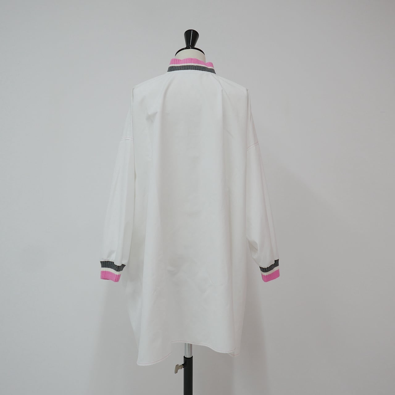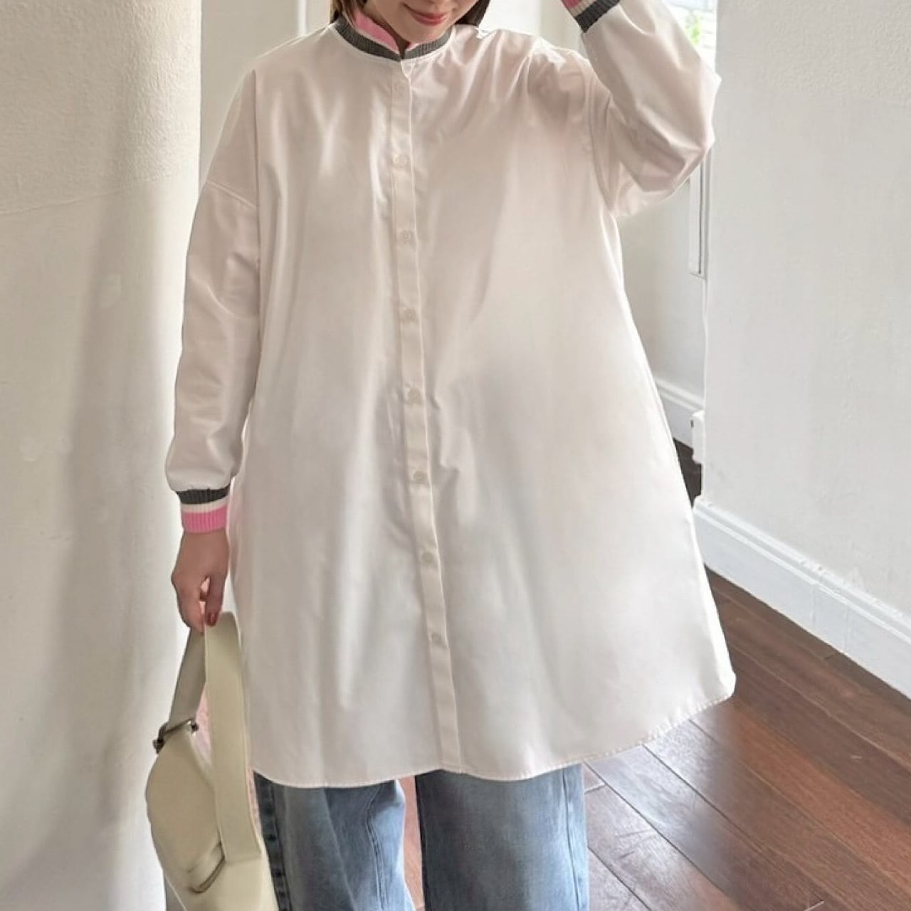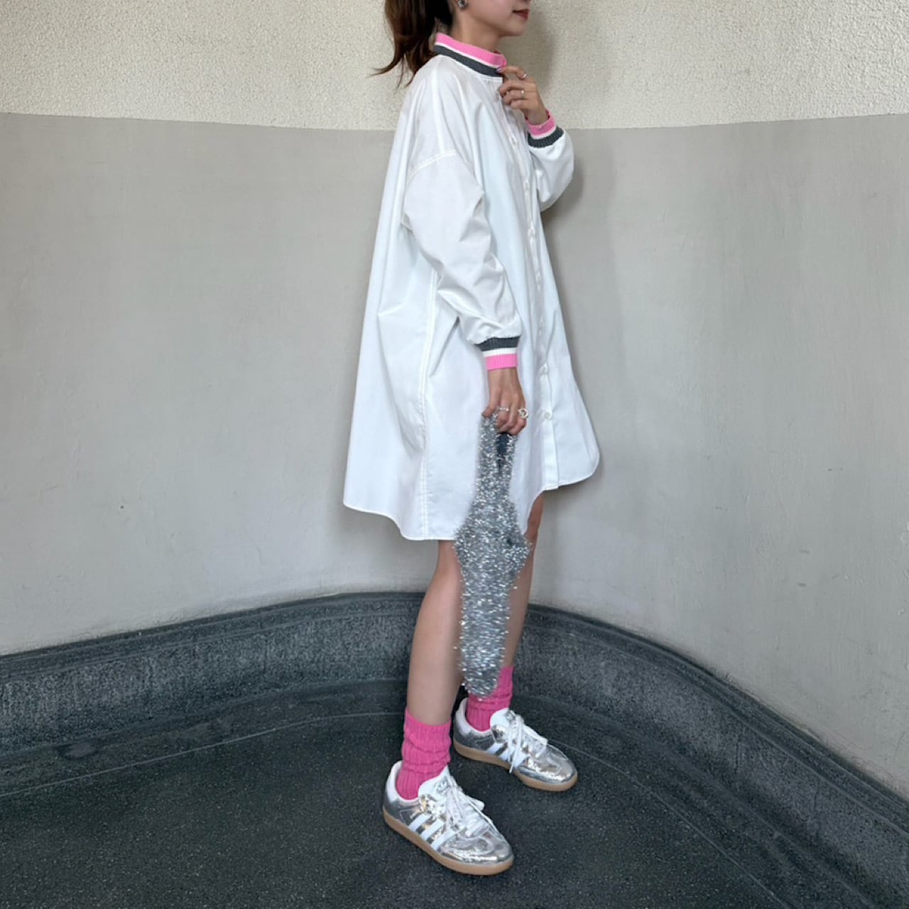 首と袖にニットのリブを施したシャツワンピース。リブの配色、リブの太さ、シャツの糸の色。細部までこだわりカジュアルと女性らしさを兼ね備えた一枚。
