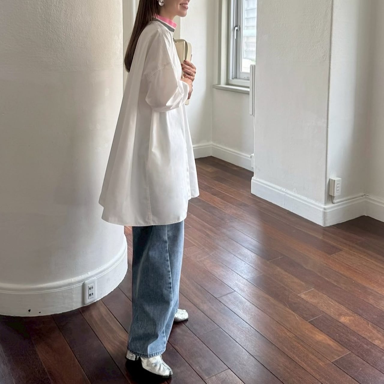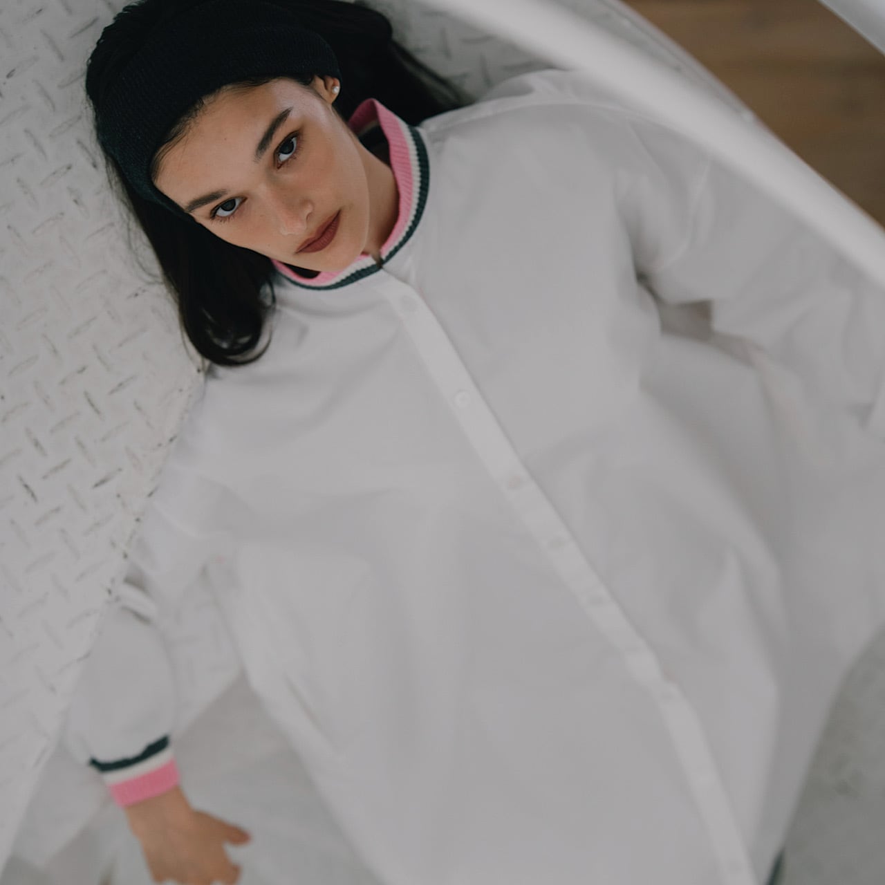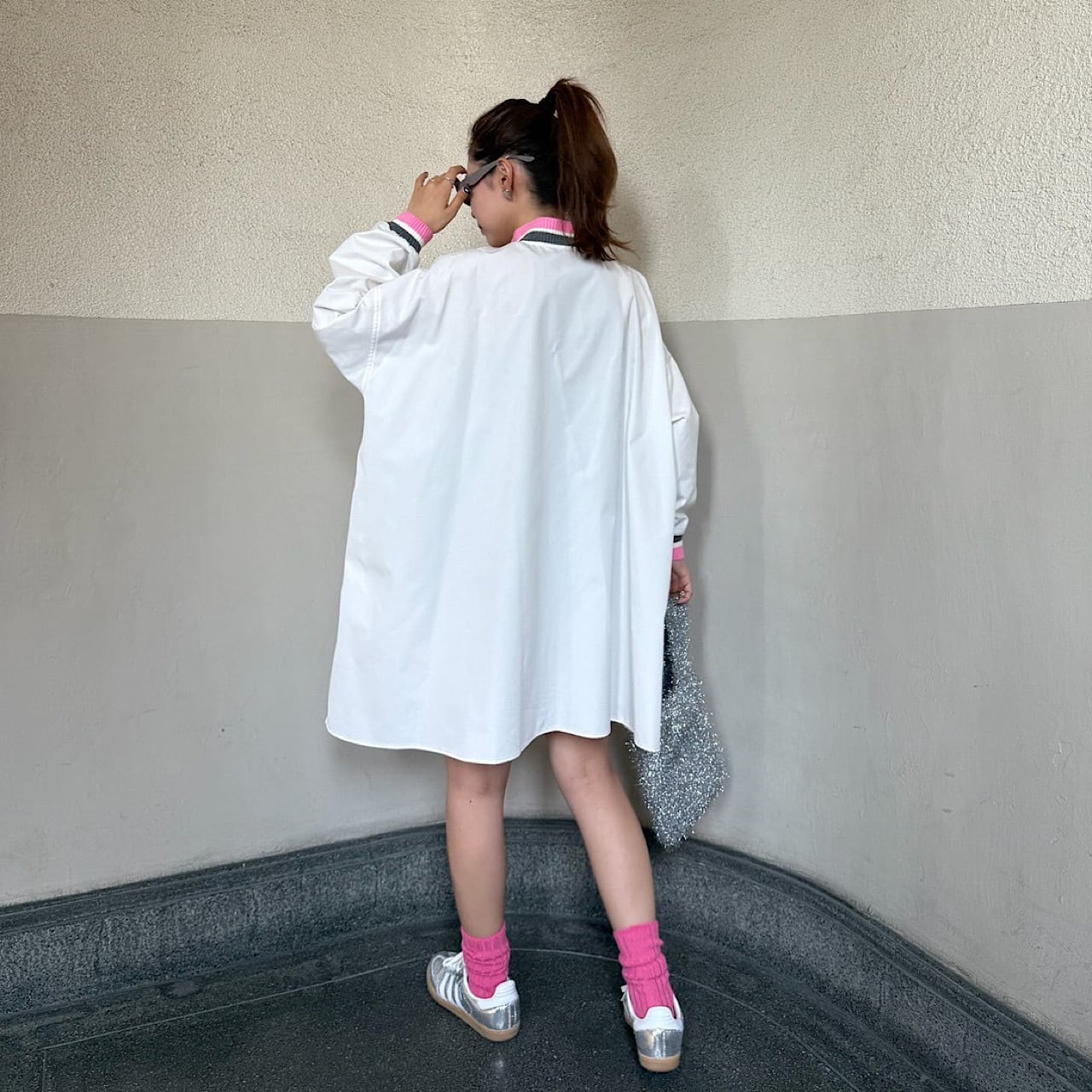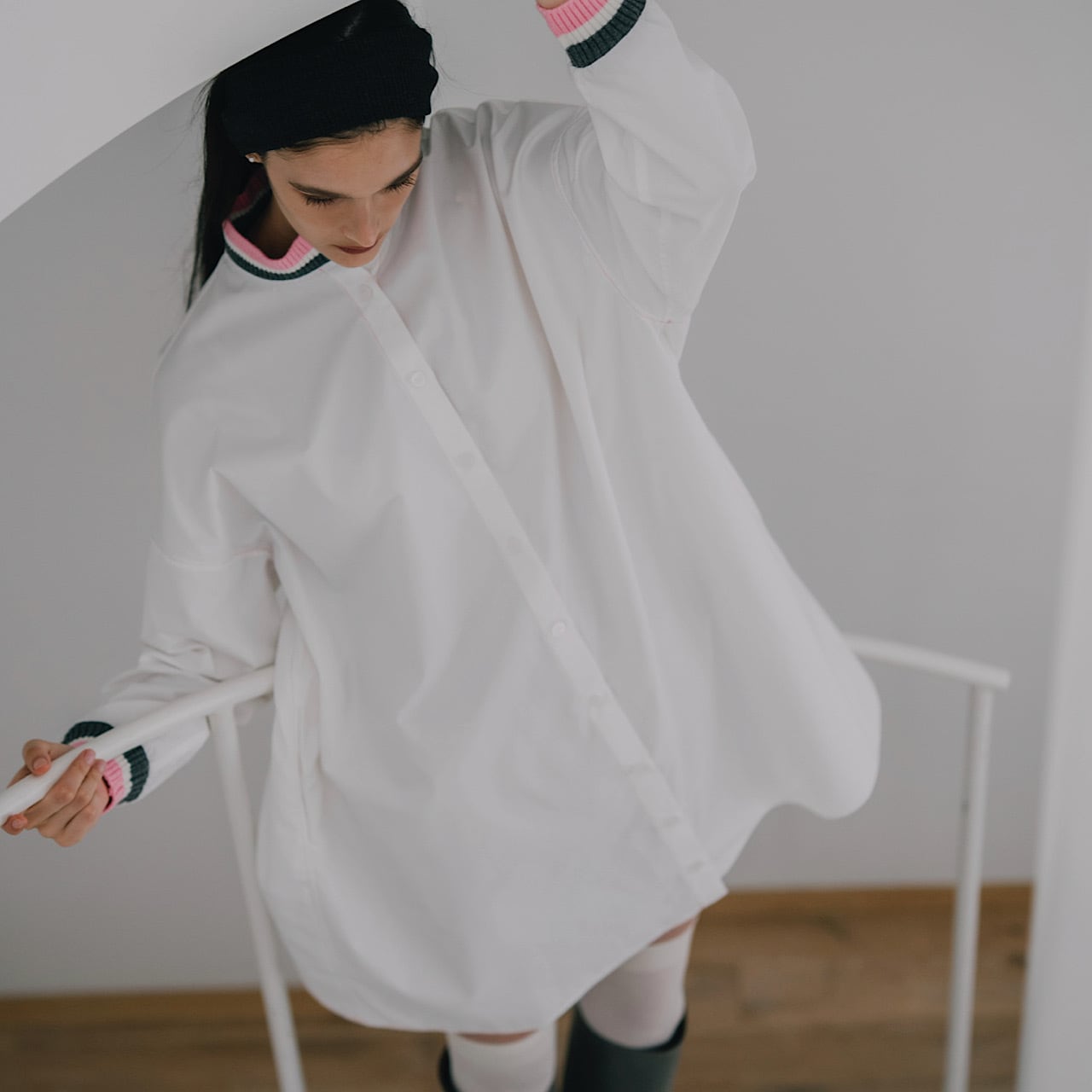 首と袖にニットのリブを施したシャツワンピース。リブの配色、リブの太さ、シャツの糸の色。細部までこだわりカジュアルと女性らしさを兼ね備えた一枚。