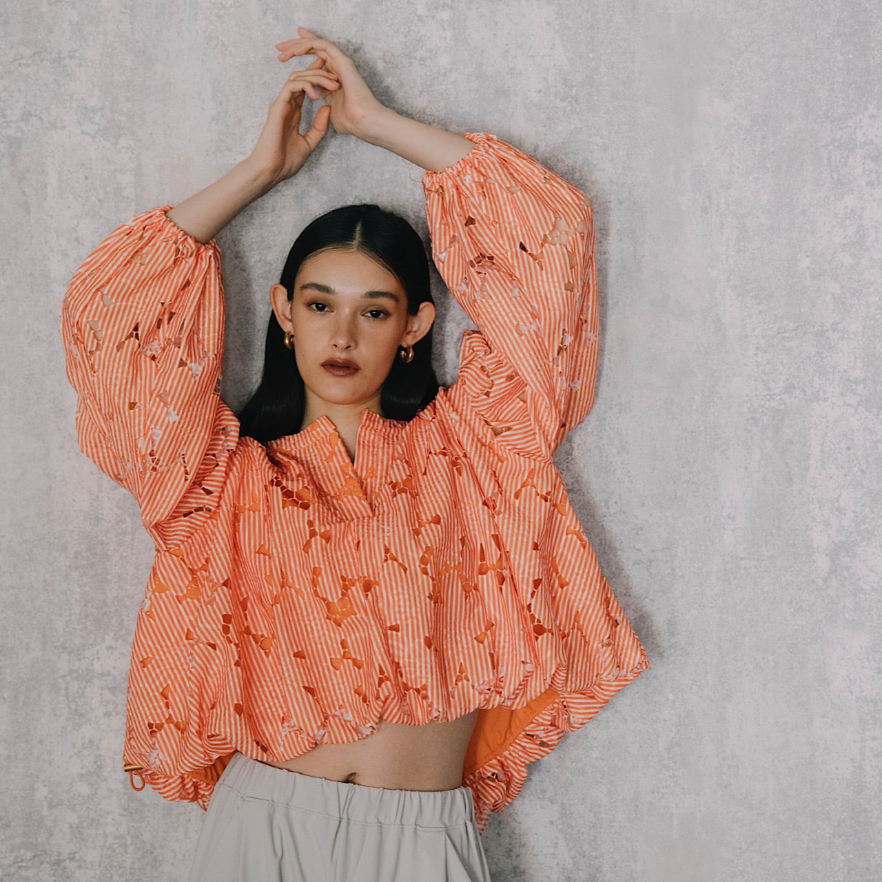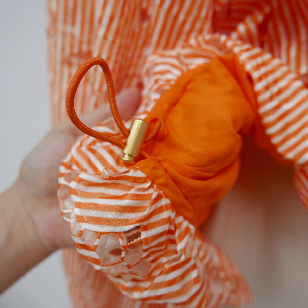 軽くてハリ感のある生地を、贅沢に使い、袖と裾部分を絞れる立体感のあるバルーンシルエット。裾部分のドロストの色にもこだわり上品さと高級感をプラス。