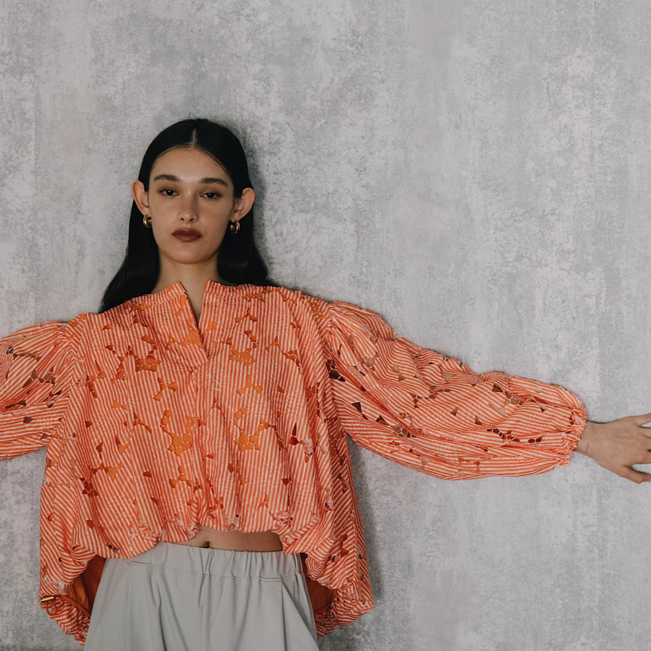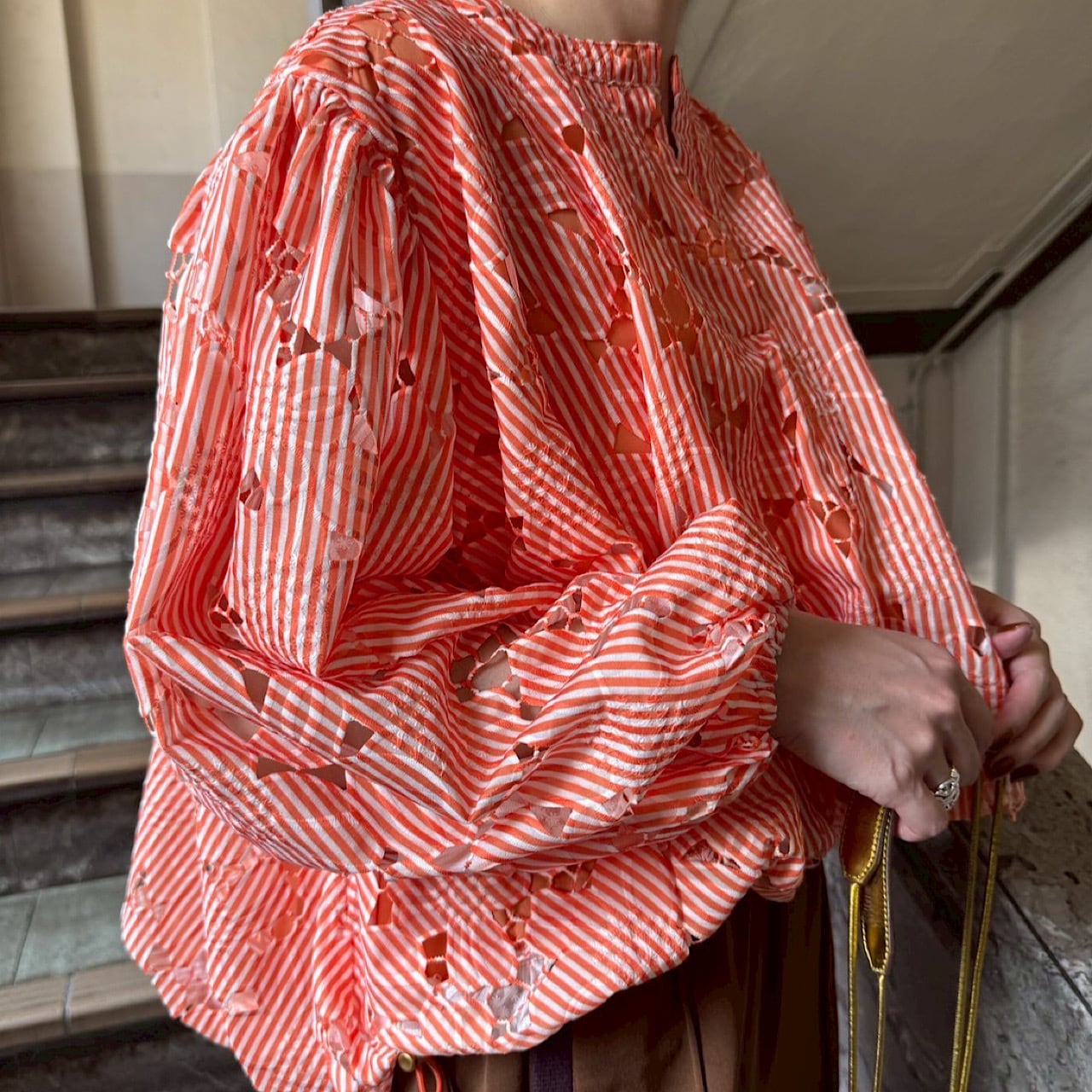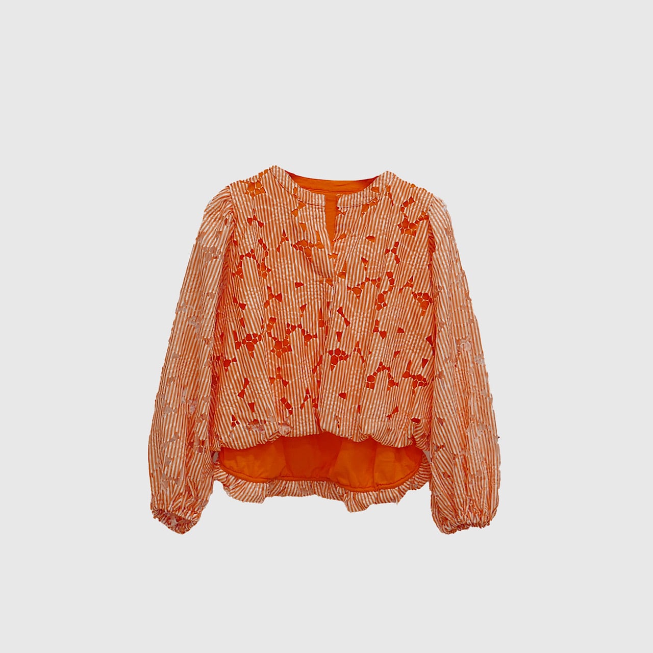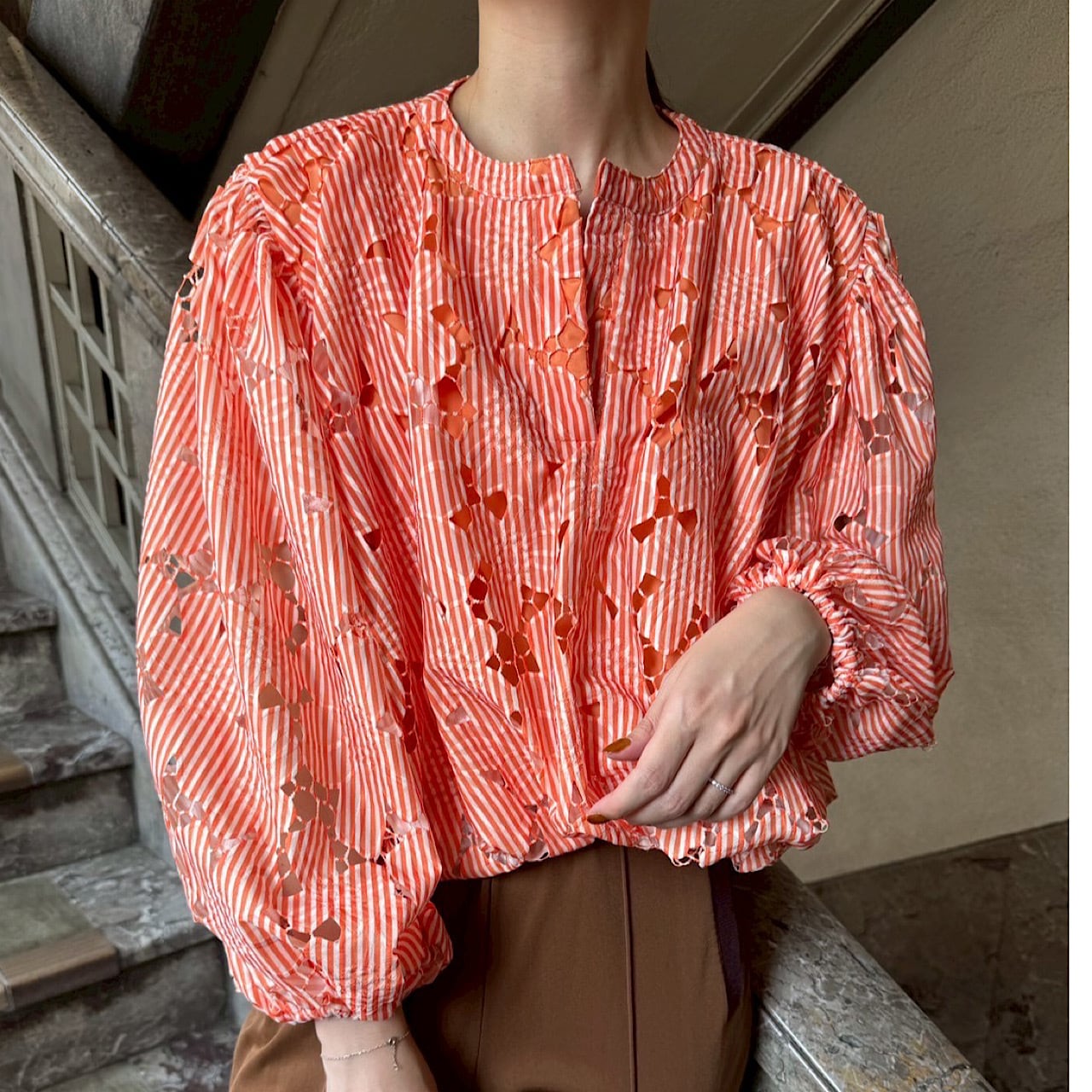 2枚の生地を重ねた華やかなブラウス。袖部分は肌の透け感も楽しめるデザインに。