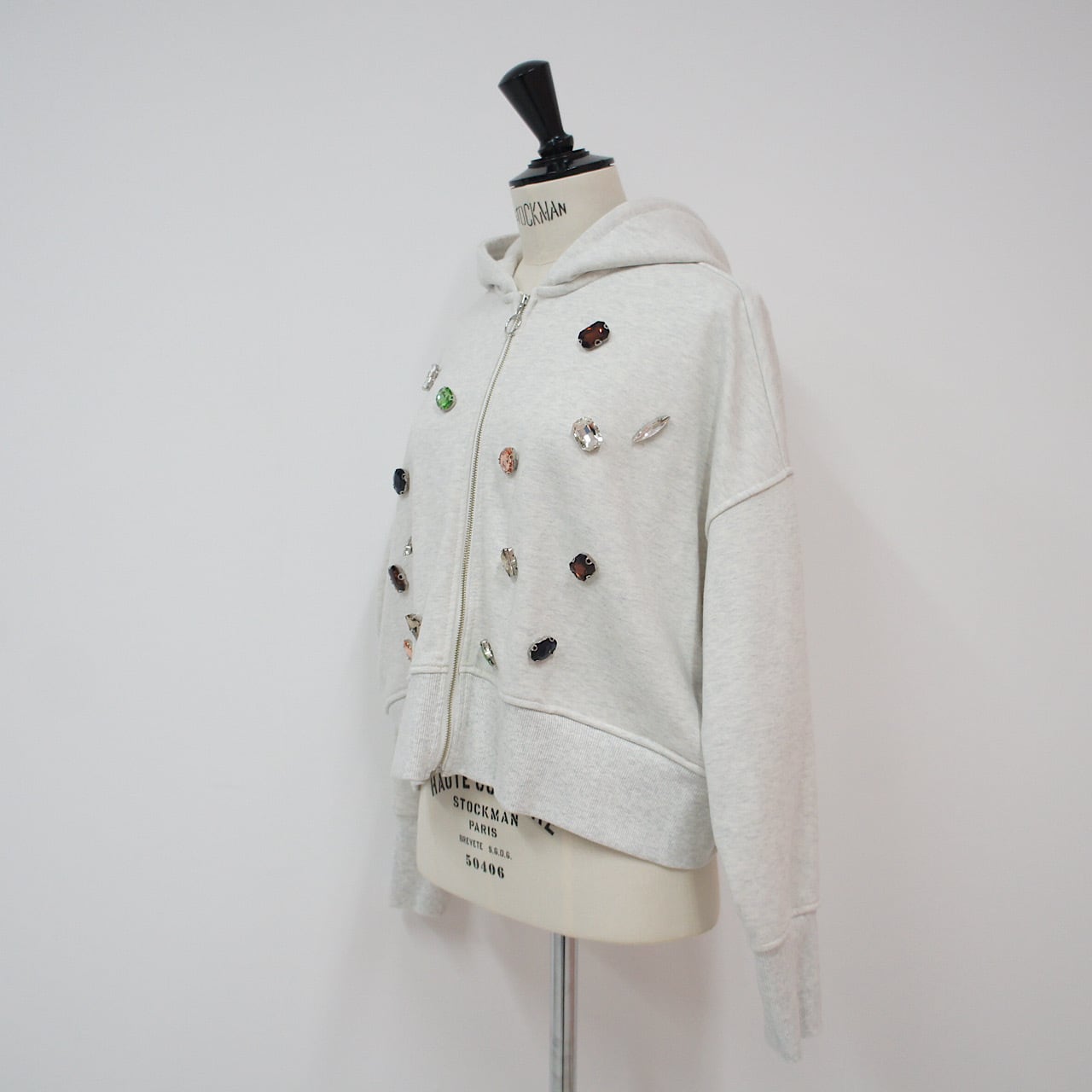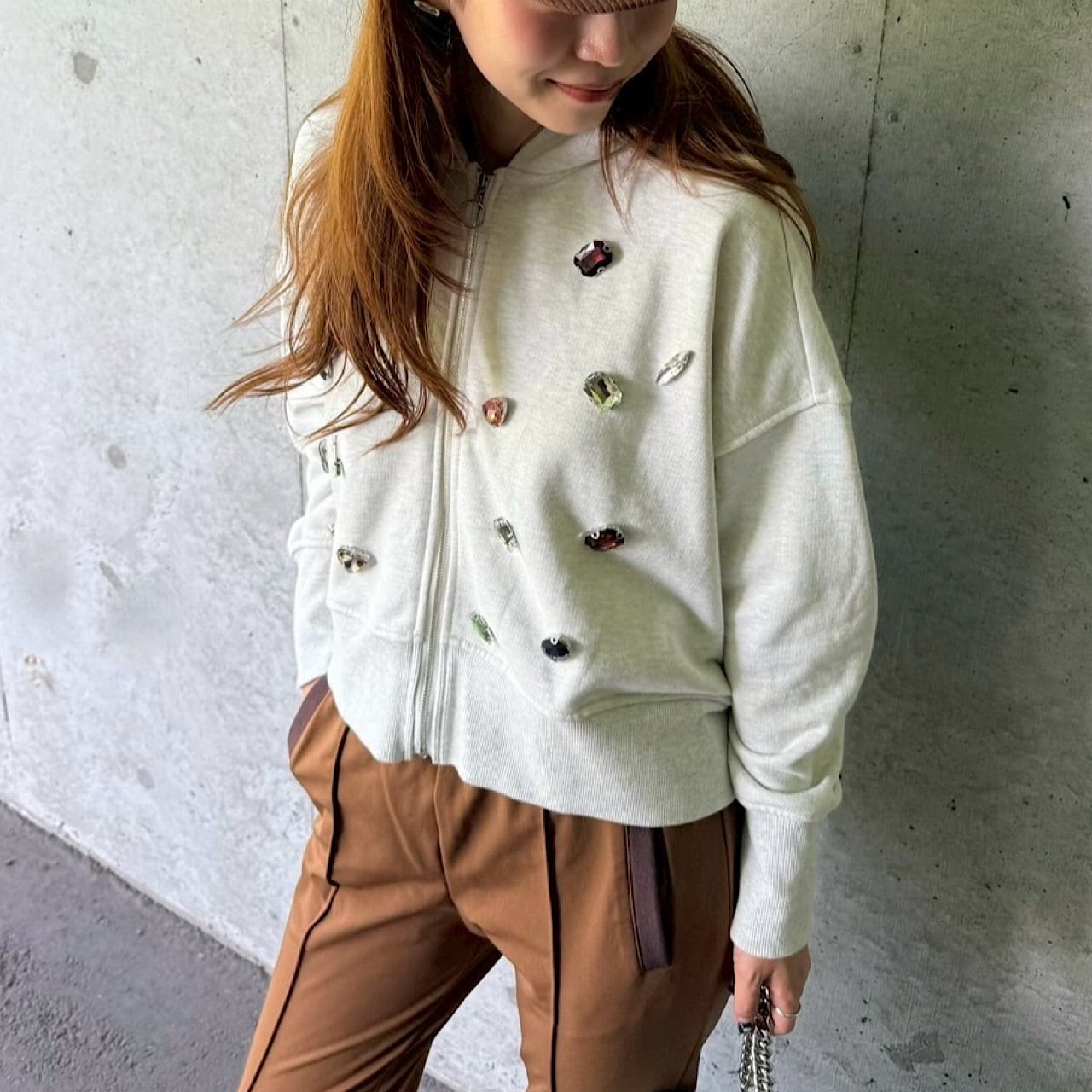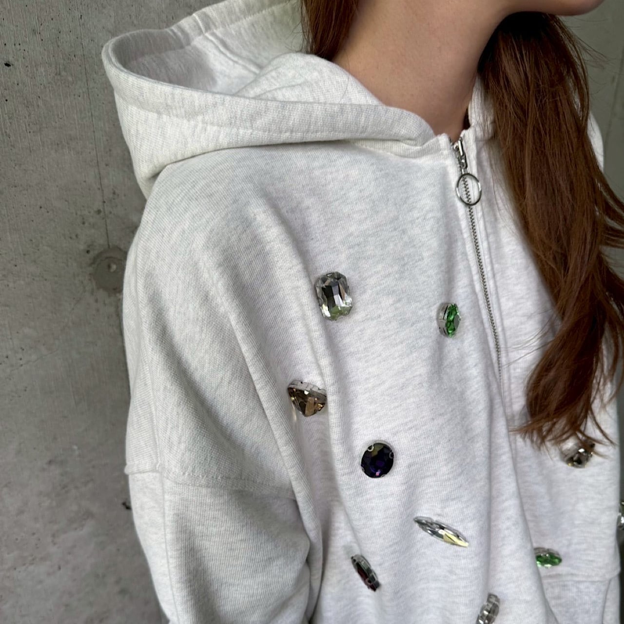柔らかなスウェット生地に宝石のようなビジューを散りばめたパーカー。
