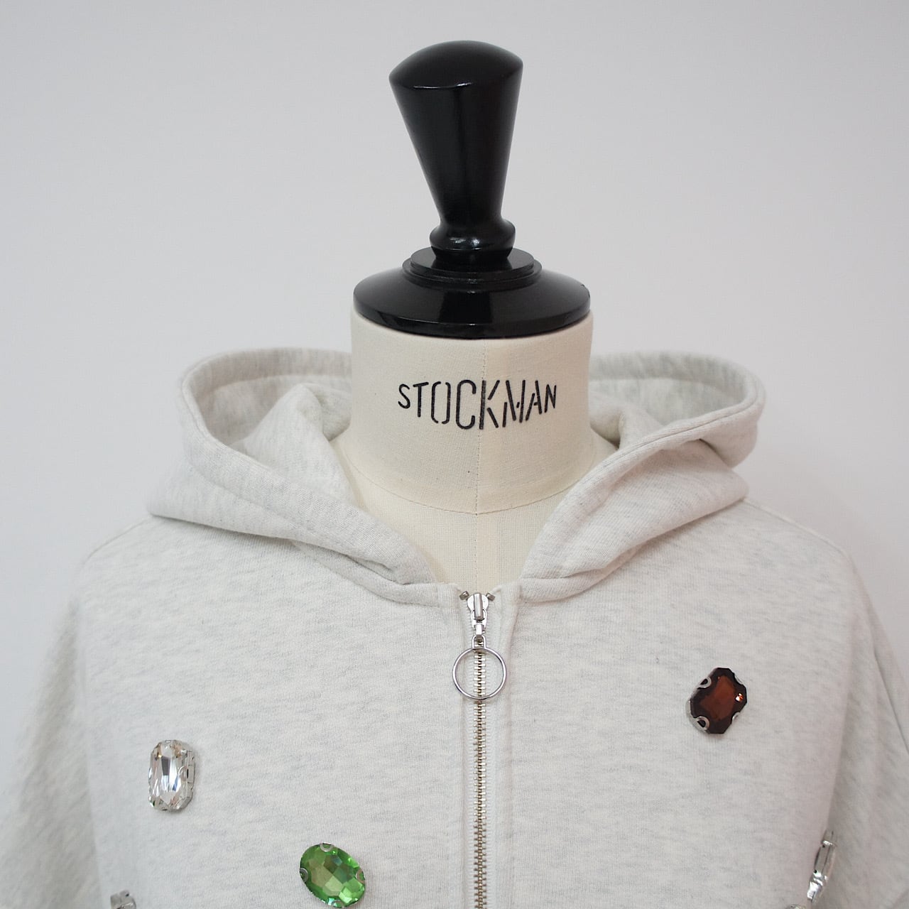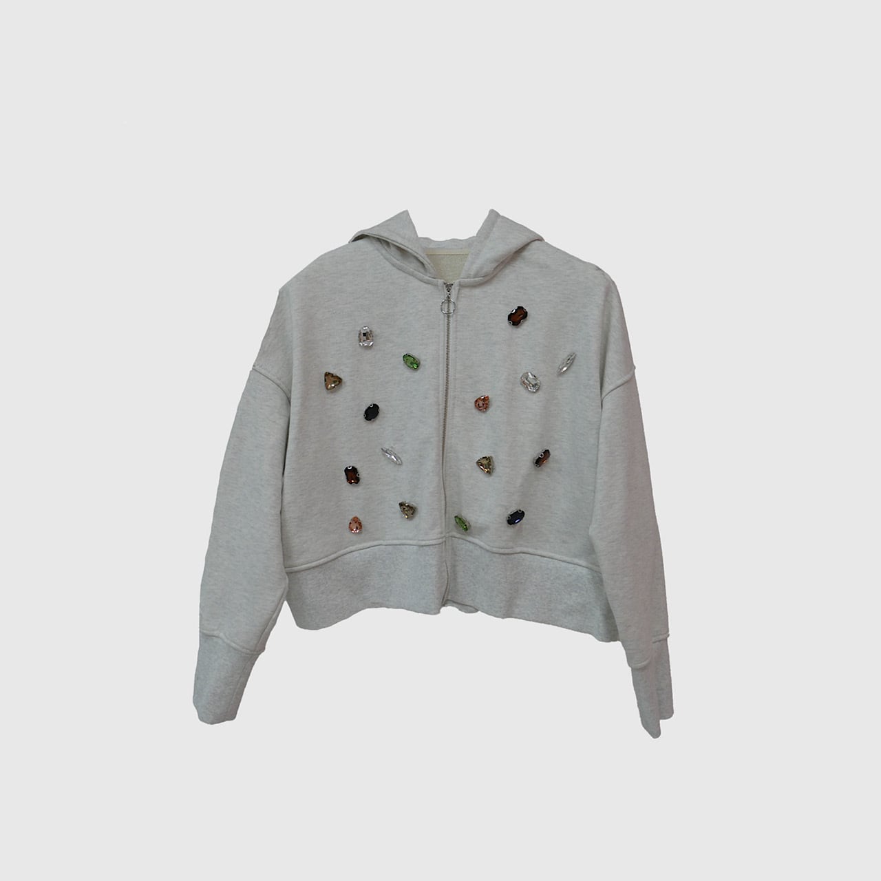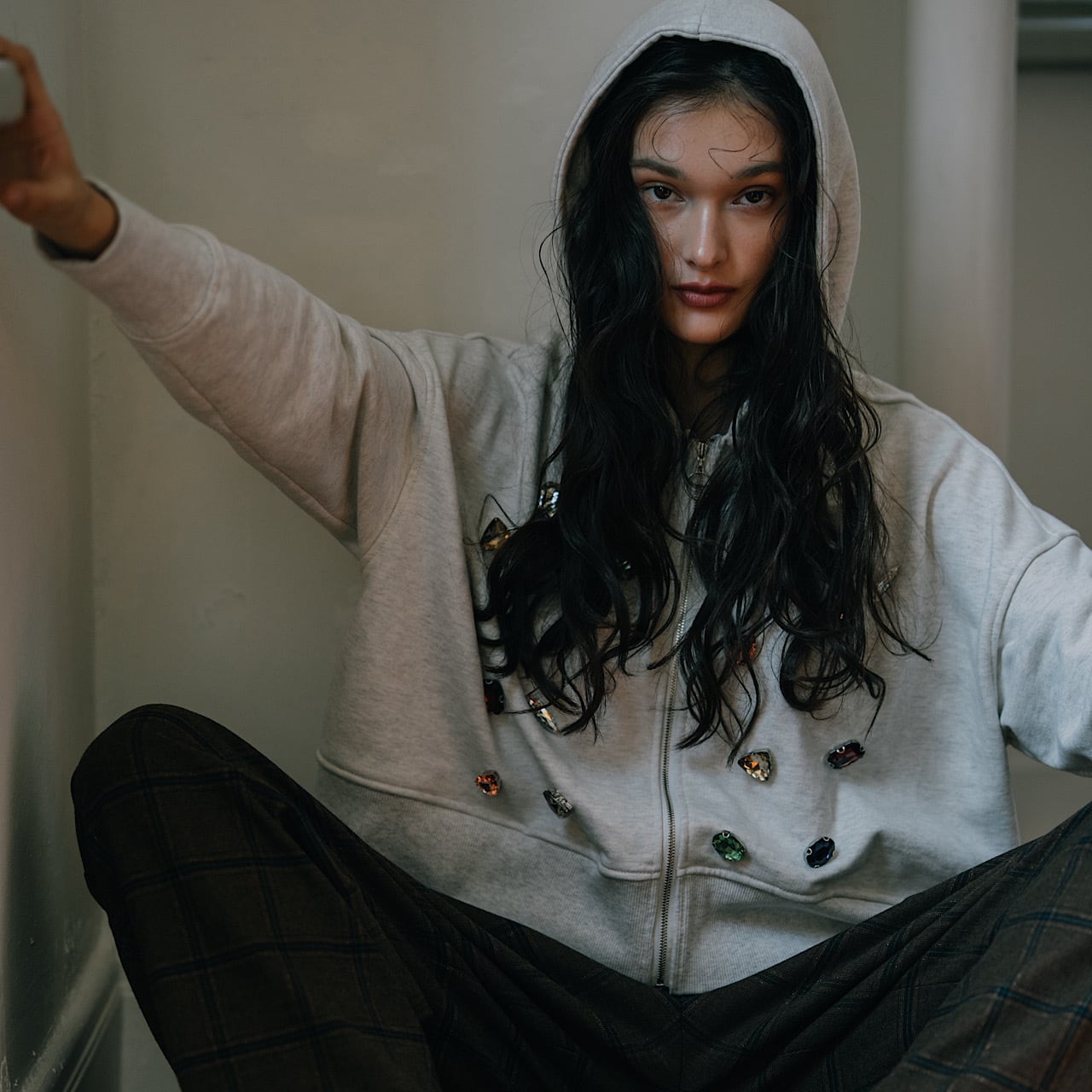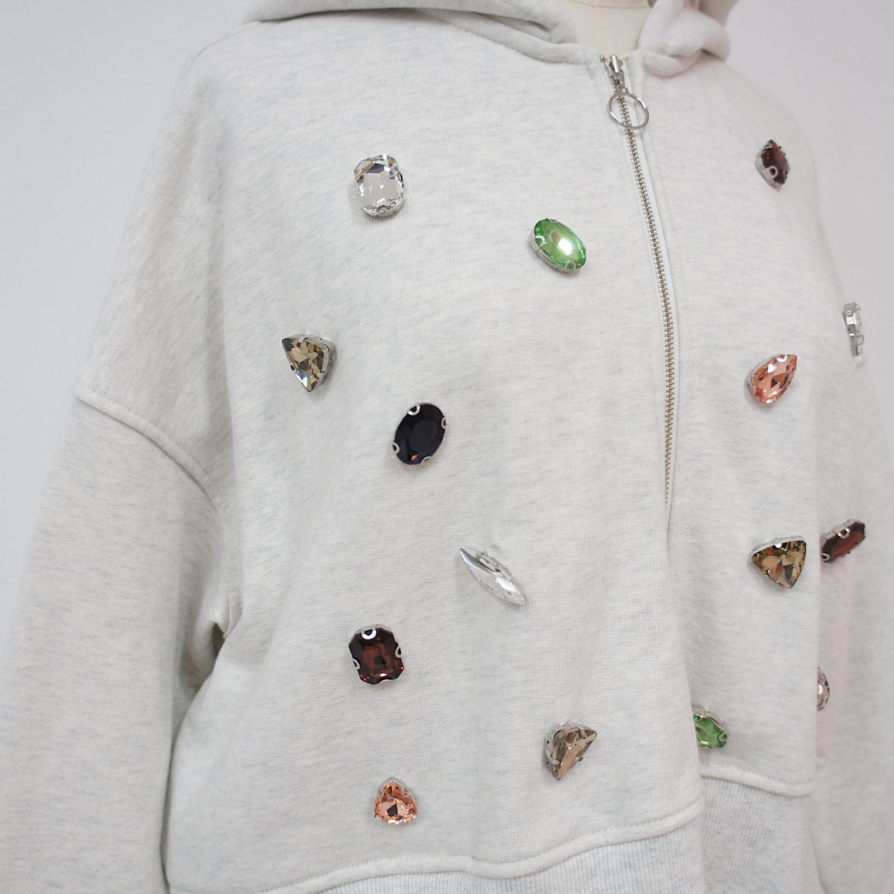 柔らかなスウェット生地に宝石のようなビジューを散りばめたパーカー。