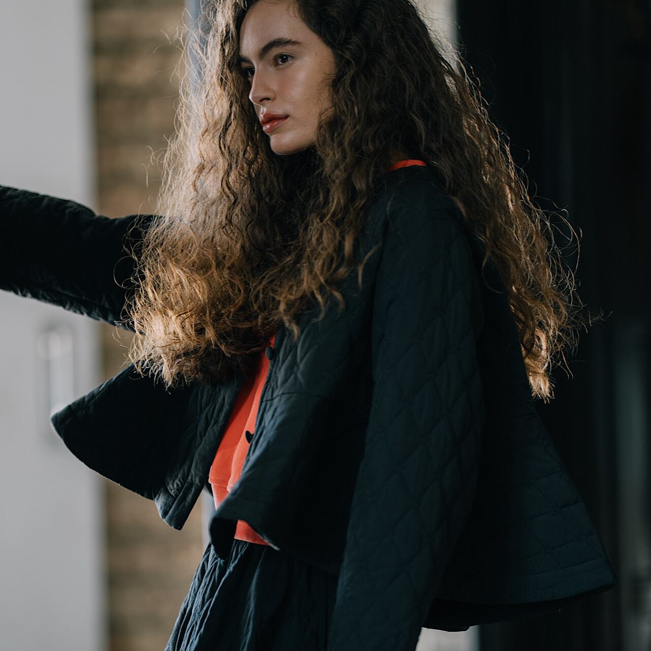 ワンピースやパンツスタイルにも合わせやすいアウターです。