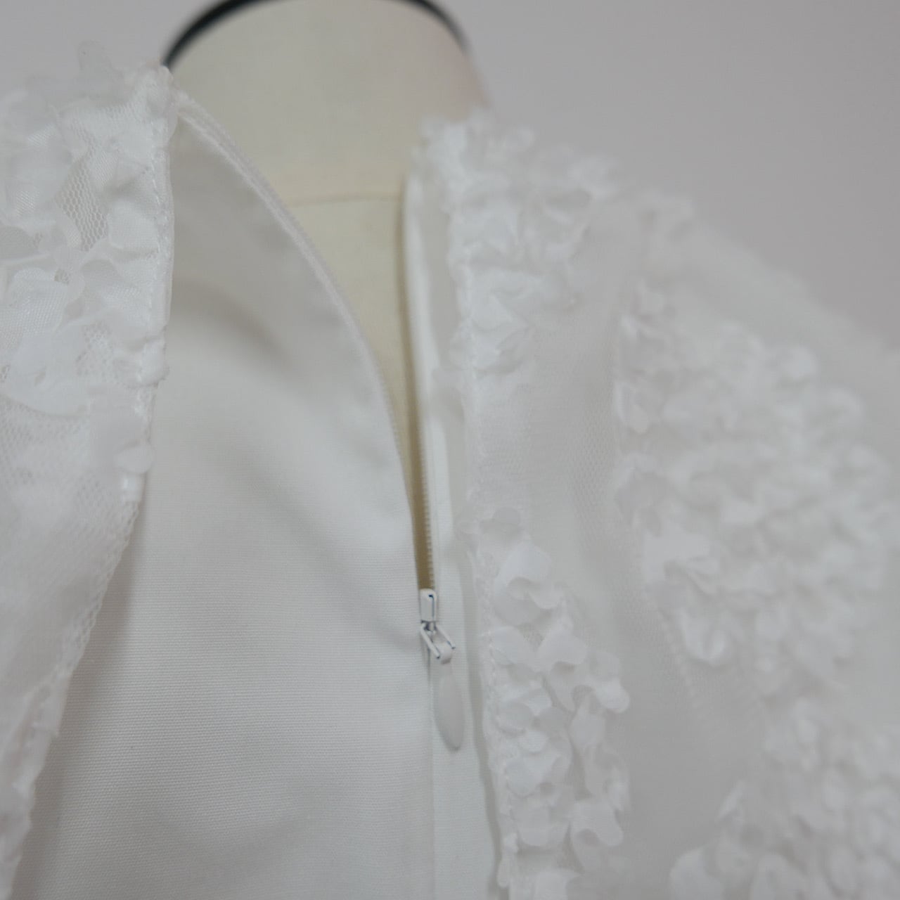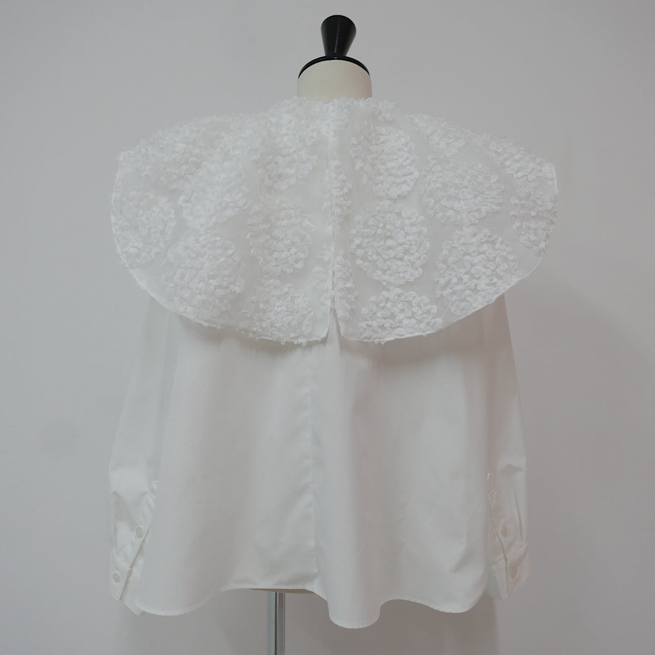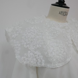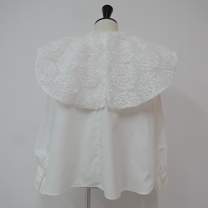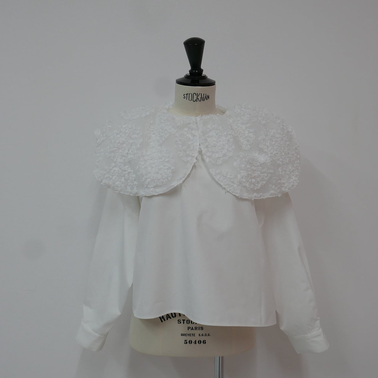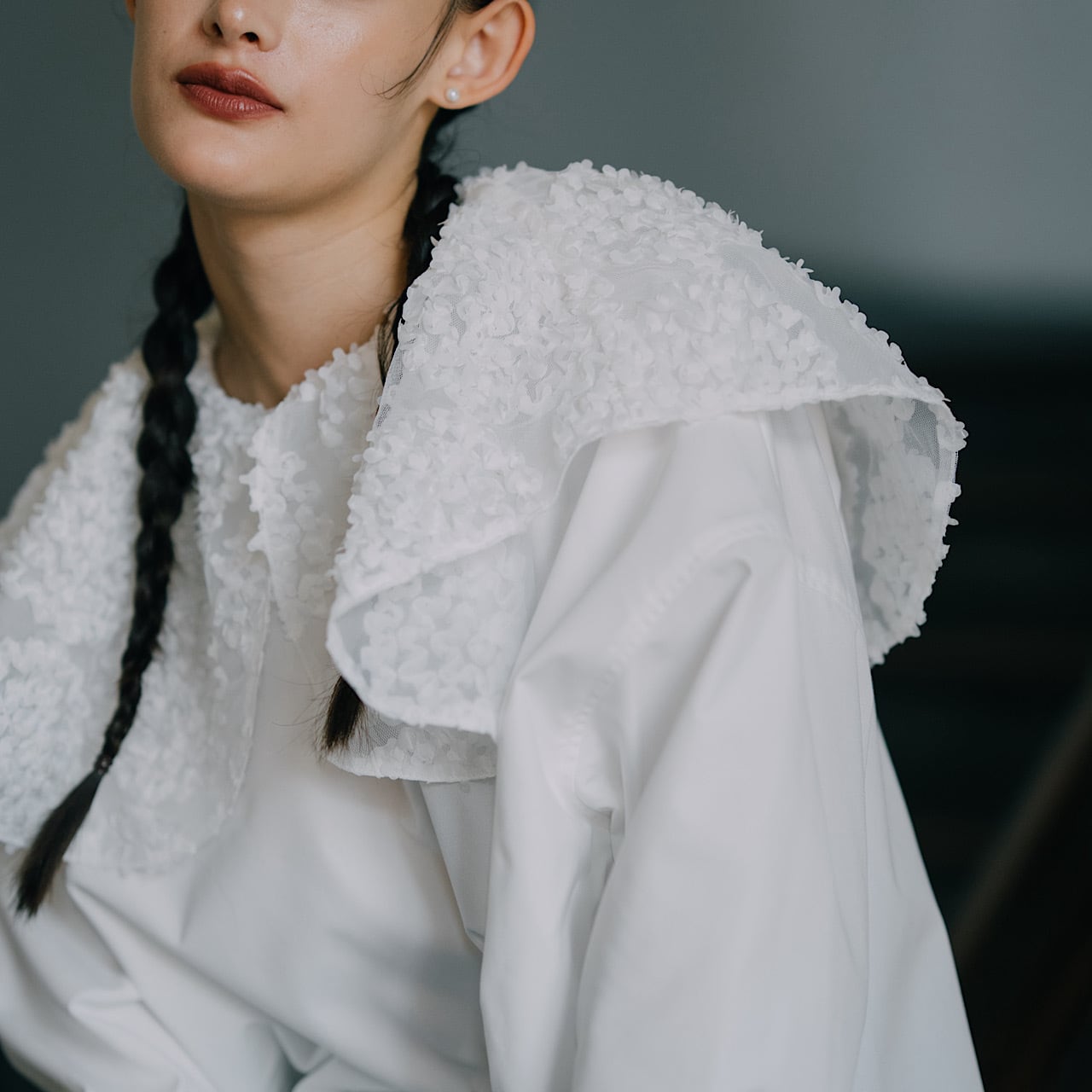 襟の表側は立体感のあるレース、裏側がオーガンジーと2枚仕立てにたっぷりの生地を使用したエレガントな主役級のブラウス。