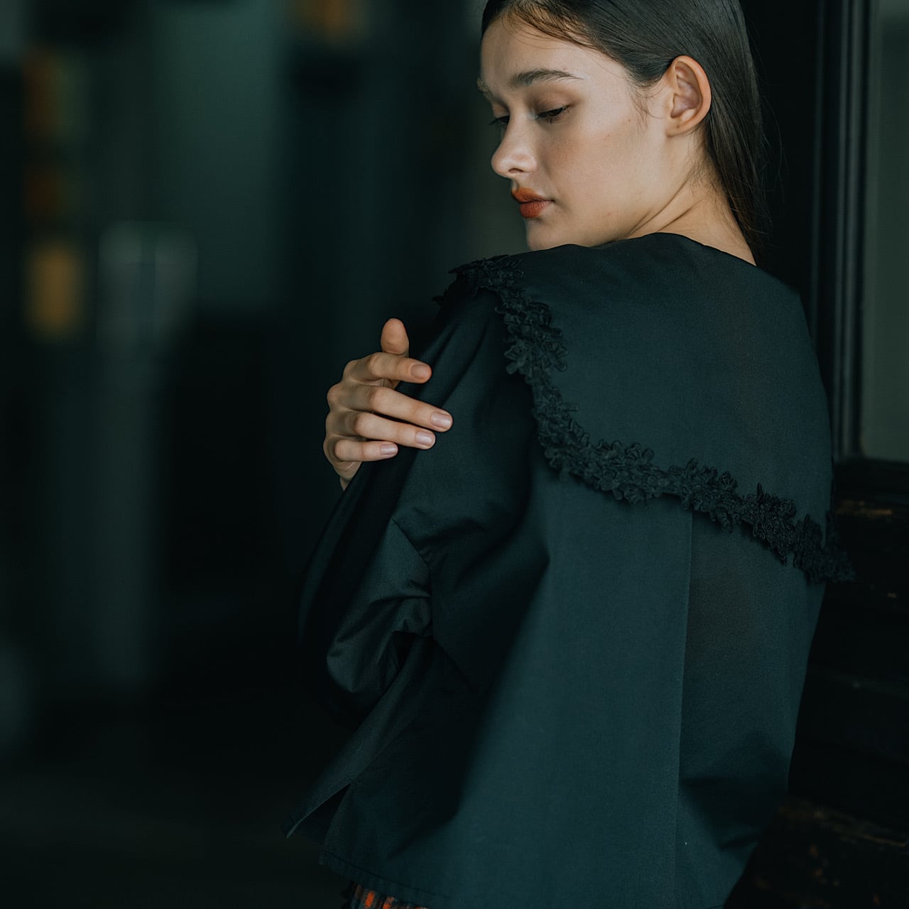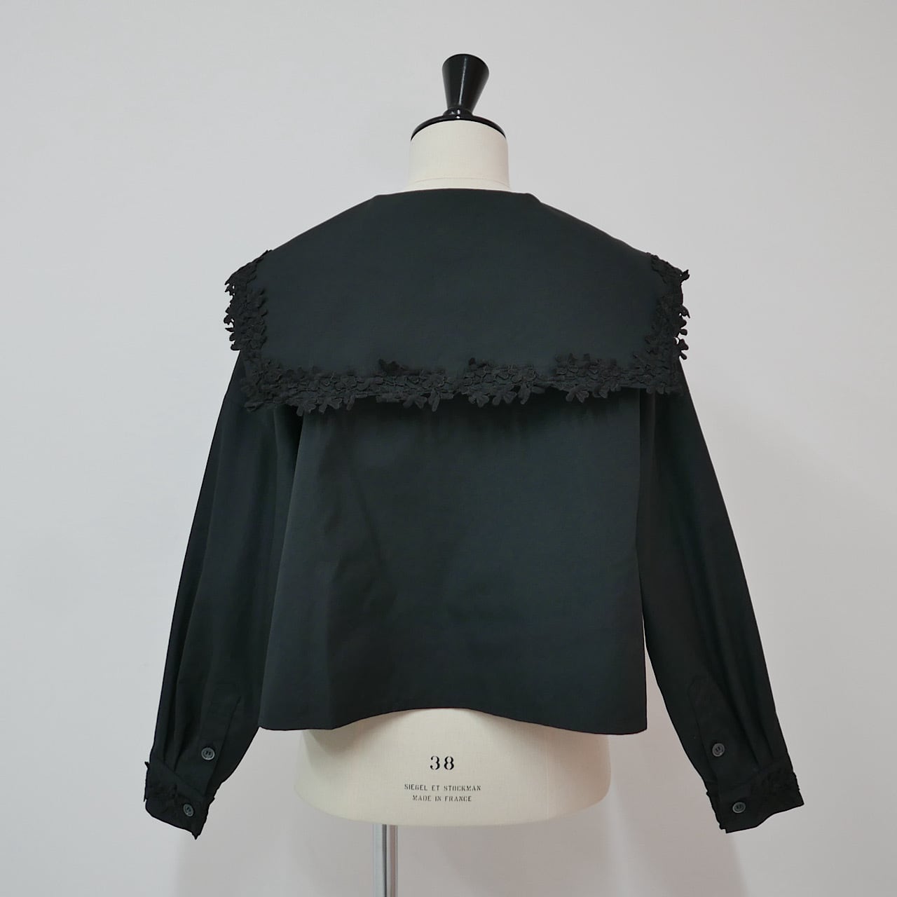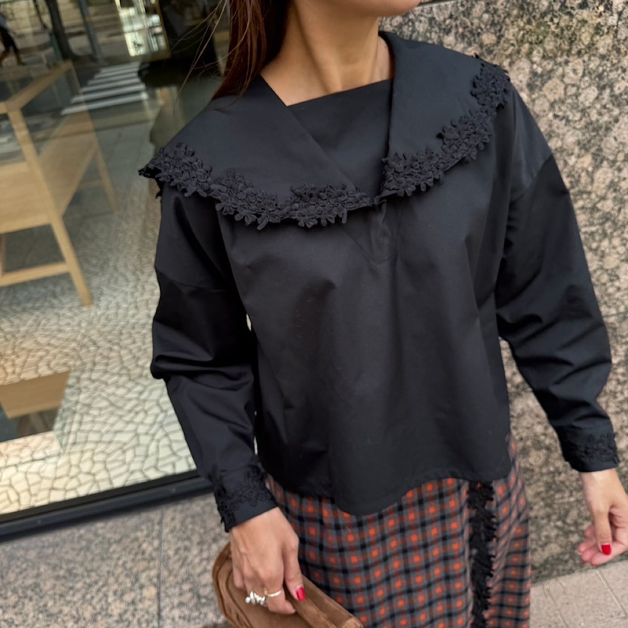 清楚でクラッシックな印象のセーラー襟に上品なレースを施したブラウス。袖口にも上品なレースを。長すぎない丈でどんなボトムスとも相性◎