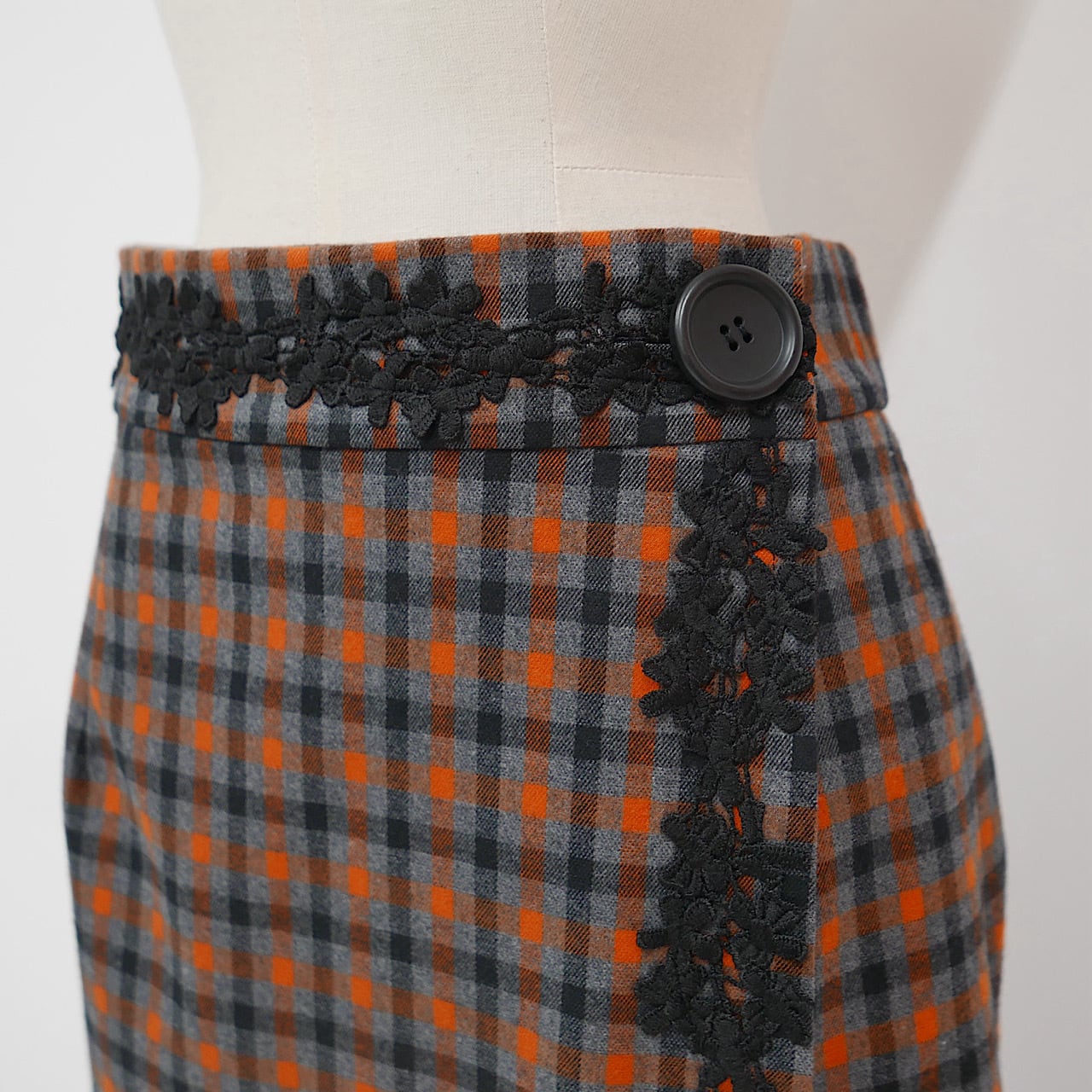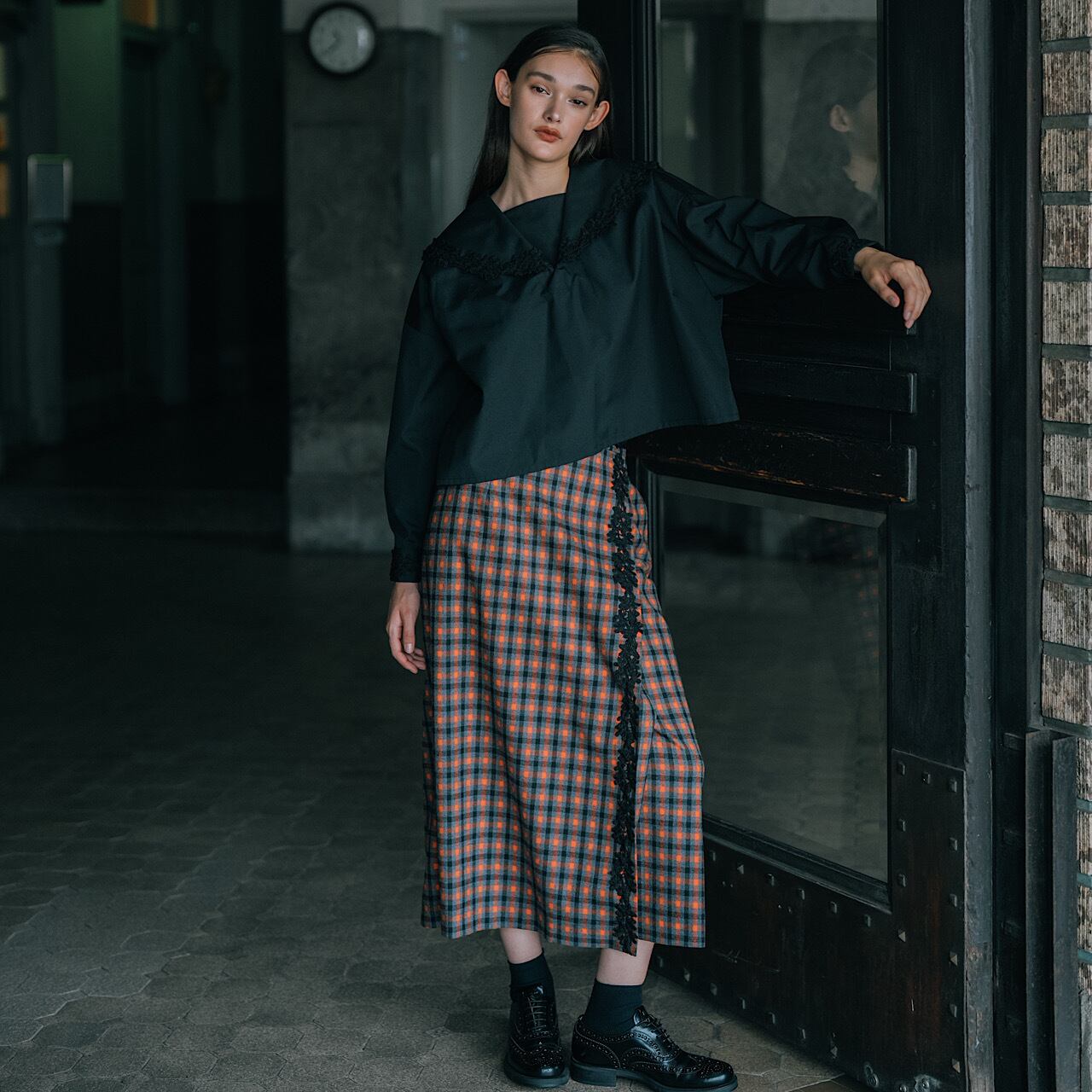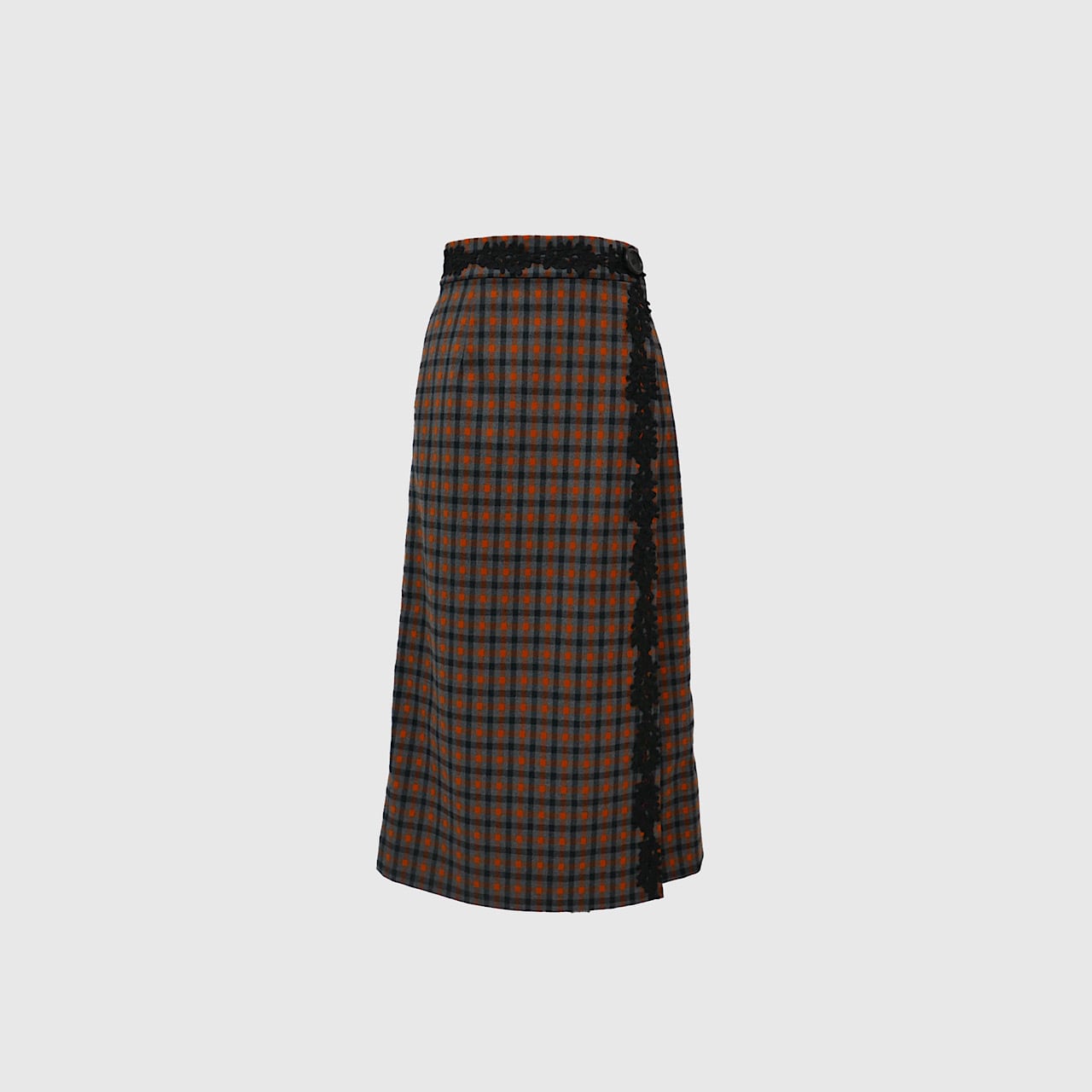 ミモレ丈のラップスカート。動きやすさにも重視したデザインでウエスト後ろ部分はゴム。上品なレースを施し、レトロでクラッシックな印象に仕上げてくれる。トップス次第でコーディネートの幅が広がる。