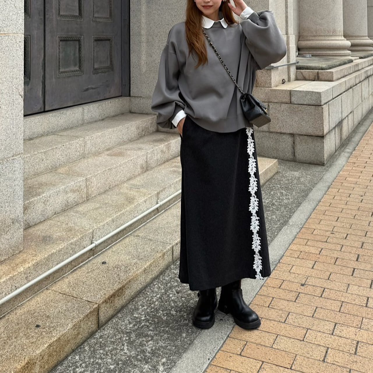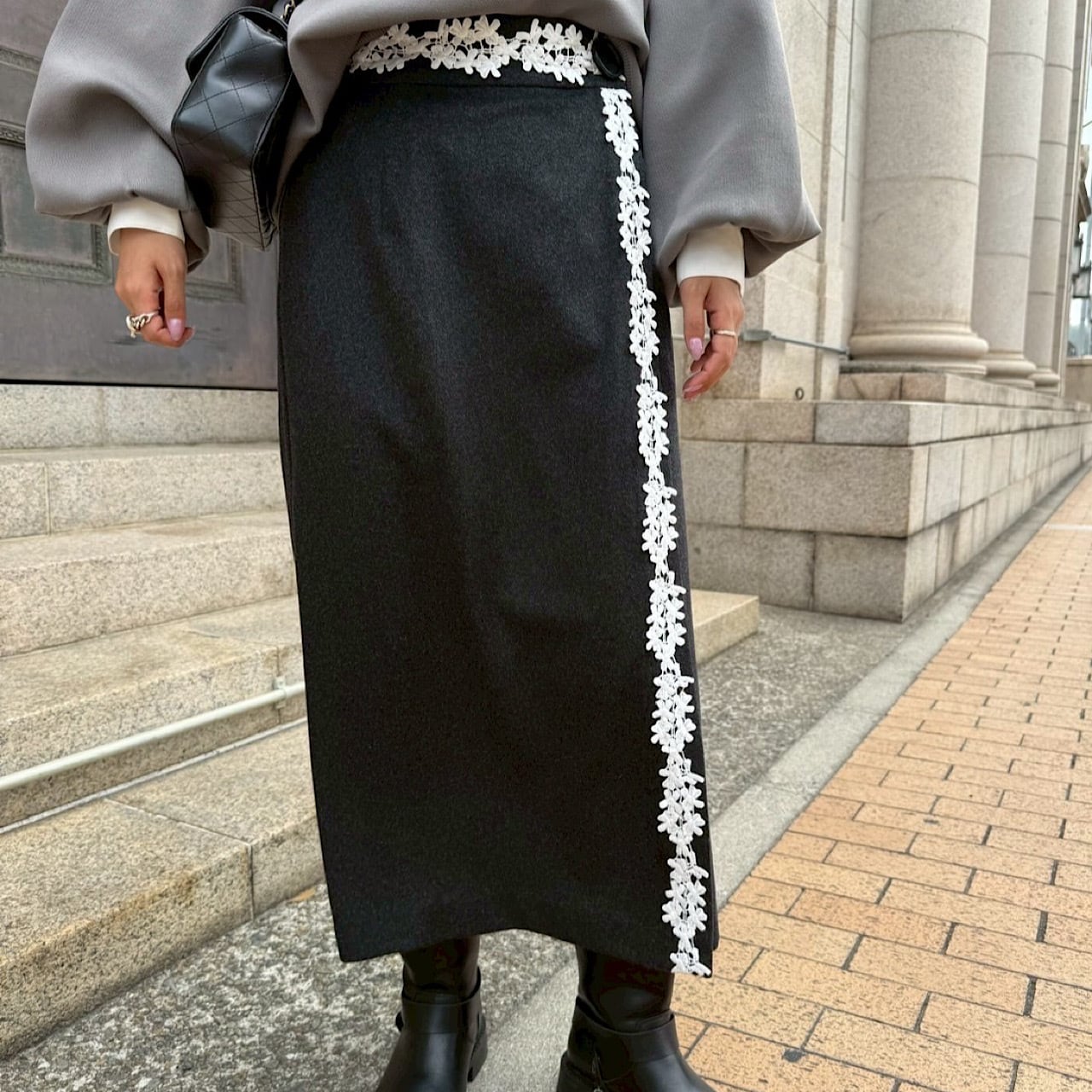 ミモレ丈のラップスカート。動きやすさにも重視したデザインでウエスト後ろ部分はゴム。上品なレースを施し、レトロでクラッシックな印象に仕上げてくれる。トップス次第でコーディネートの幅が広がる。