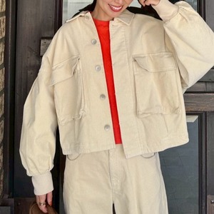 コーデュロイ生地のメンズライクなジャケット。大きめのポケットマットなボタンをアクセントにした、タック入りの丸みを帯びたシルエット。袖口のリブが女性らしさも加えてくれる。