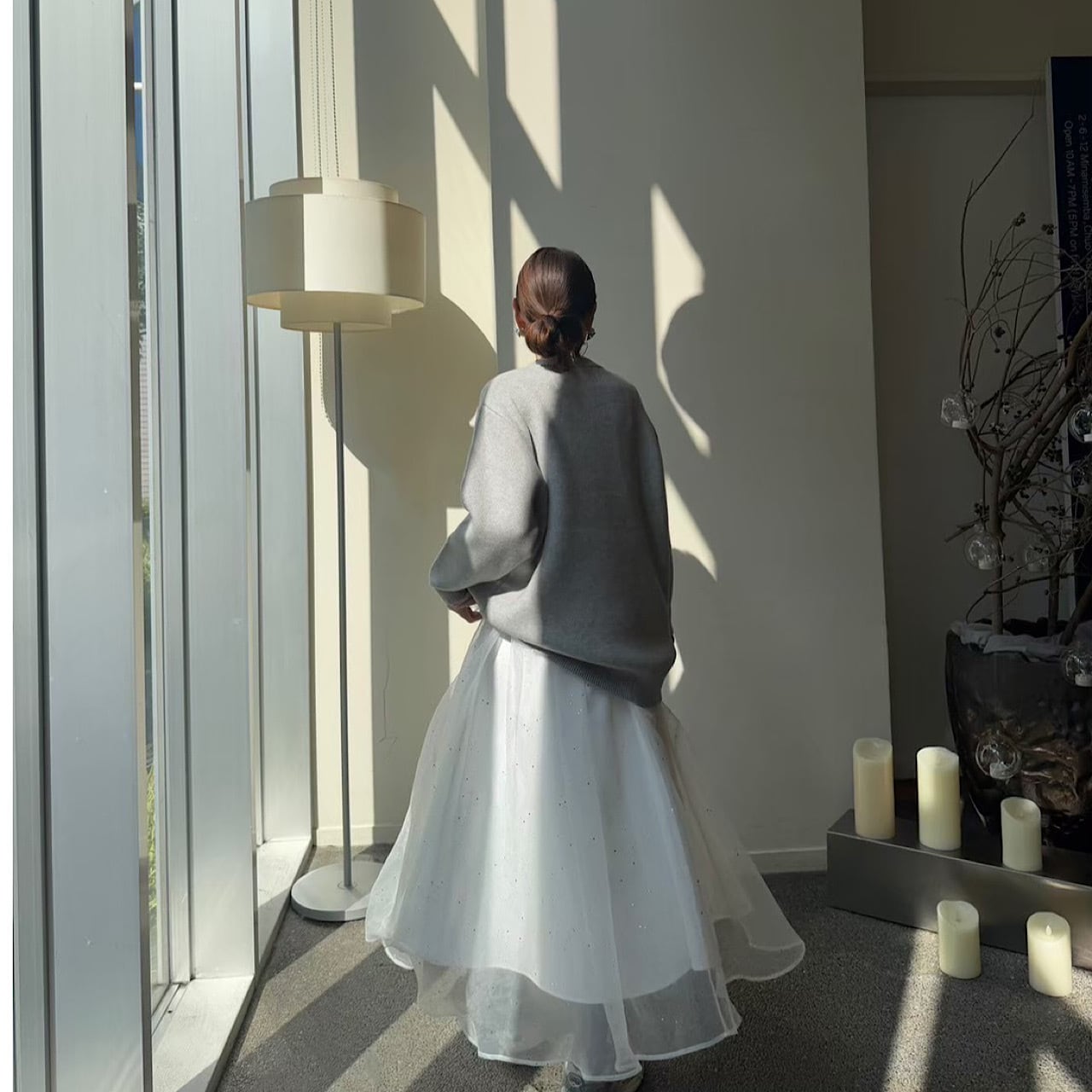 繊細な何色もの色味のラメを施した一枚。主張しすぎない輝きが特徴のオーガンジーを重ねた華やかで上品なスカート。