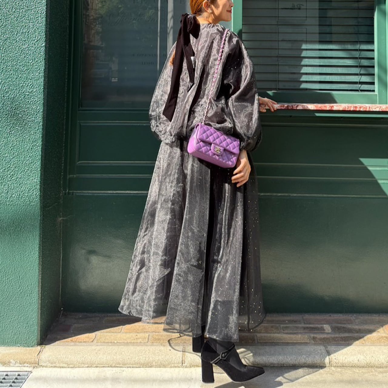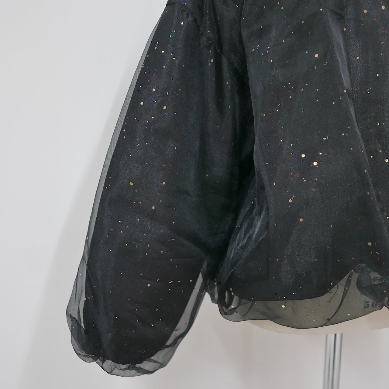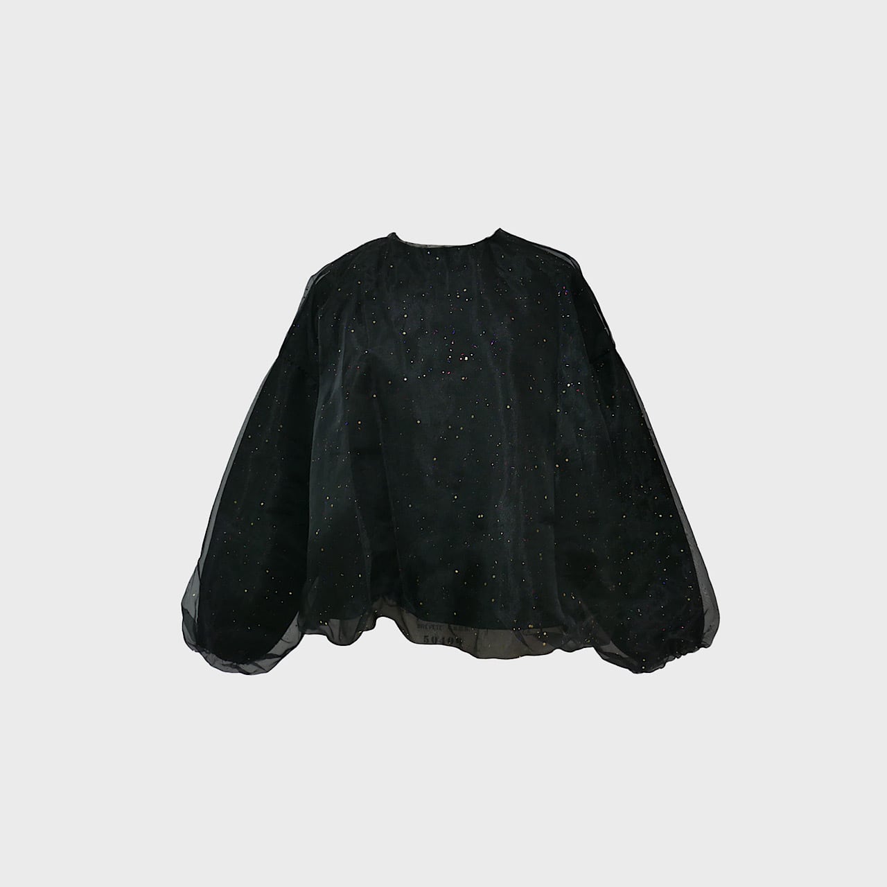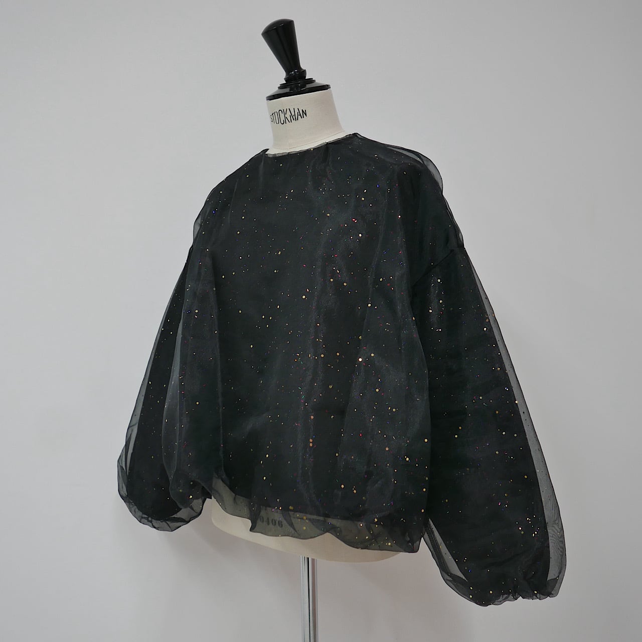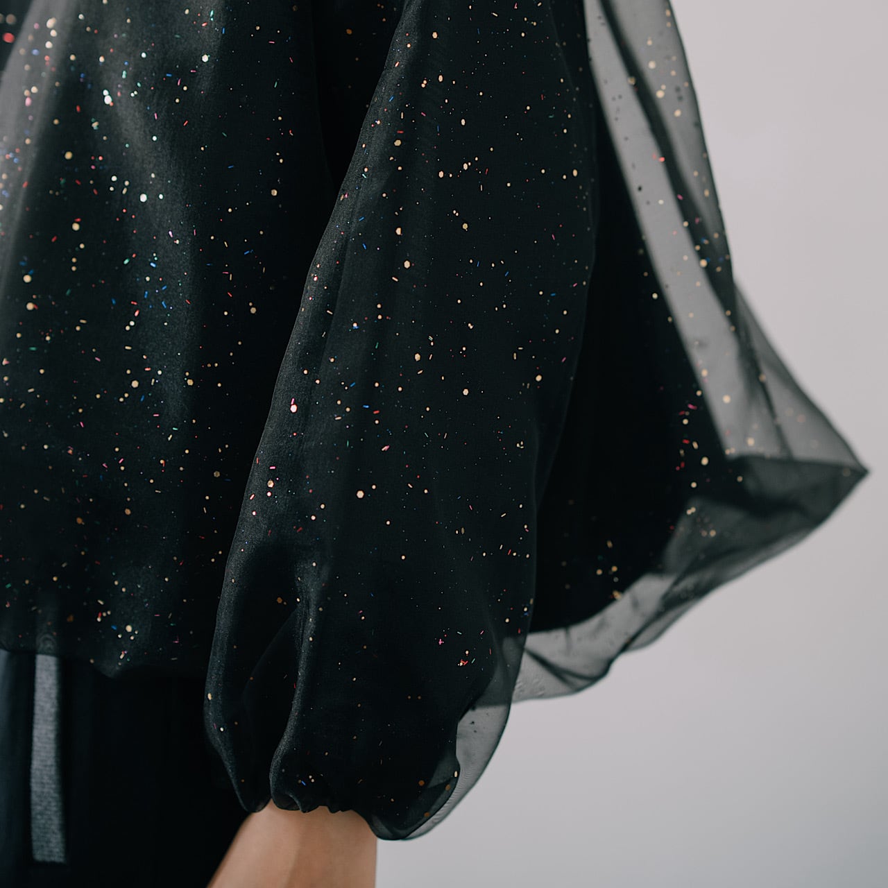 繊細な何色もの色味のラメを施した一枚。主張しすぎない輝きが特徴のオーガンジーを重ねた華やかで上品なブラウスはこれからのシーズン出番が多そう。