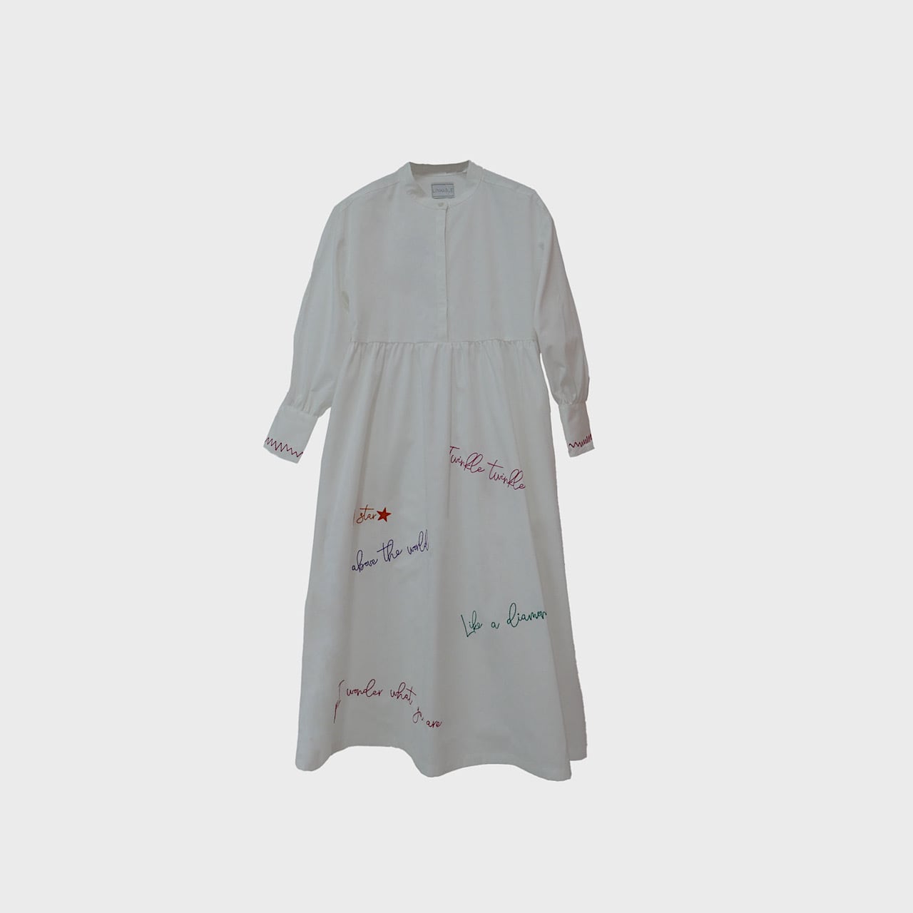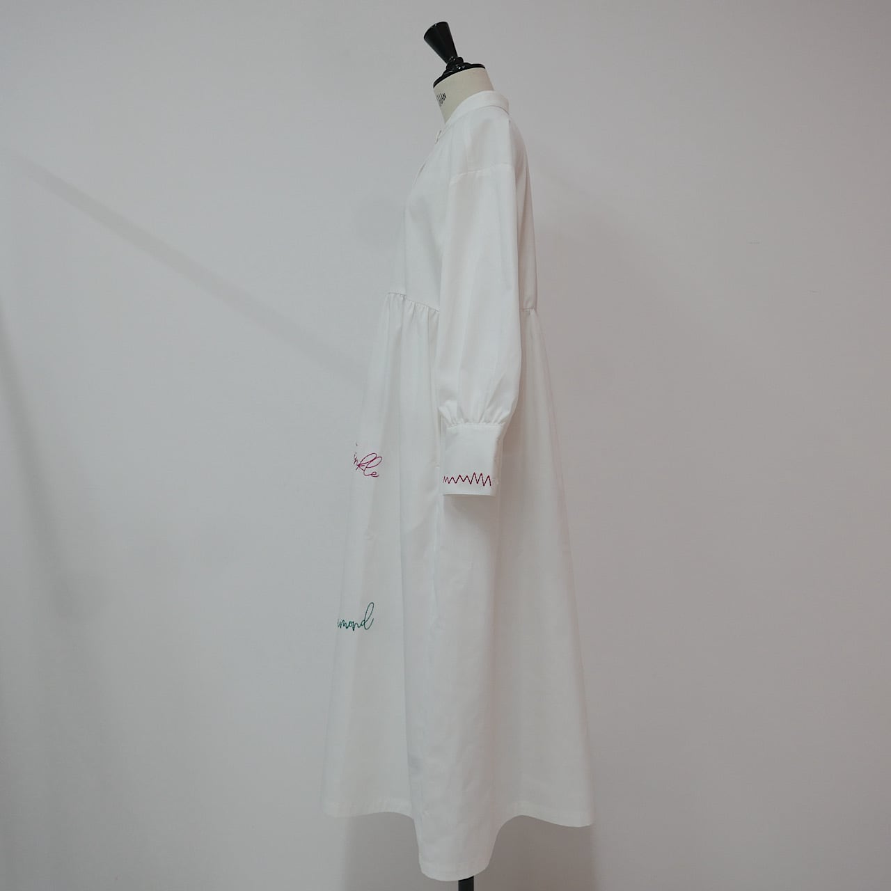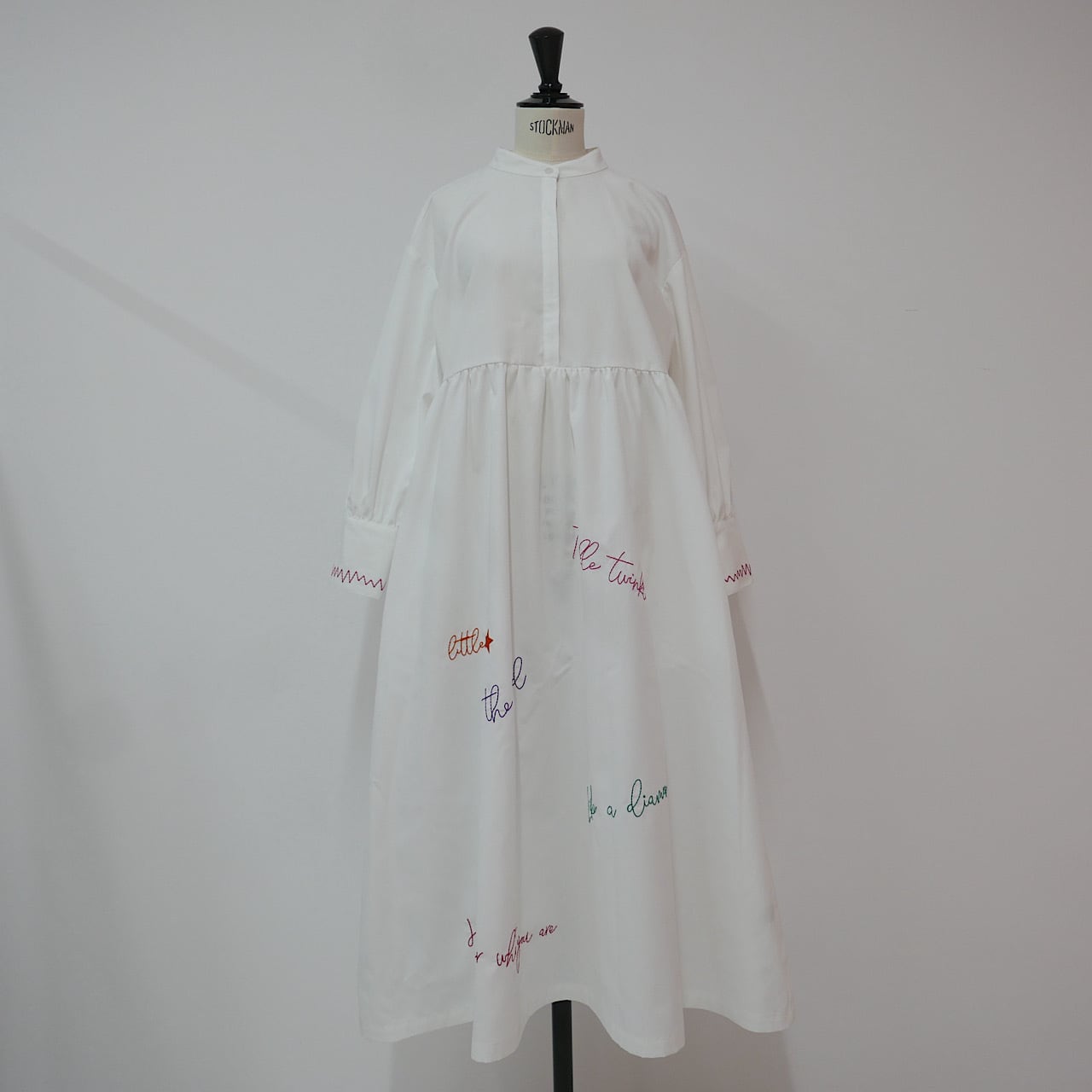 胸下切り替えのノーカラーなシンプルなシルエットのワンピースにカラフルな糸で刺繍を施したワンピース。