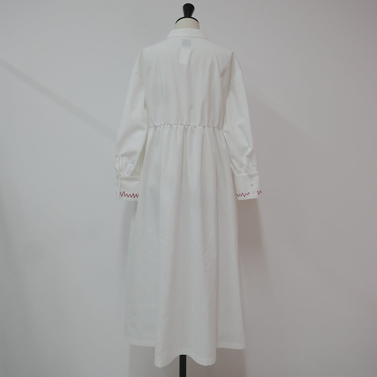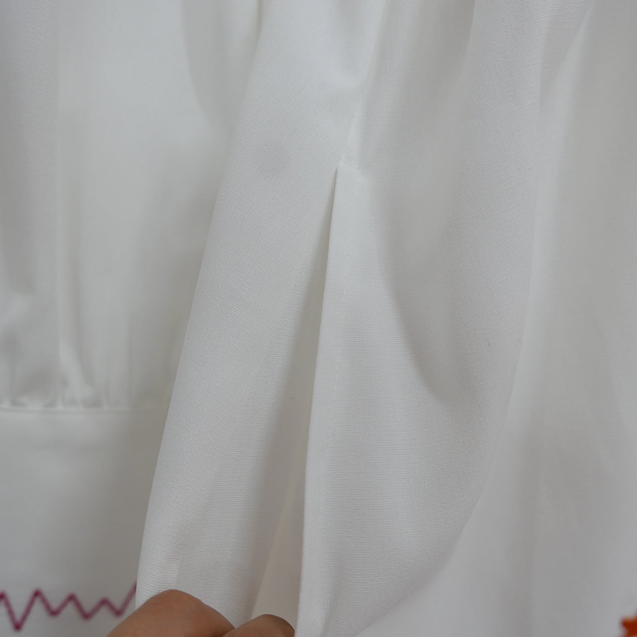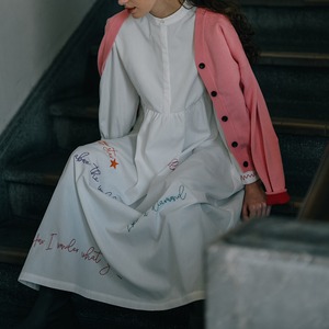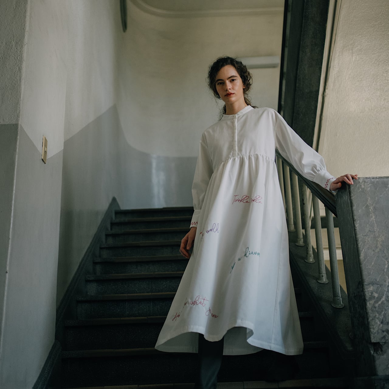胸下切り替えのノーカラーなシンプルなシルエットのワンピースにカラフルな糸で刺繍を施したワンピース。