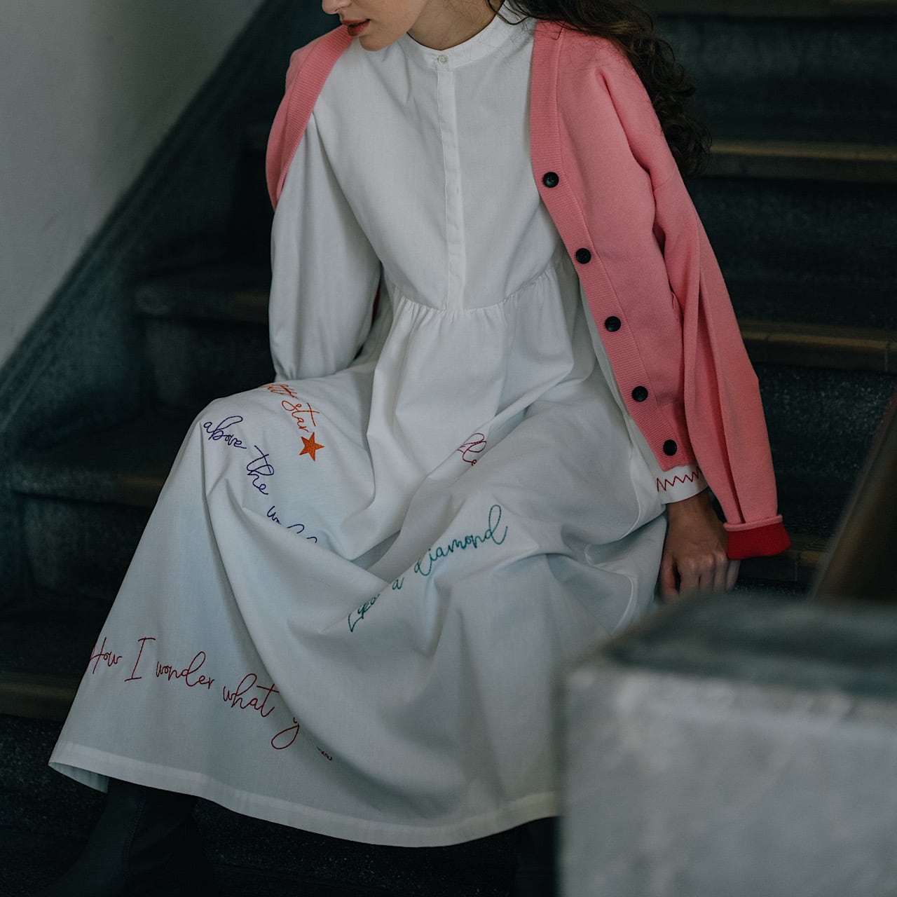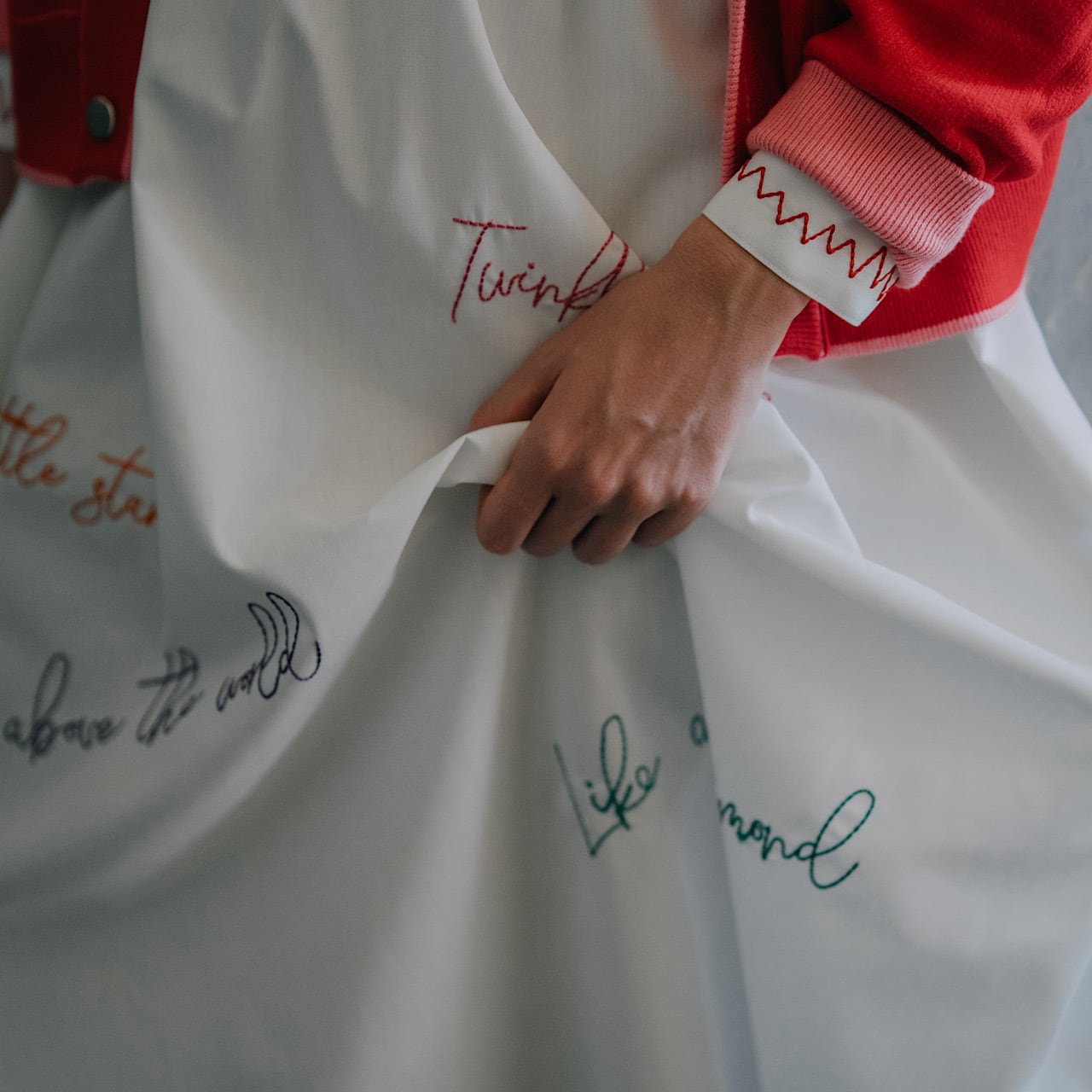 刺繍は「Twinkle twinkle little star」。誰もが知ってる歌詞を入れて遊び心も忘れずに。見にまとうと心が弾む。そんな一枚に仕上げました。