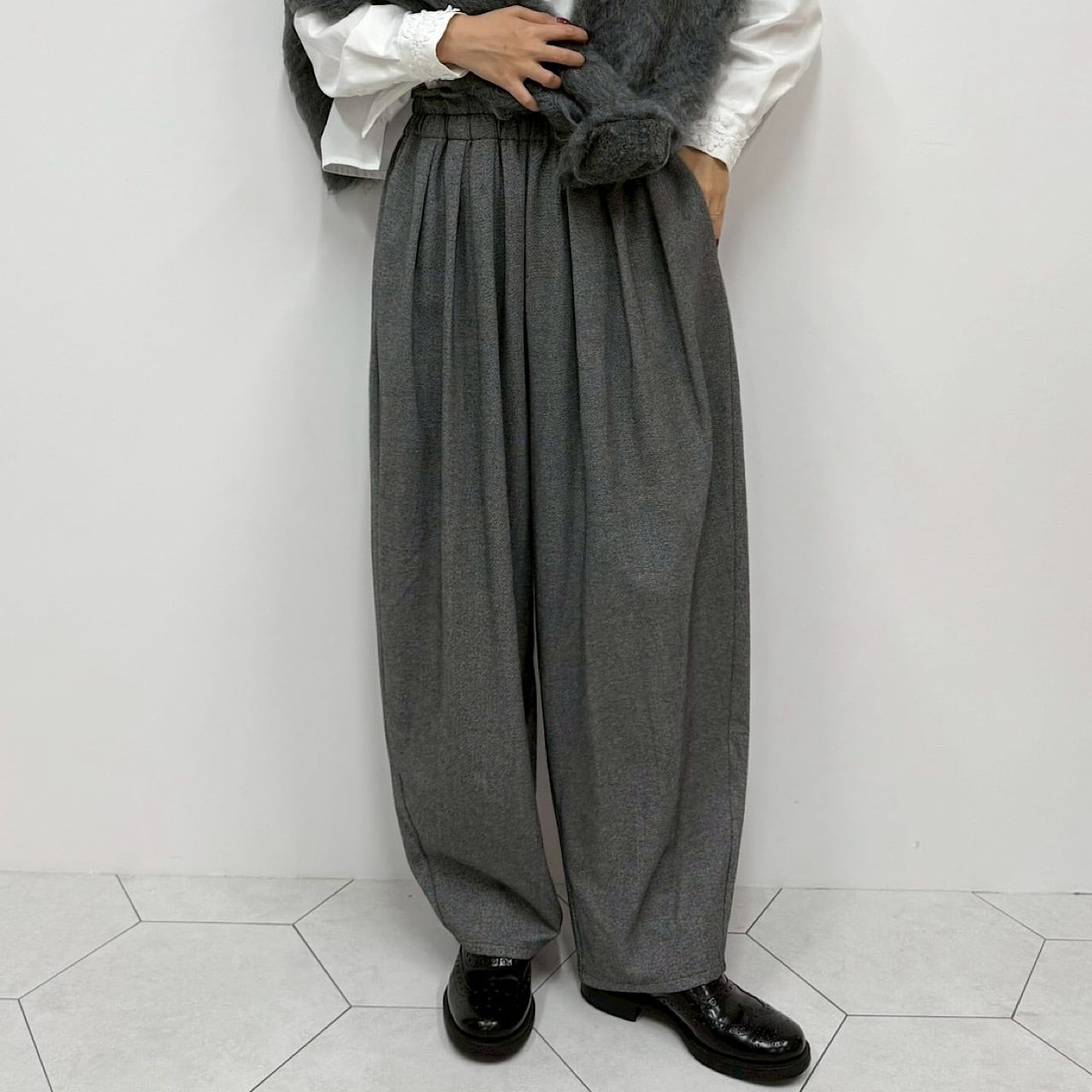 ストレスフリーで着用できる総ゴムのパンツ。ヒップ部分にゆとりのある丸みを帯びたコクーンシルエットはタックがあることで上品に着こなせる。シワになりにくいのも魅力的。