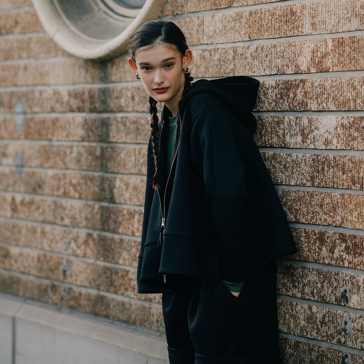 ボンディング生地のペプラムシルエットのパーカー。