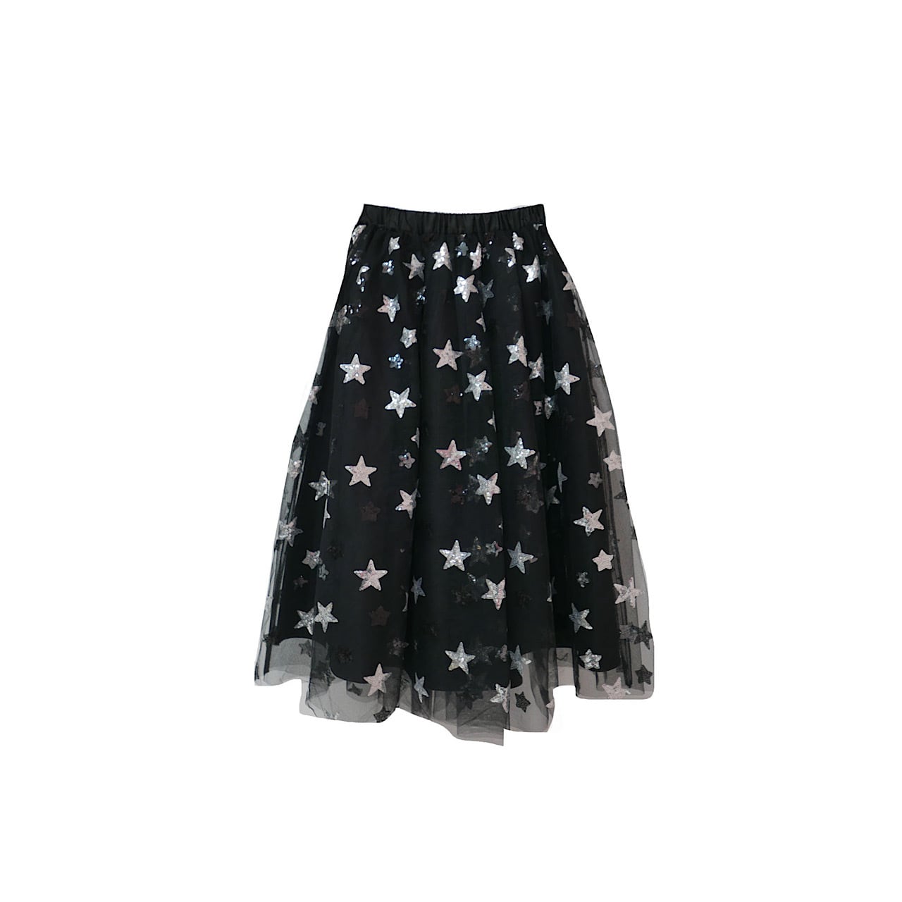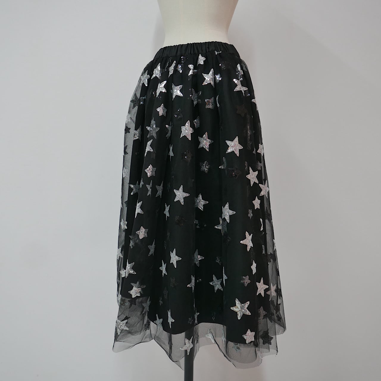 繊細で華やかなスパンコールの星のチュール生地を使用したスカート。2枚の生地を贅沢に使用した主役級の一枚。