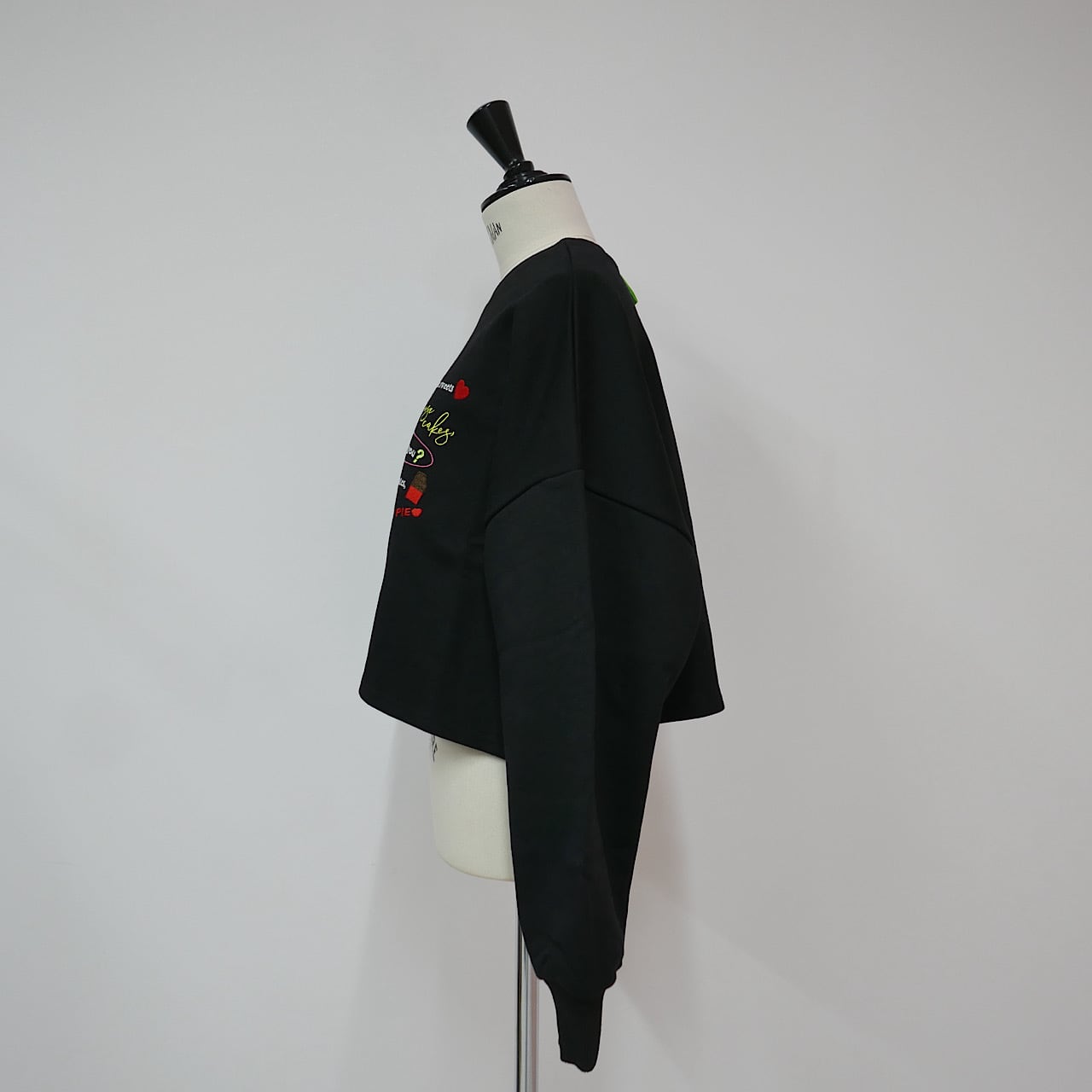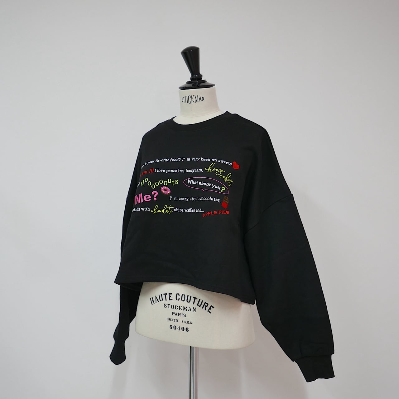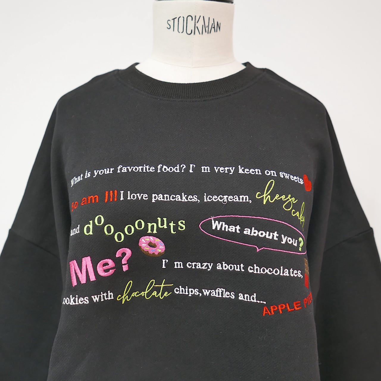 「どんなスイーツが好き?」から始まる何気ない日常のハッピーな会話が刺繍で描かれたスウェット。LINKABLEのアイコンであるカラーデザインタグをバックにON!