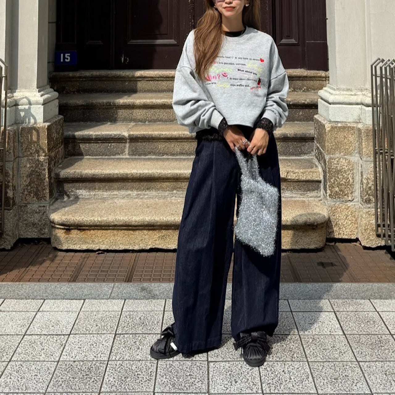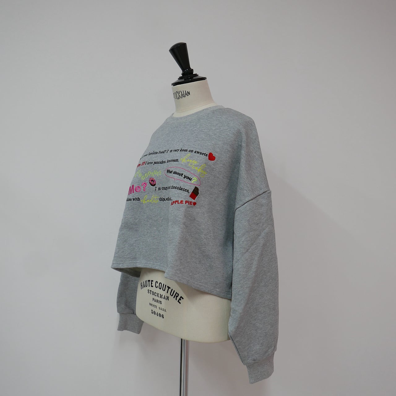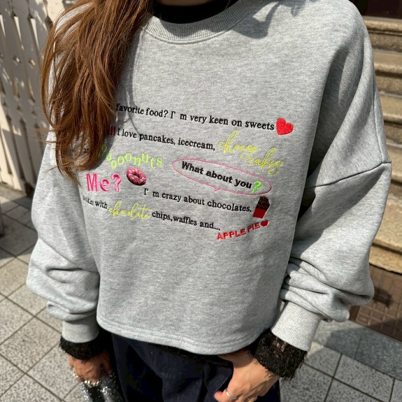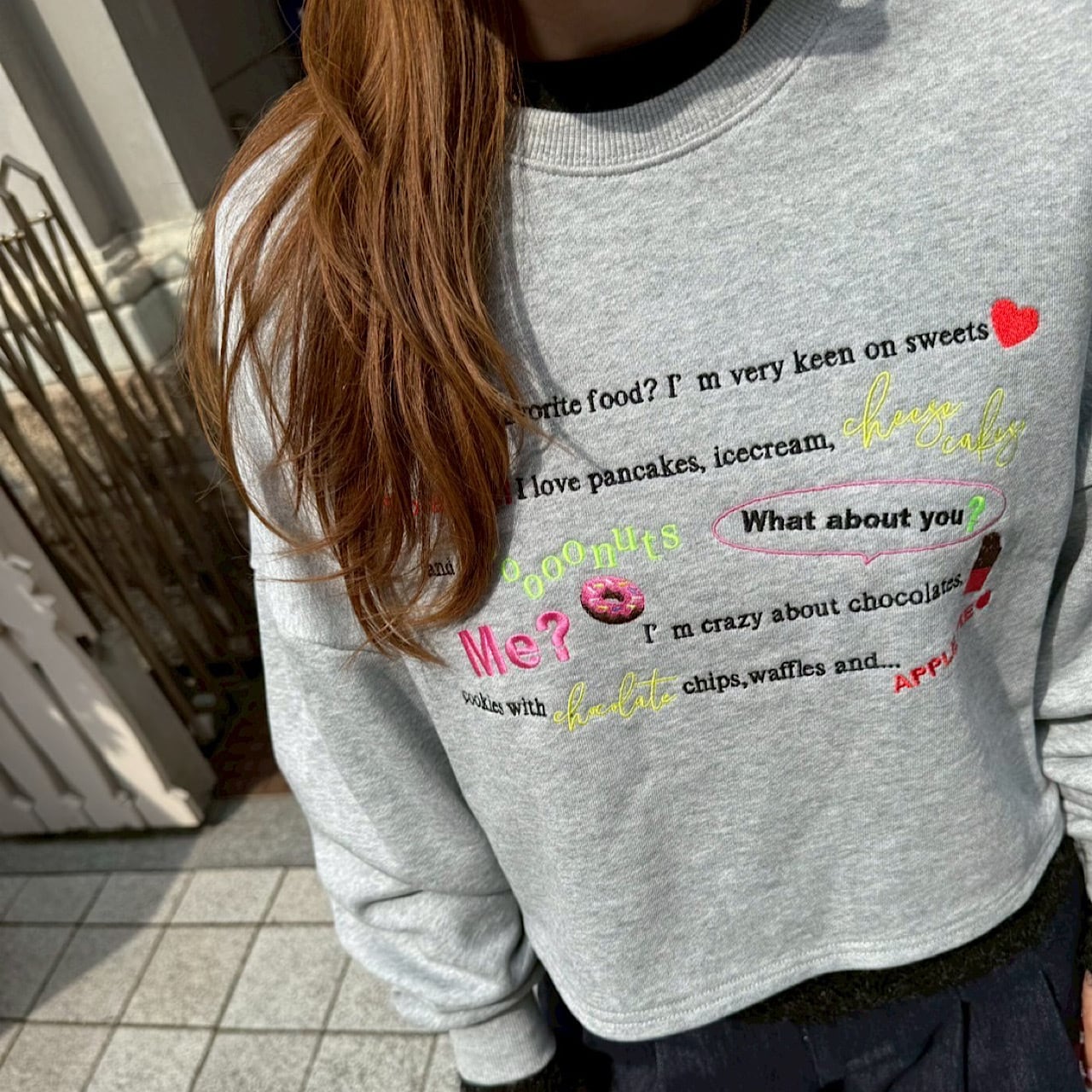 「どんなスイーツが好き?」から始まる何気ない日常のハッピーな会話が刺繍で描かれたスウェット。LINKABLEのアイコンであるカラーデザインタグをバックにON!