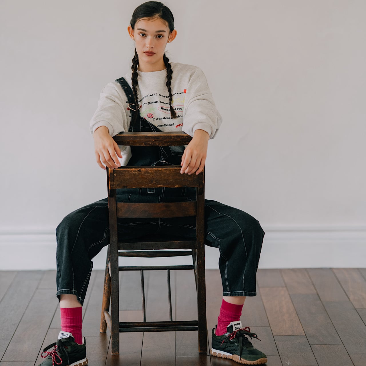 「どんなスイーツが好き?」から始まる何気ない日常のハッピーな会話が刺繍で描かれたスウェット。LINKABLEのアイコンであるカラーデザインタグをバックにON!