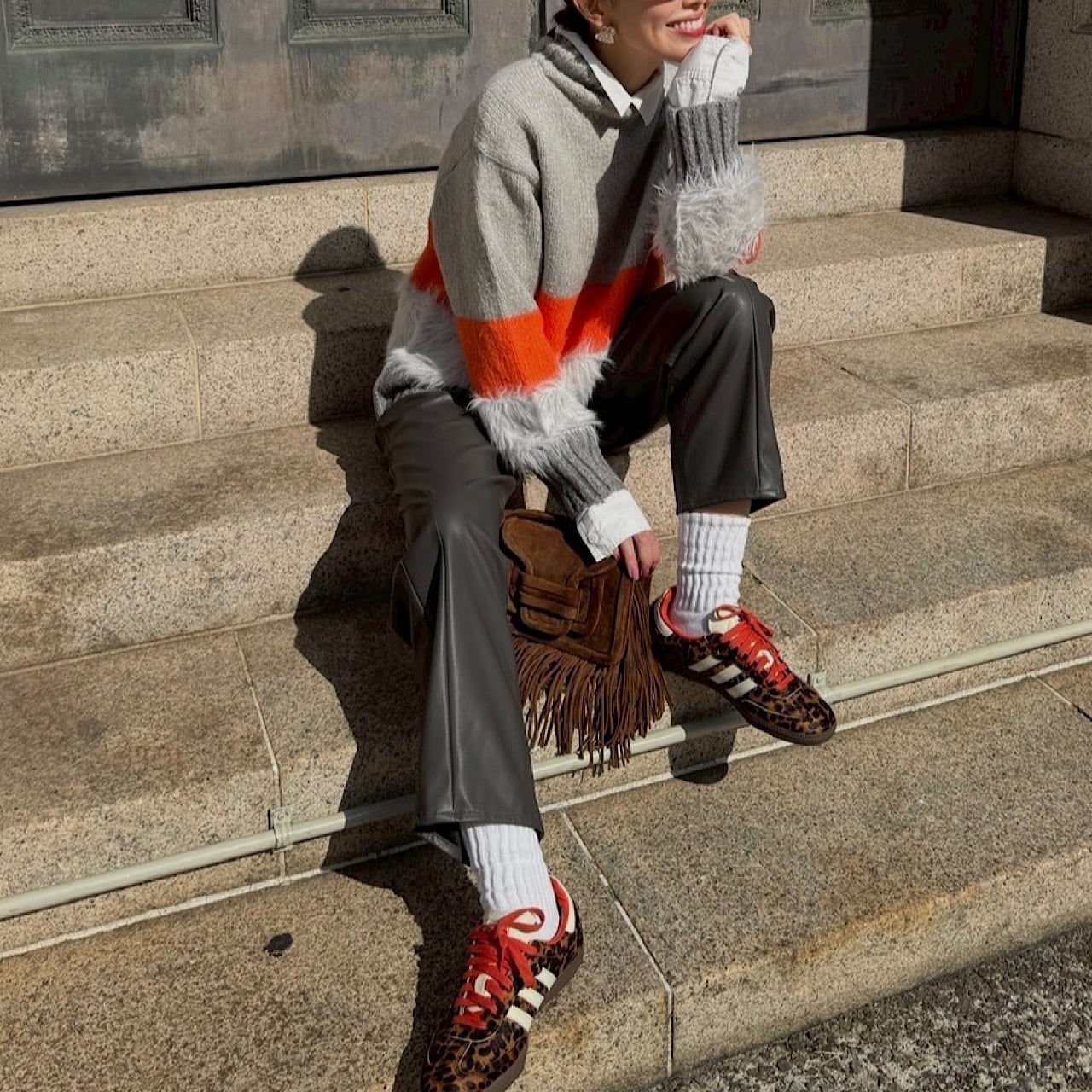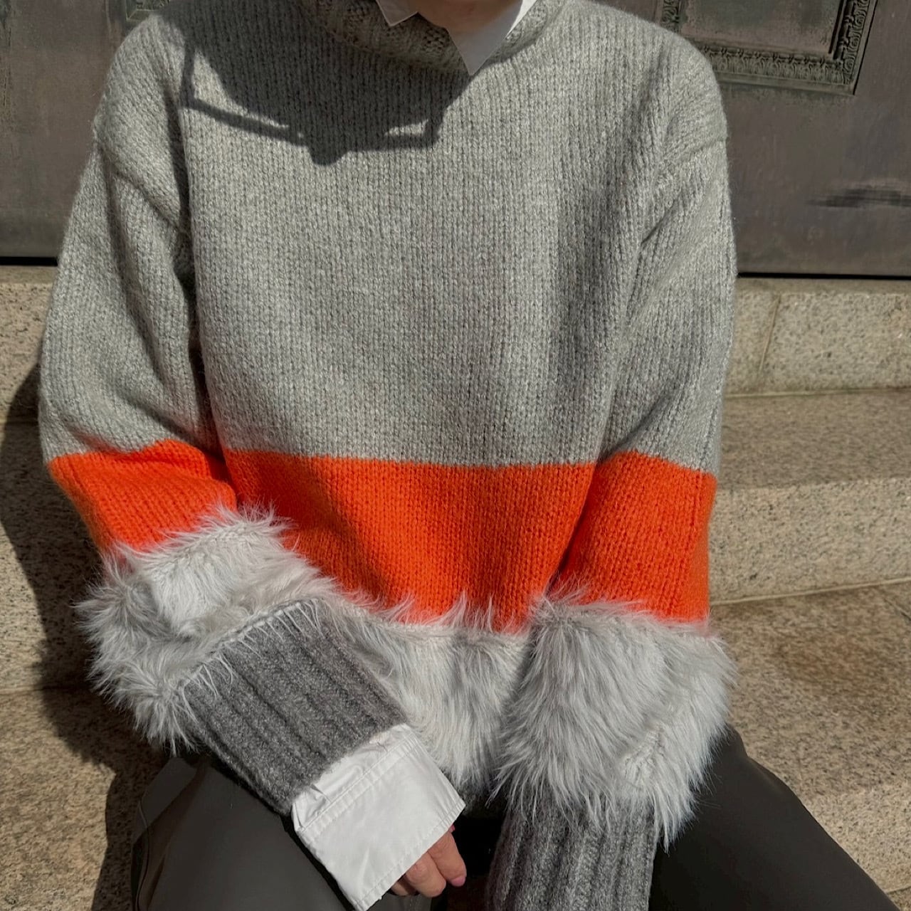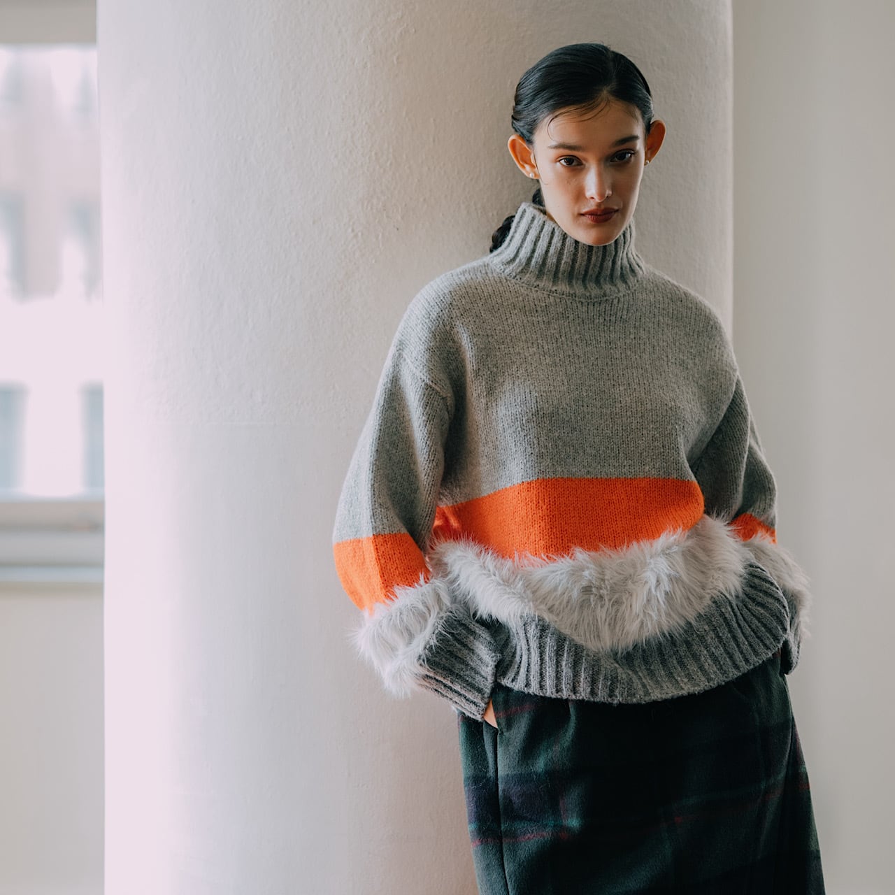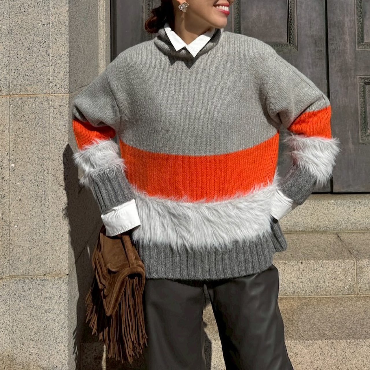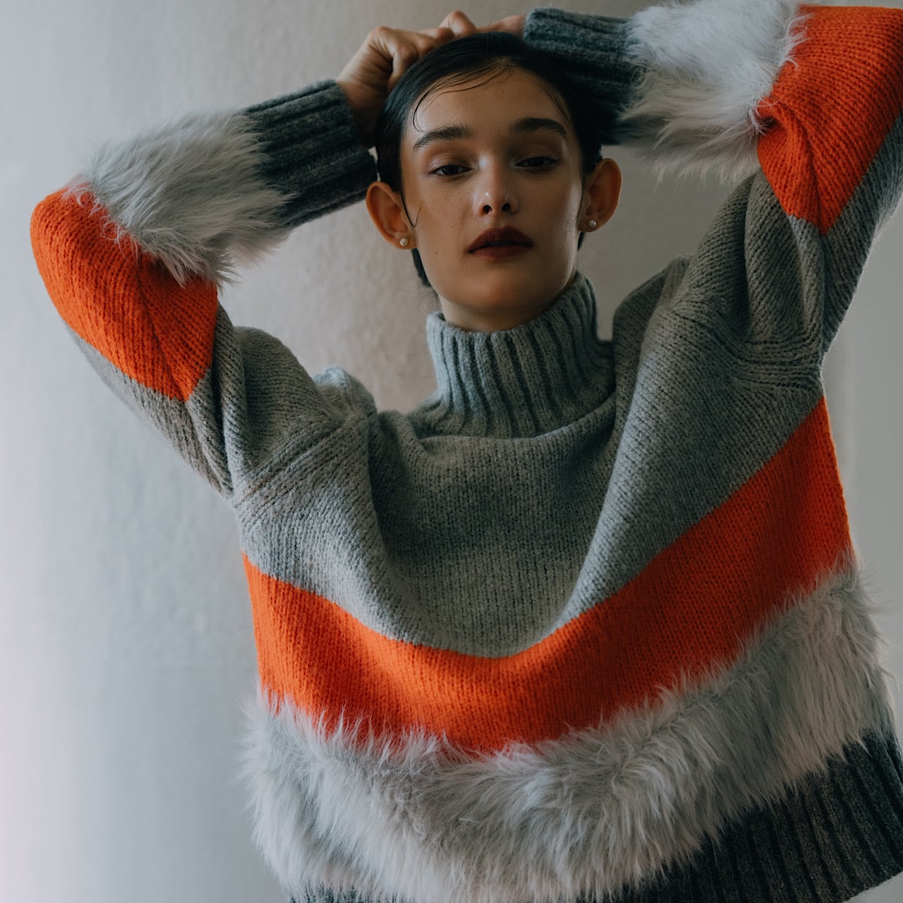 絶妙な配色のトライカラーが目を惹き、1枚でスタイリングが完成する。