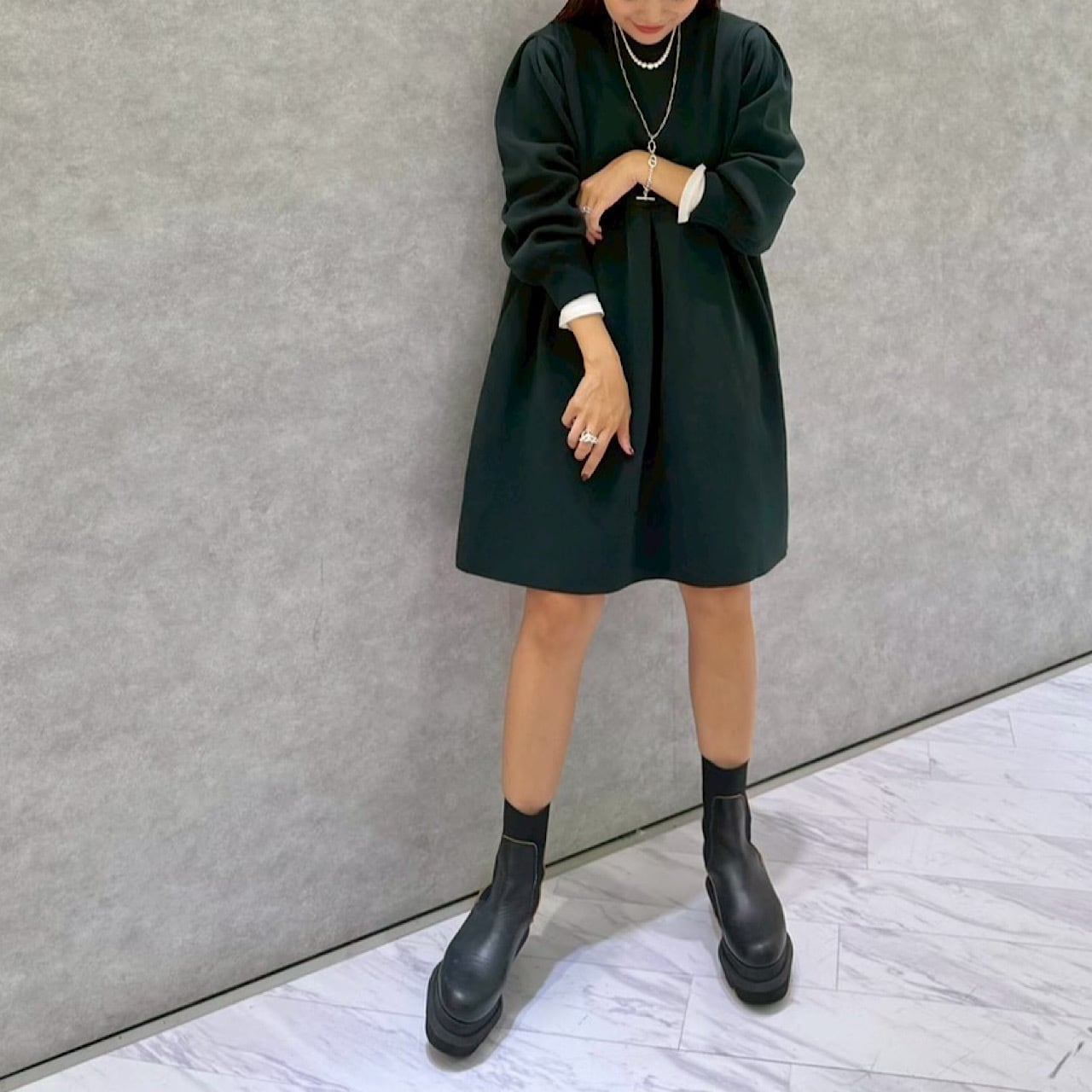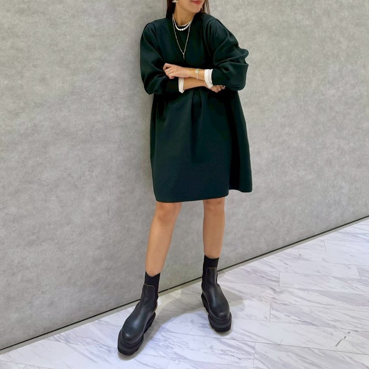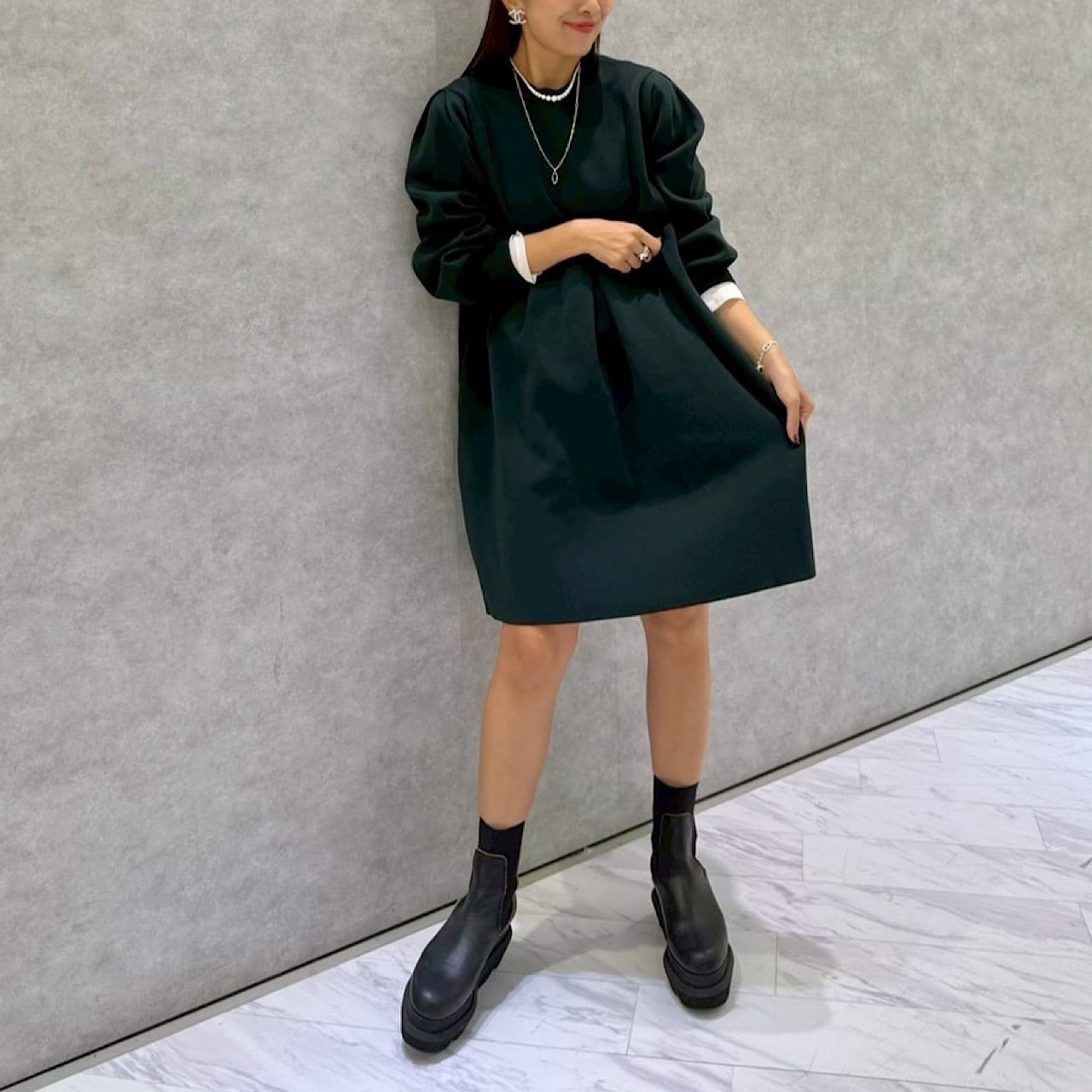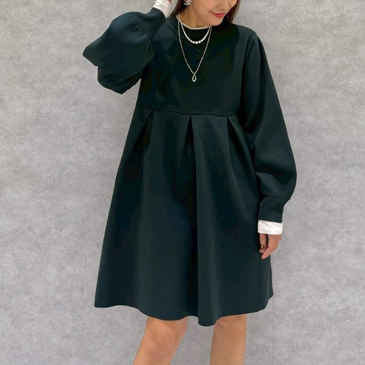 フォーマルにもカジュアルにも幅広く活用できる程よい長さのコクーンシルエットのワンピース。