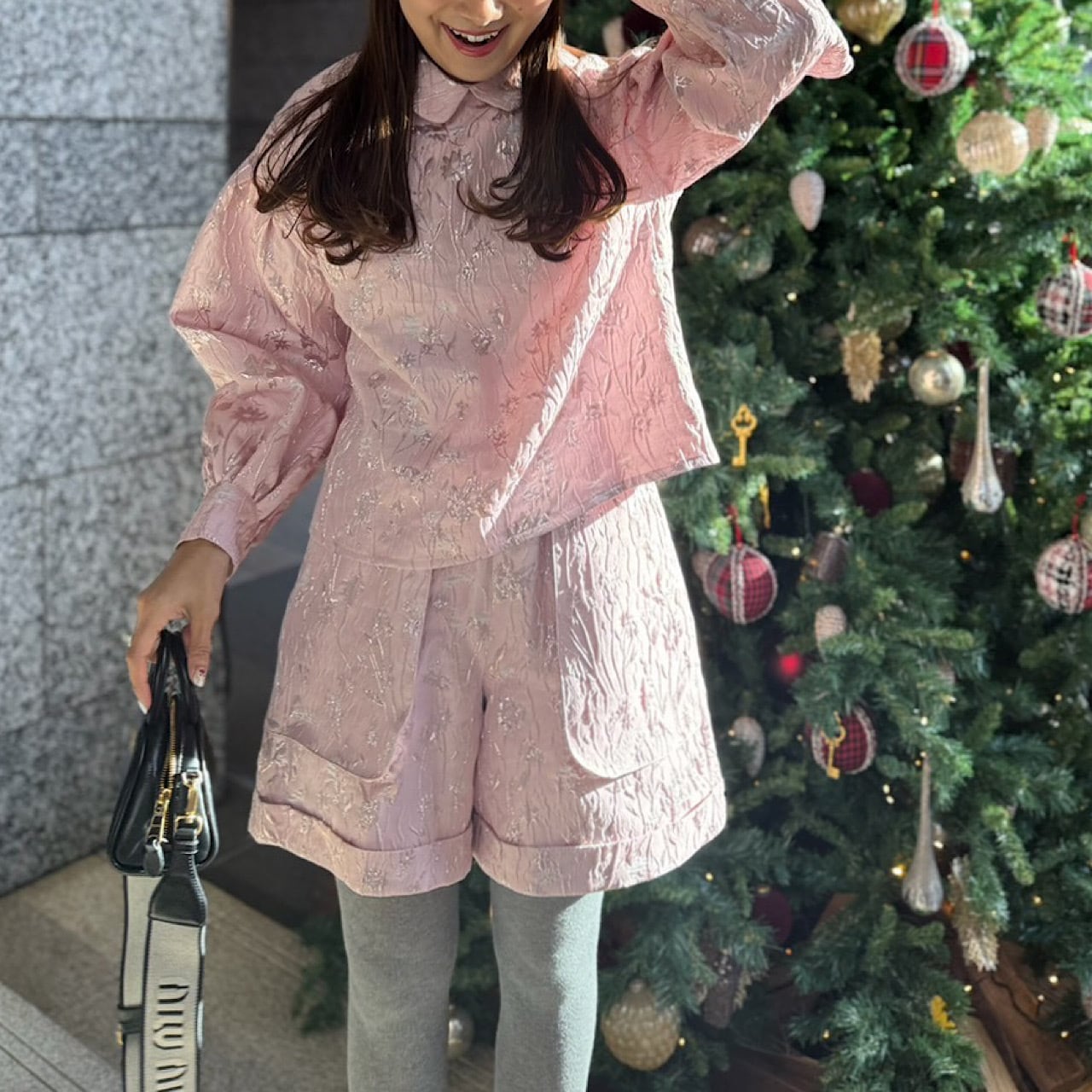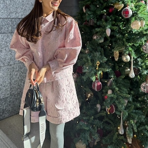 春らしさを引き立てる色使いや光沢感が魅力的な上質なジャガード生地を使用したブラウス。