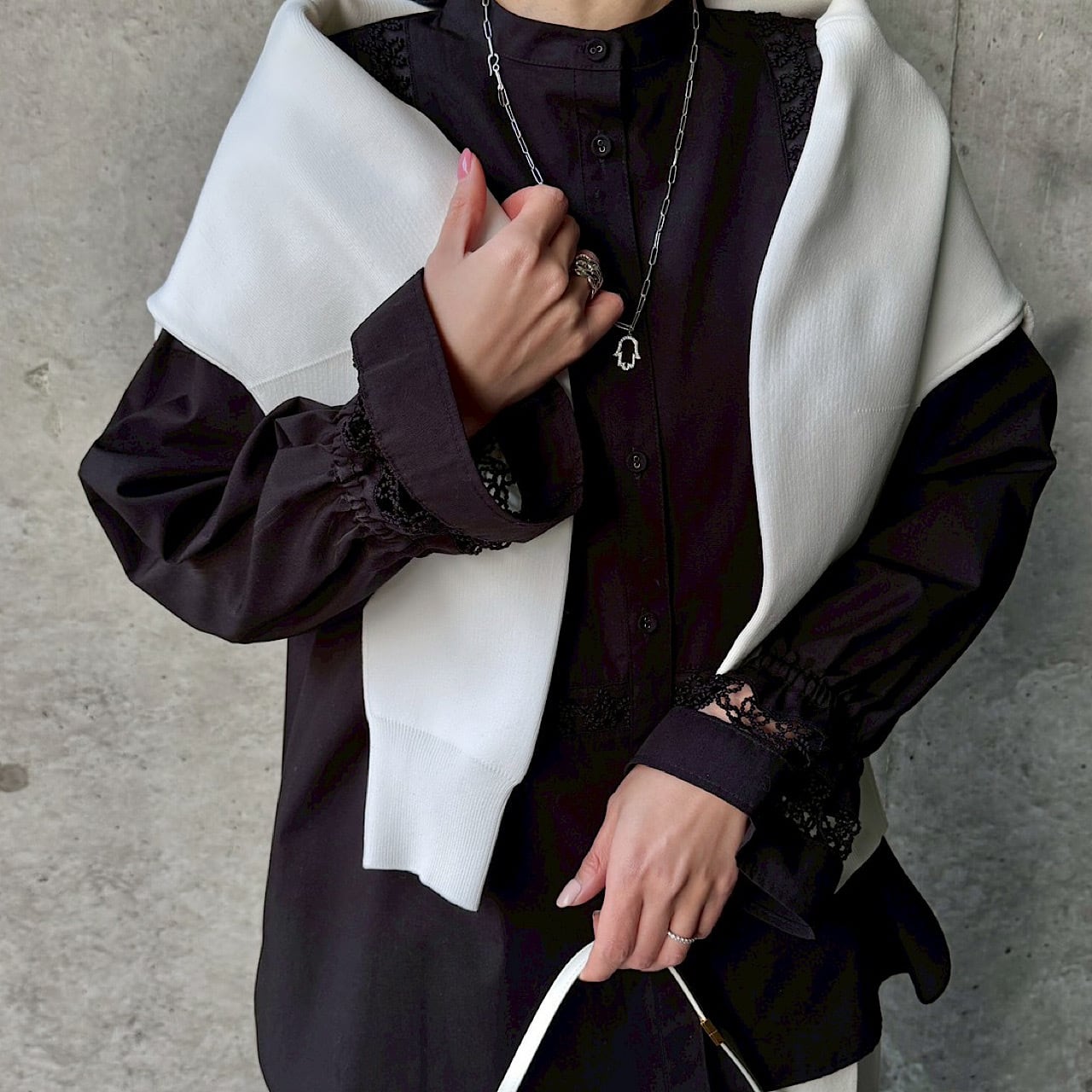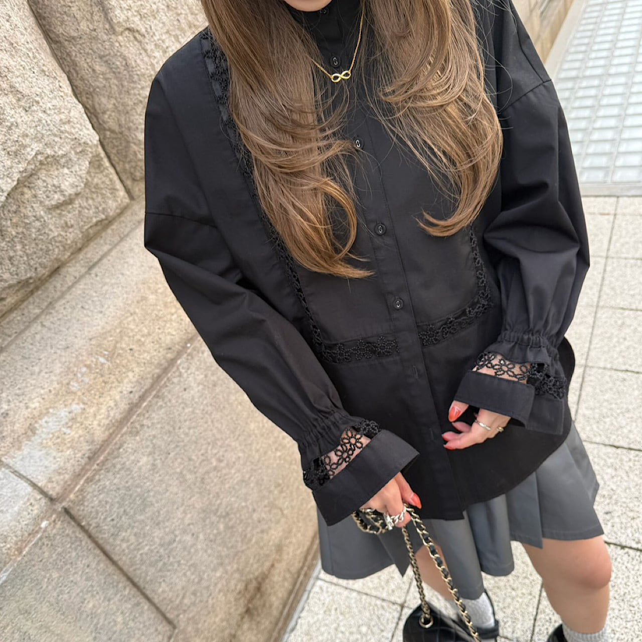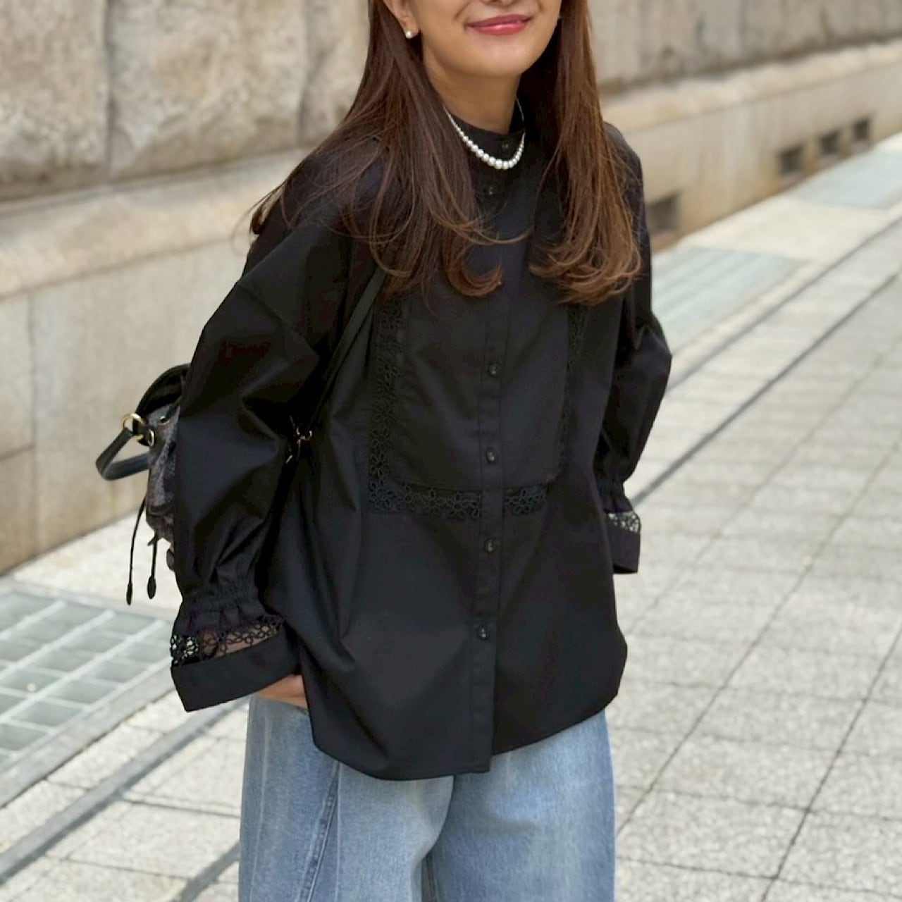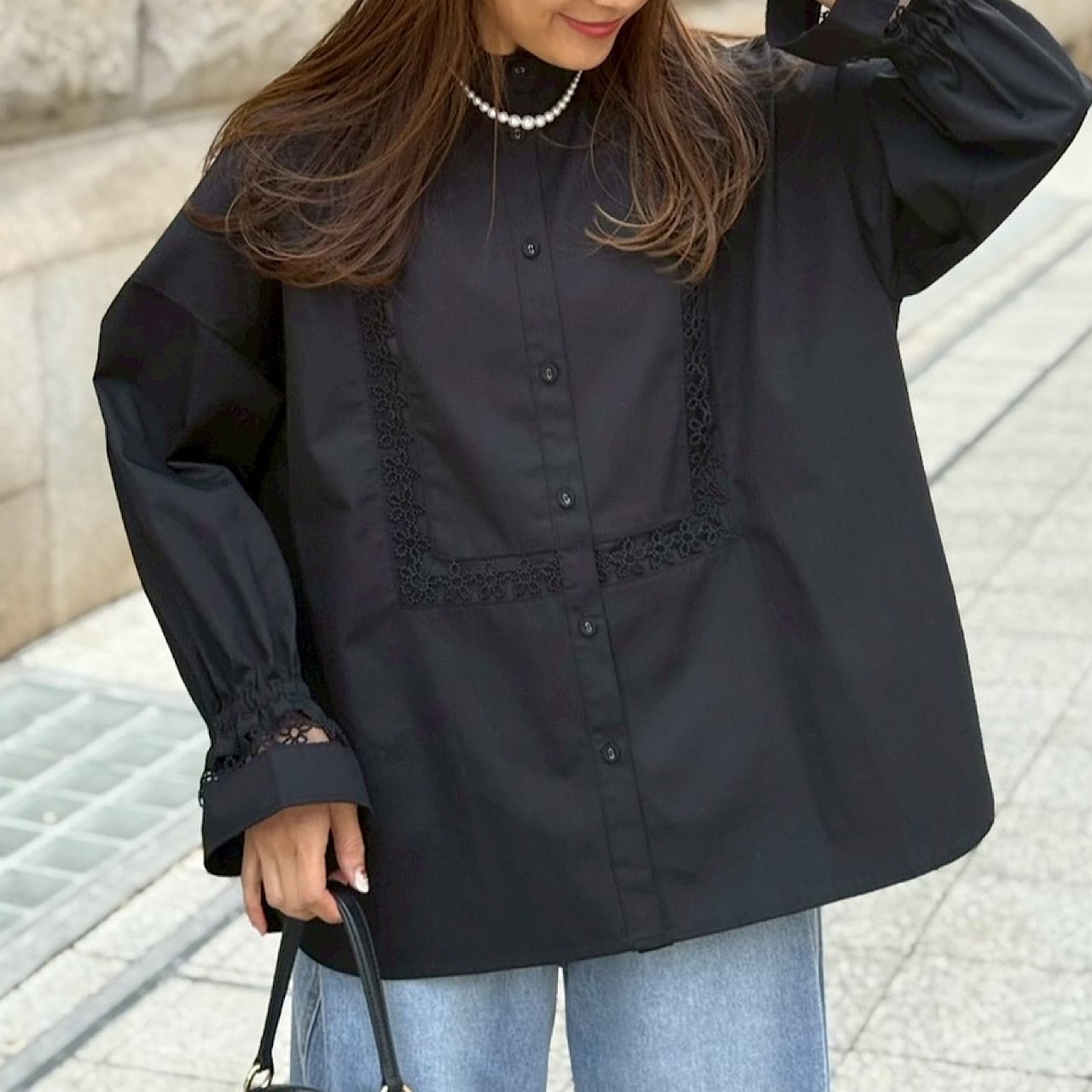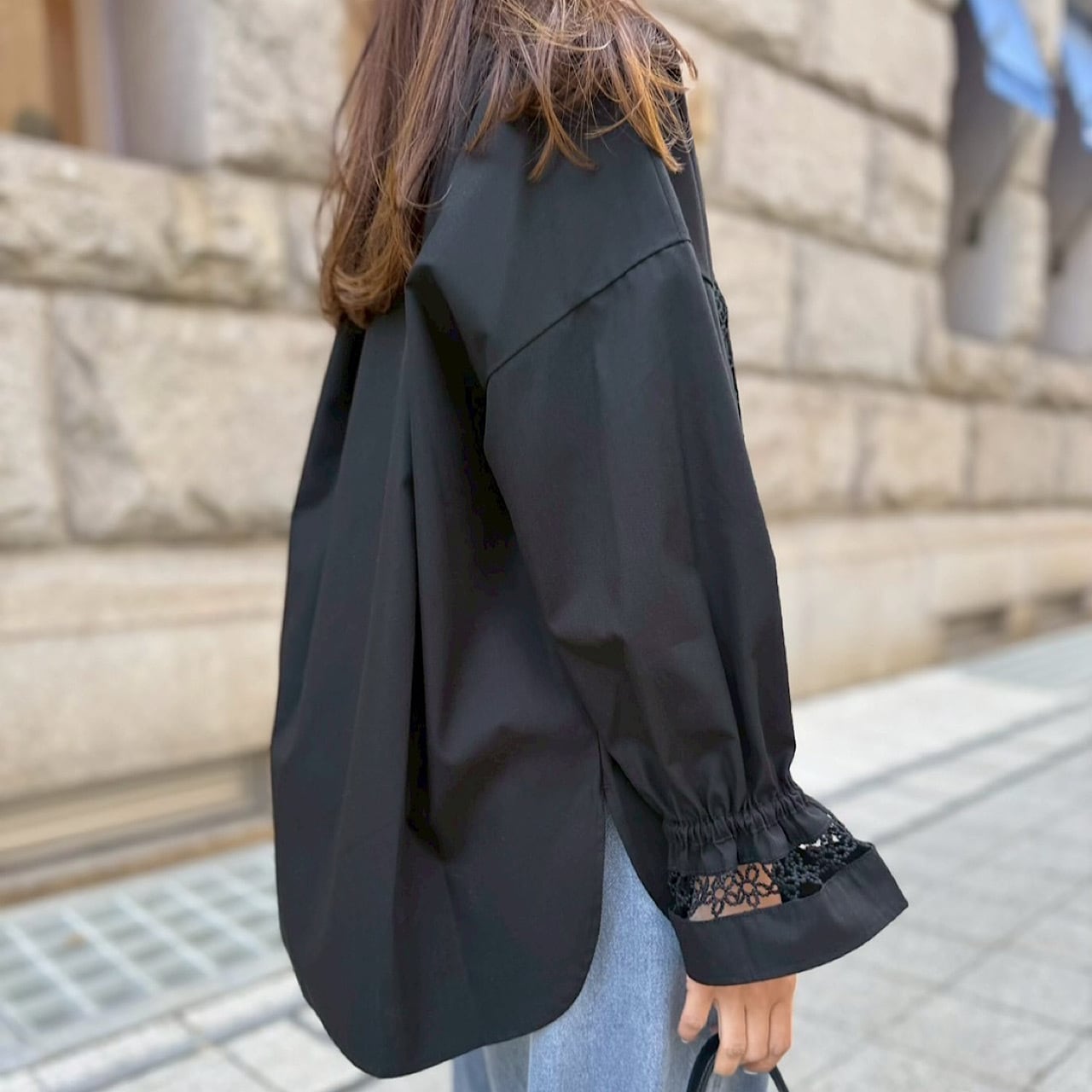 フロントと袖部分にレースを施したオーバーシルエットブラウス。フラワーモチーフの繊細なレースを使用。