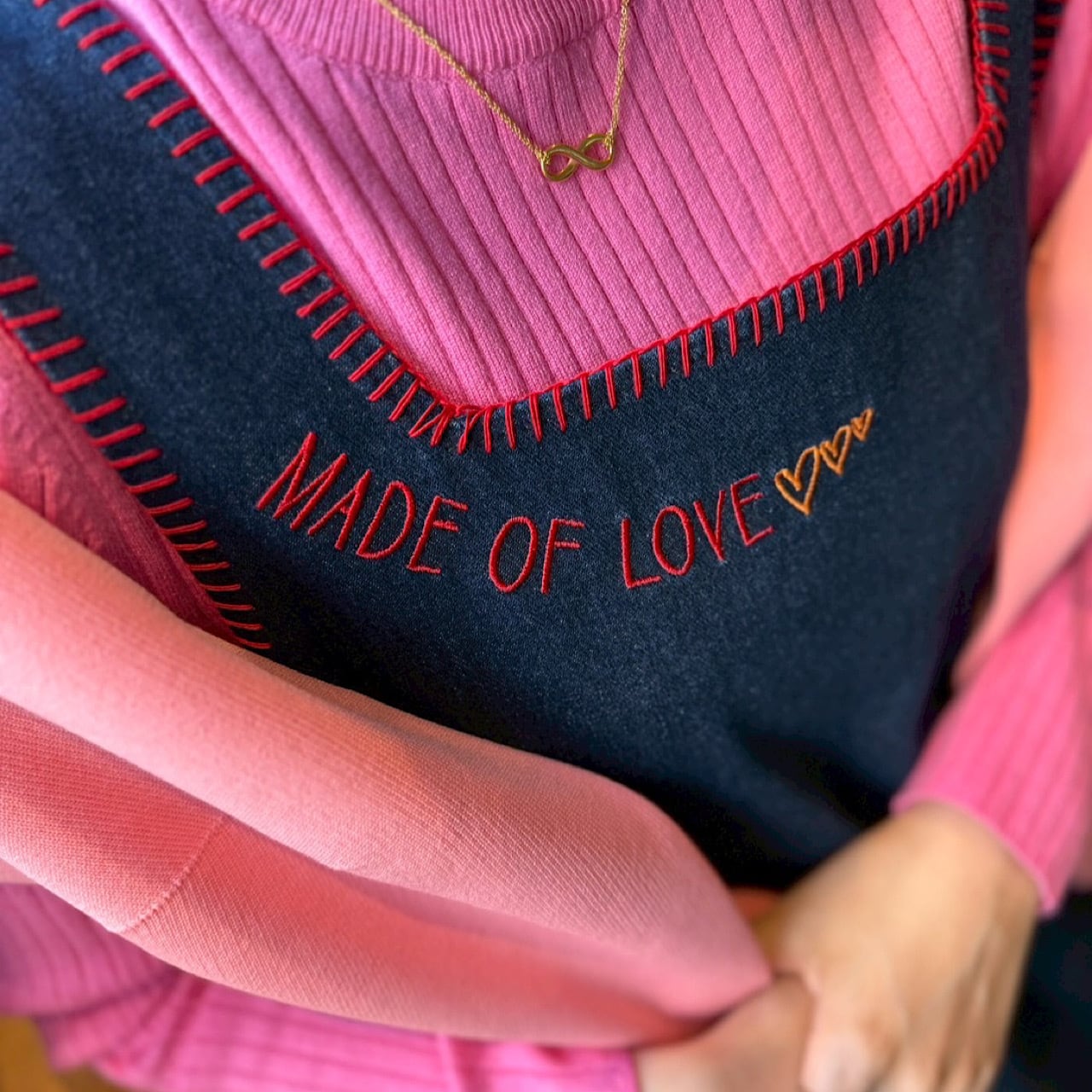 縁取りのステッチやメッセージの配色にもこだわり、遊び心を。