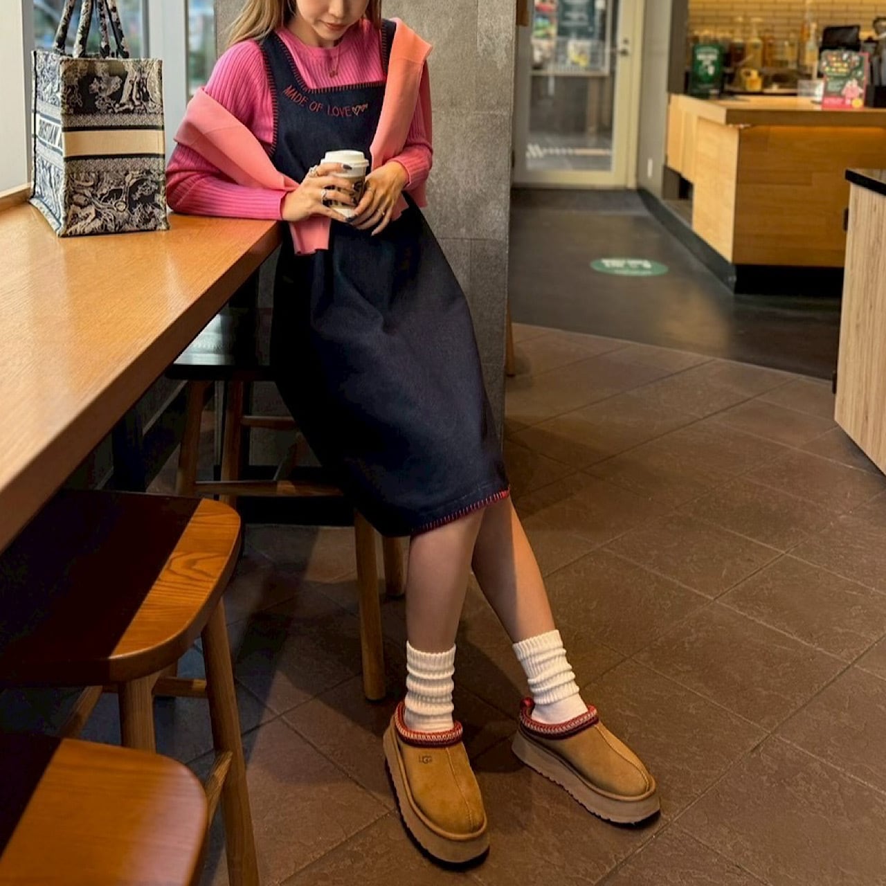シンプルなインナーに合わせて、ブーツはもちろんスニーカーと合わせるのもおすすめ。