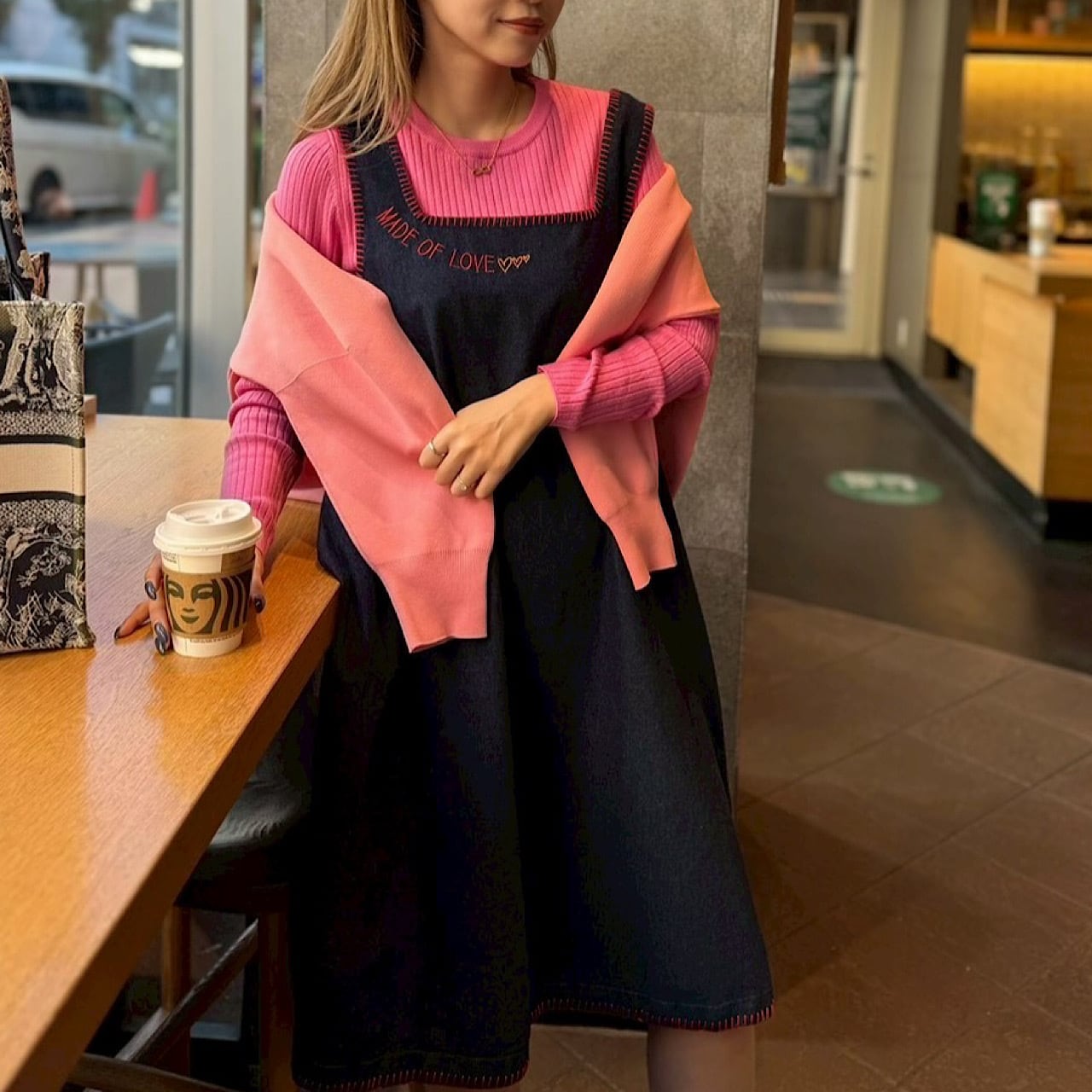 柔らかいデニムの動きやすいジャンパースカート。着脱のしやすさもポイントの一つ。