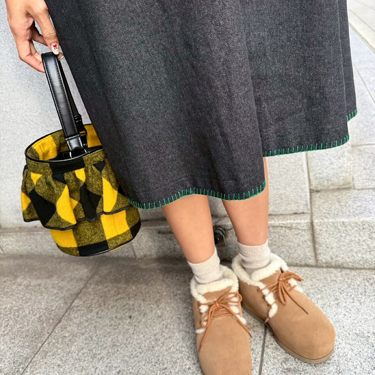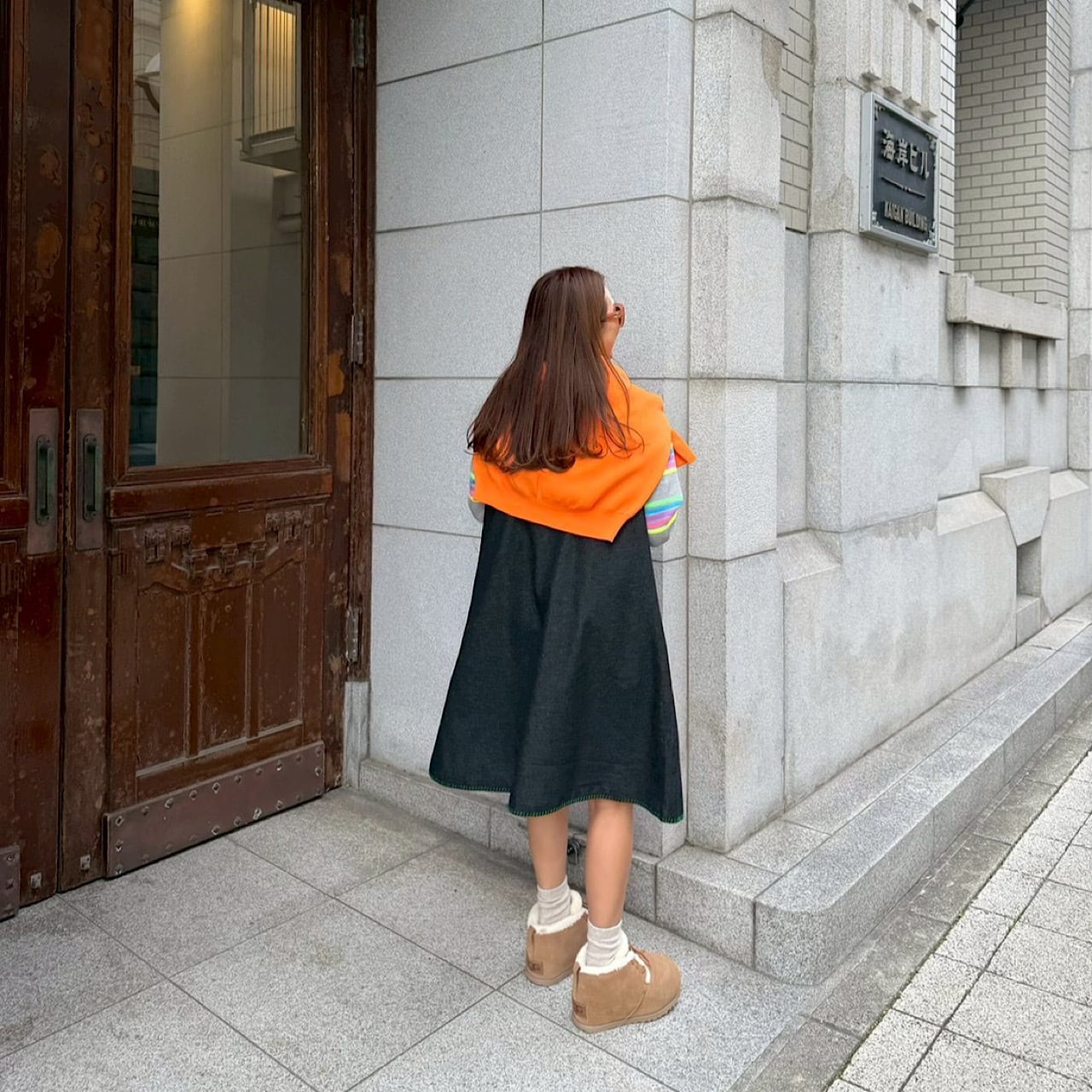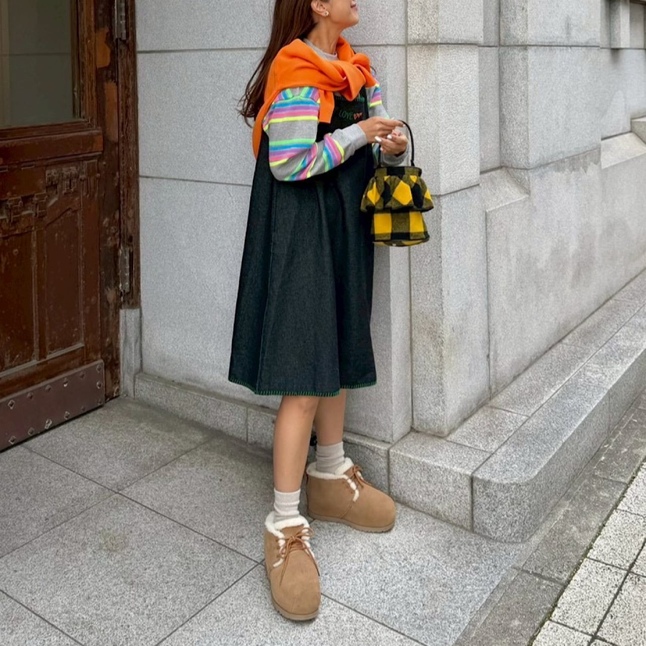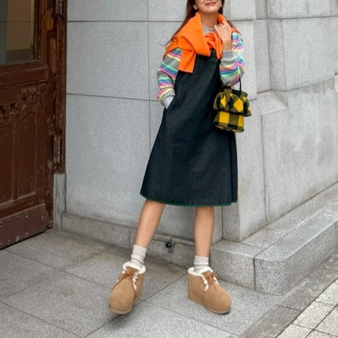 シンプルなインナーに合わせて、ブーツはもちろんスニーカーと合わせるのもおすすめ。