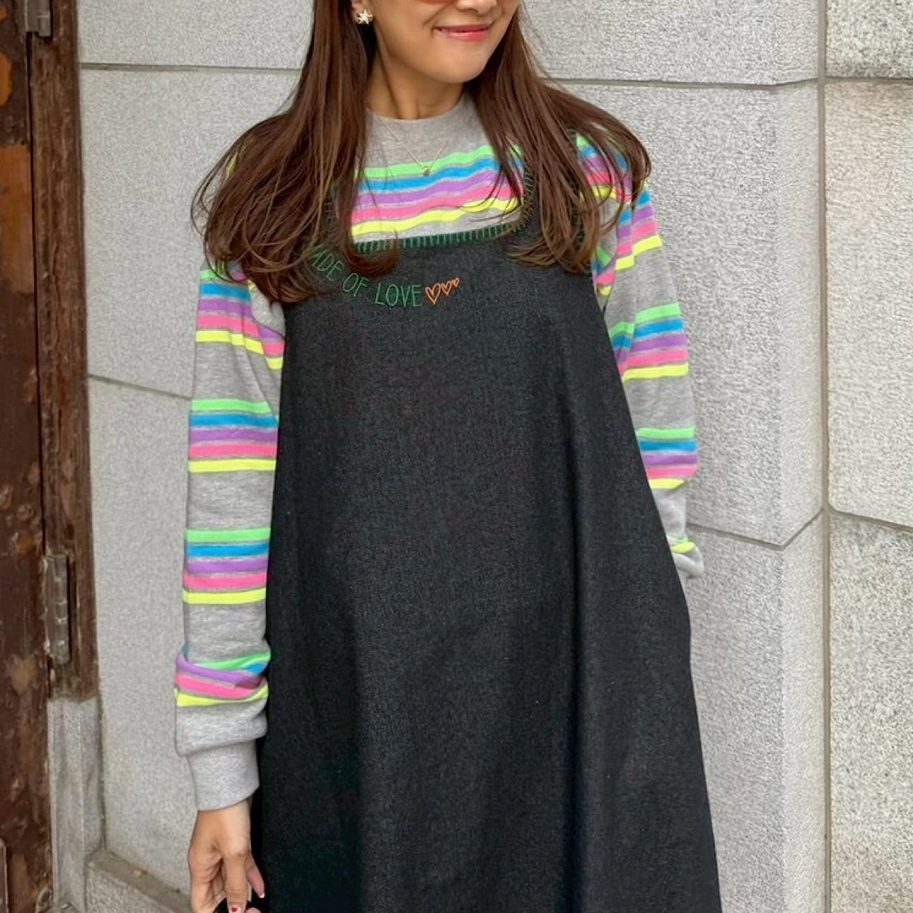 柔らかいデニムの動きやすいジャンパースカート。着脱のしやすさもポイントの一つ。