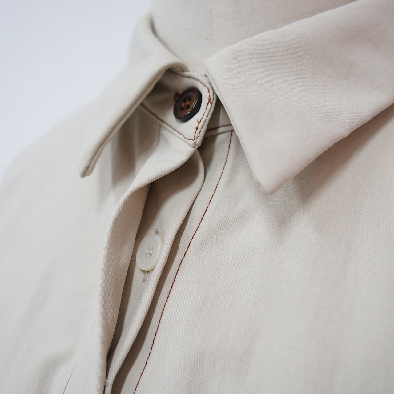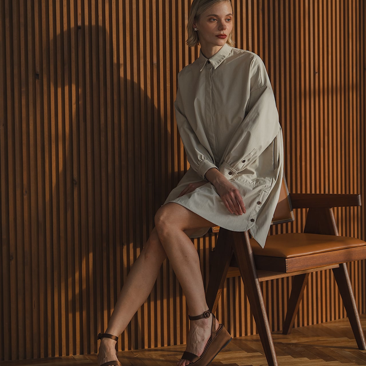 生地の特性で表面はハリと立体感、微光沢感をもたせつつナチュラルな風合いが特徴のボンディング素材のワンピース。裏面はポリエステル100%の素材を貼り合わせインナーとの摩擦も軽減しました。