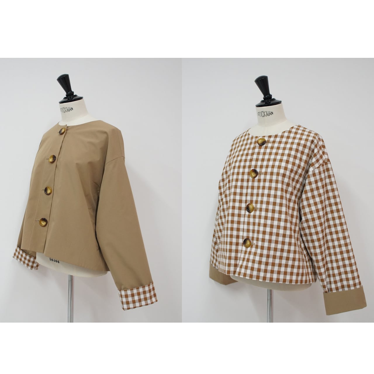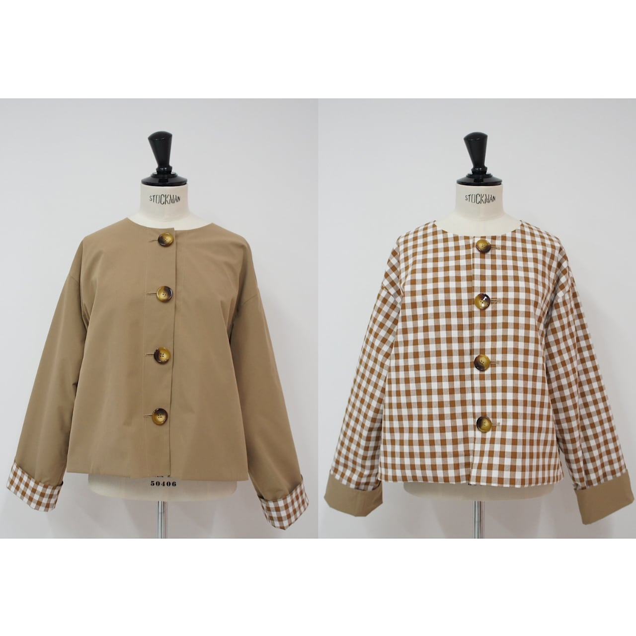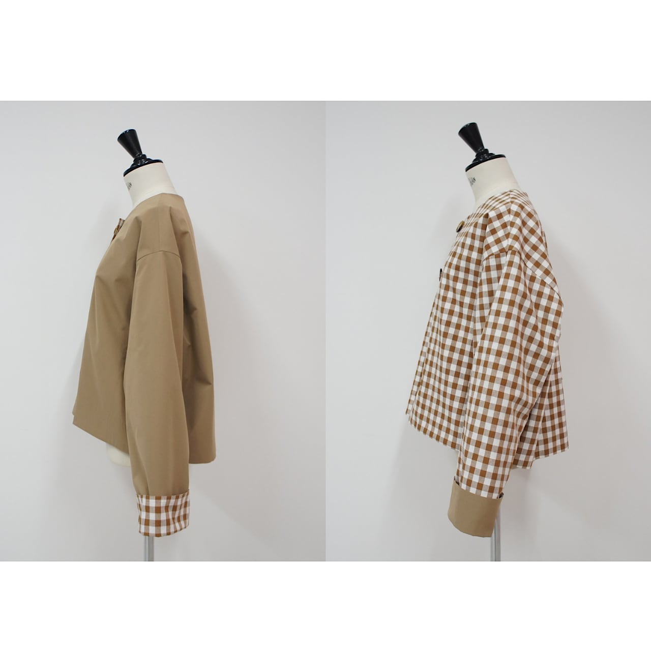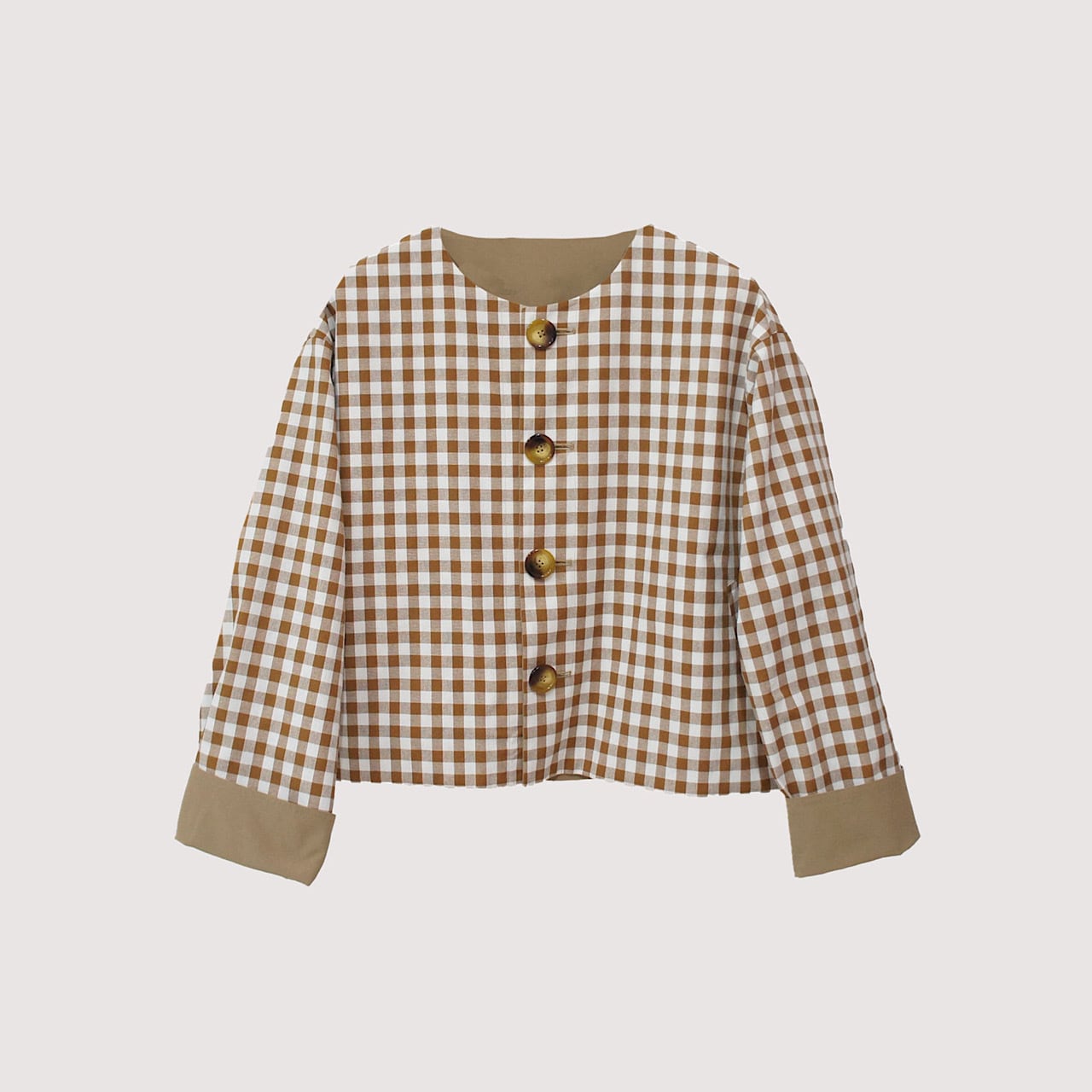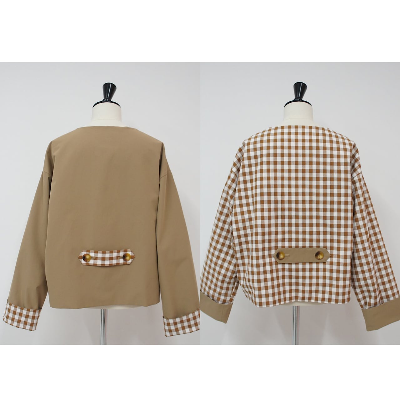 大きめのギンガム柄と無地とアレンジが楽しめるリバーシブルジャケット。