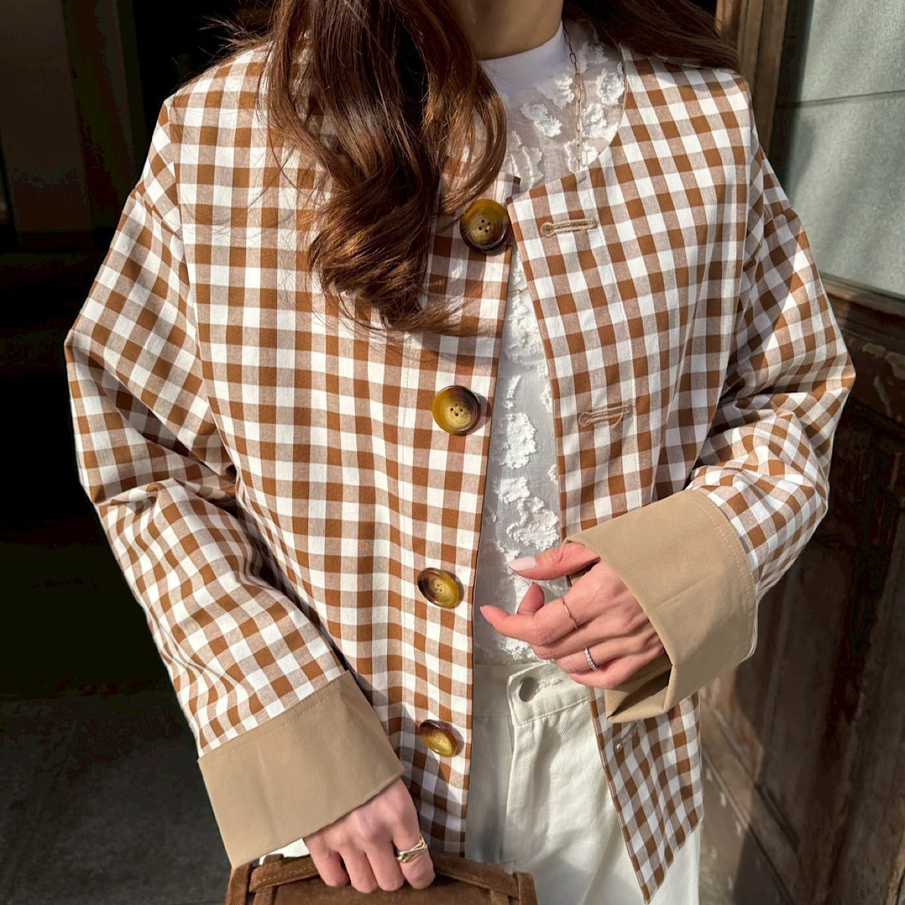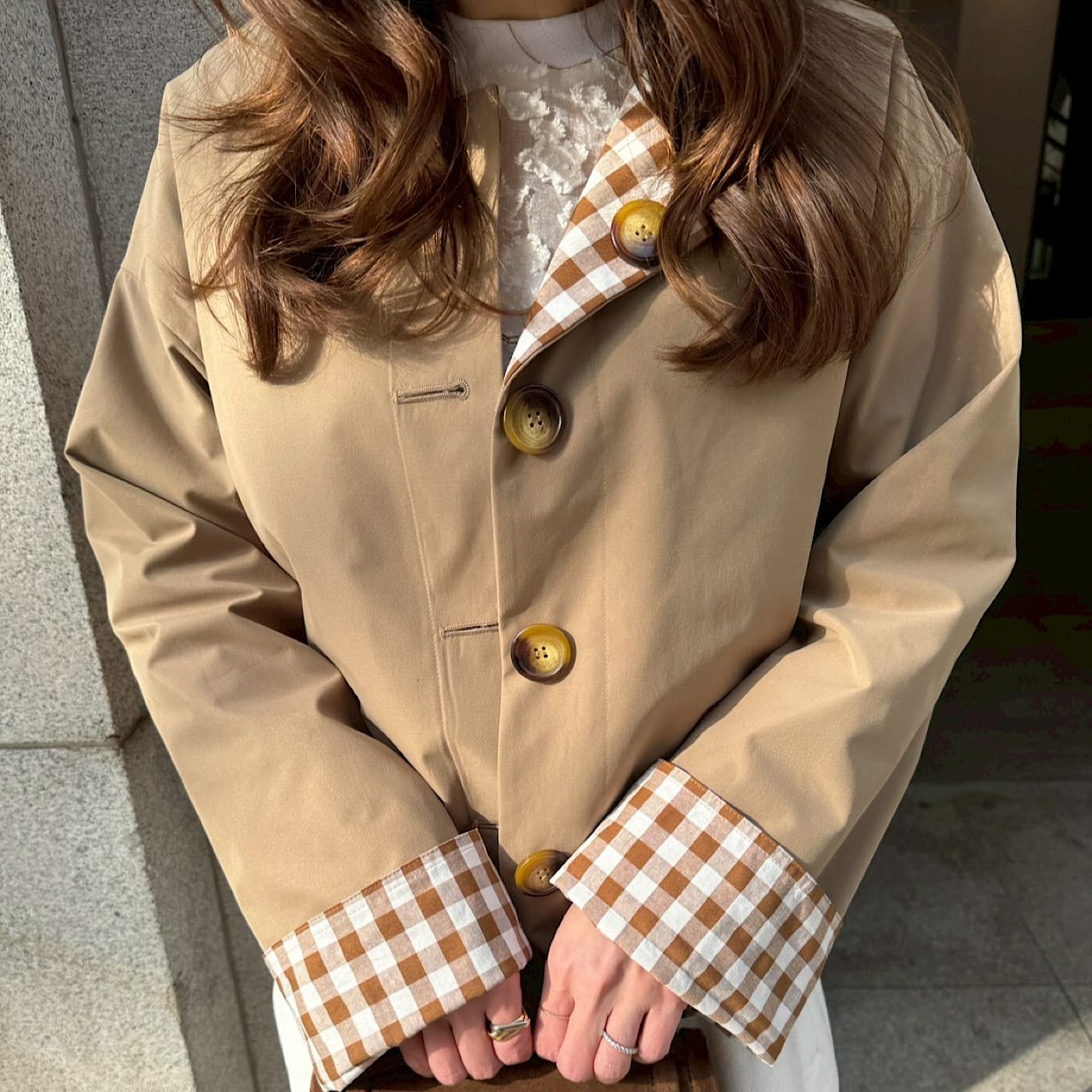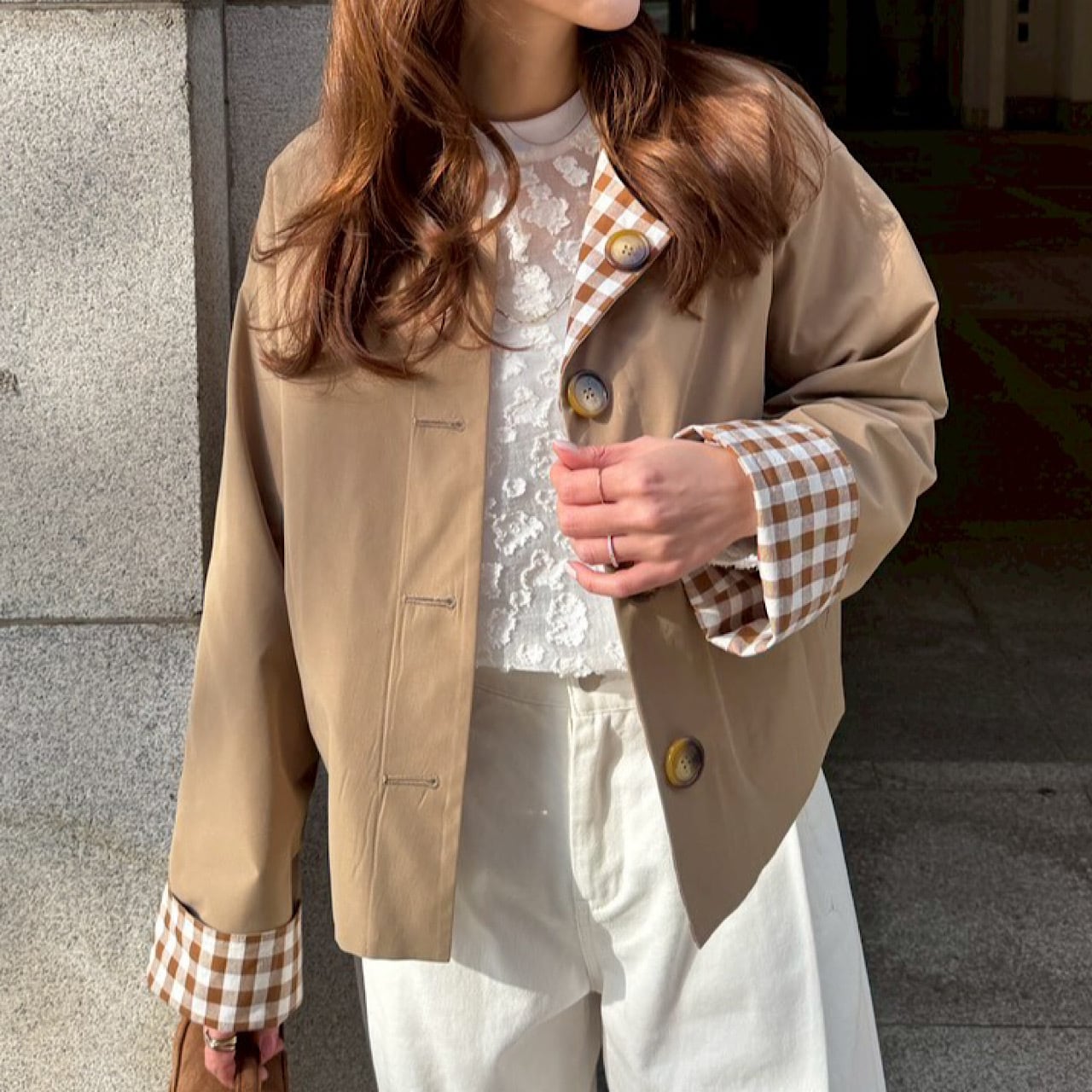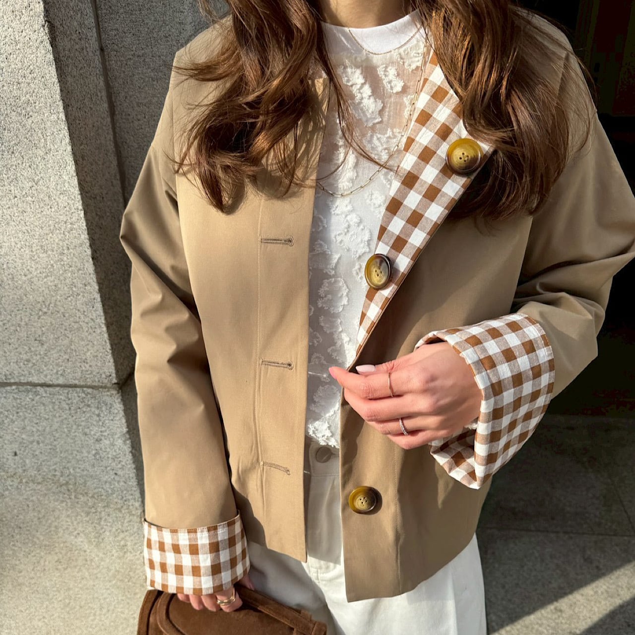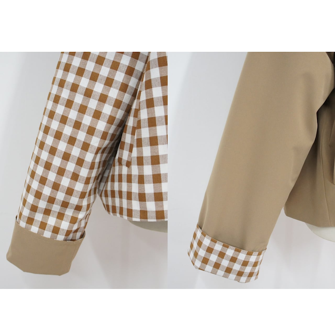 大きめのギンガム柄と無地とアレンジが楽しめるリバーシブルジャケット。