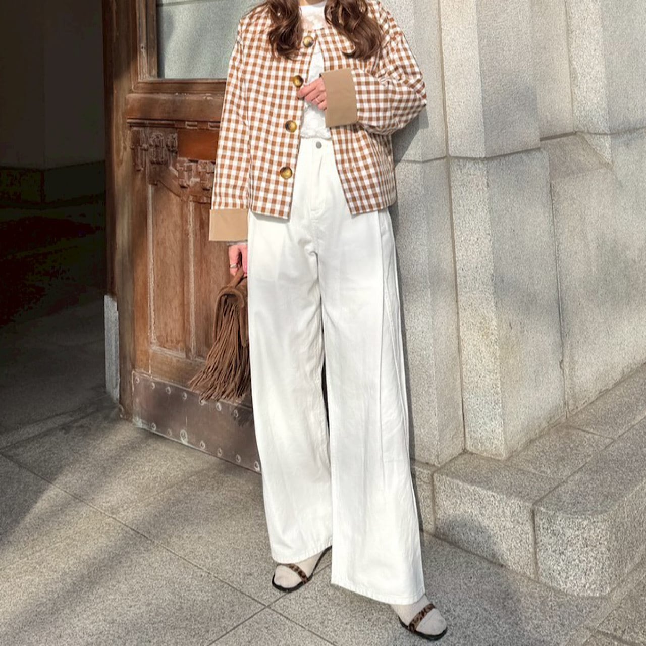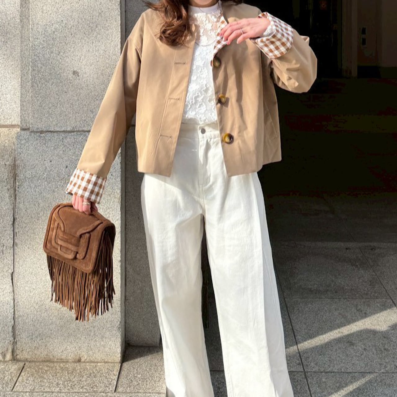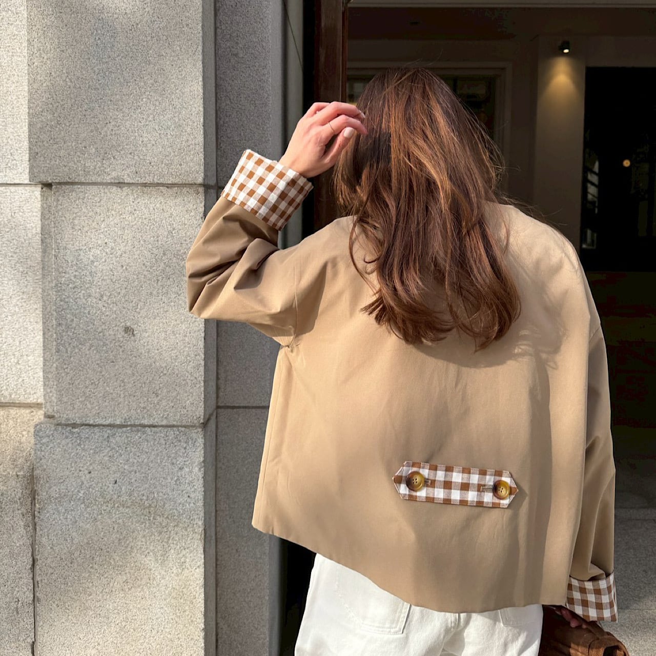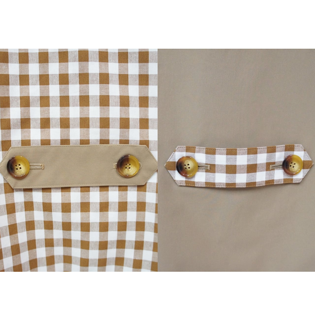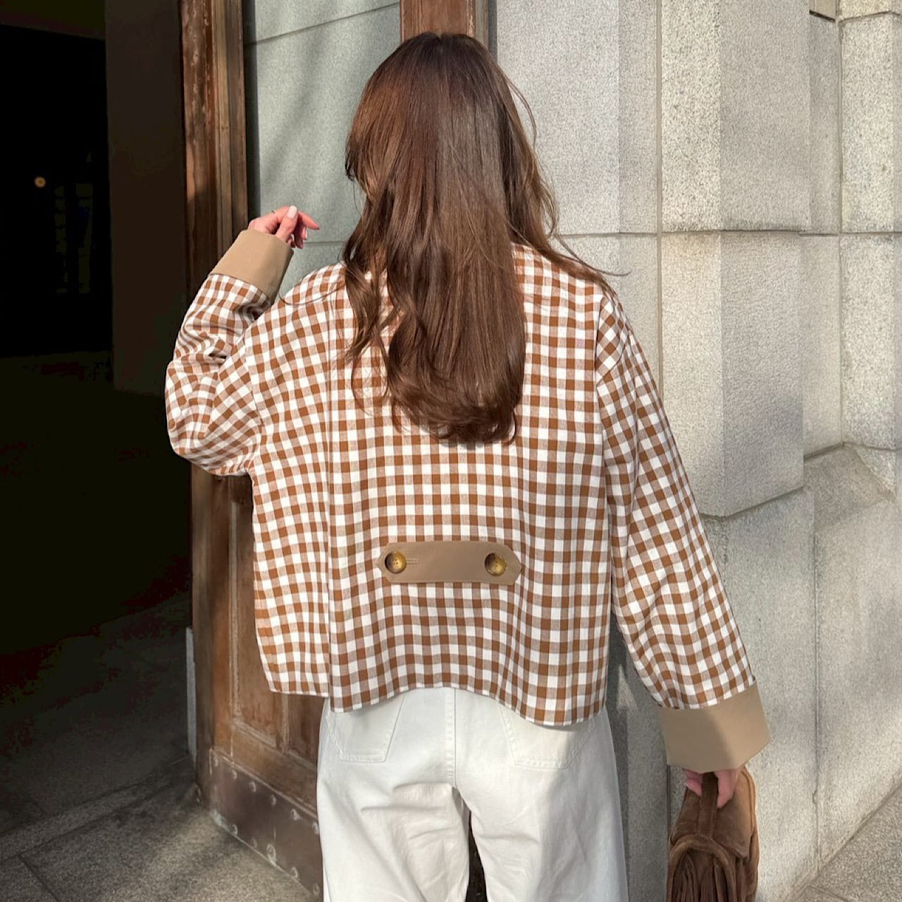 大きめのギンガム柄と無地とアレンジが楽しめるリバーシブルジャケット。