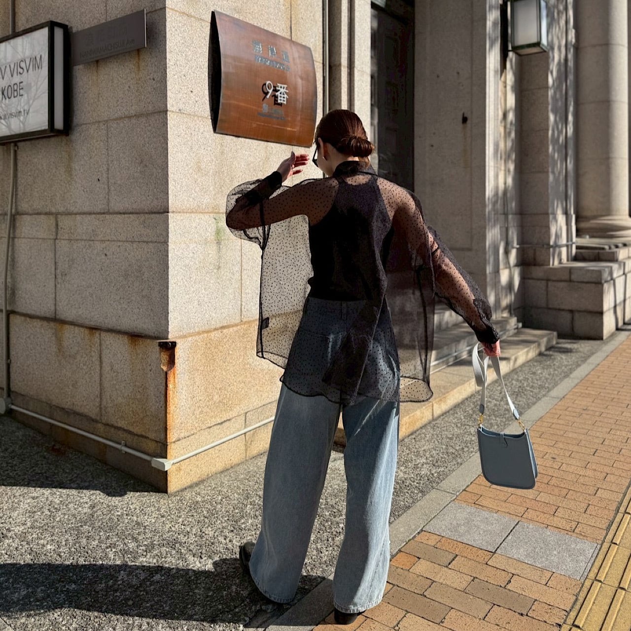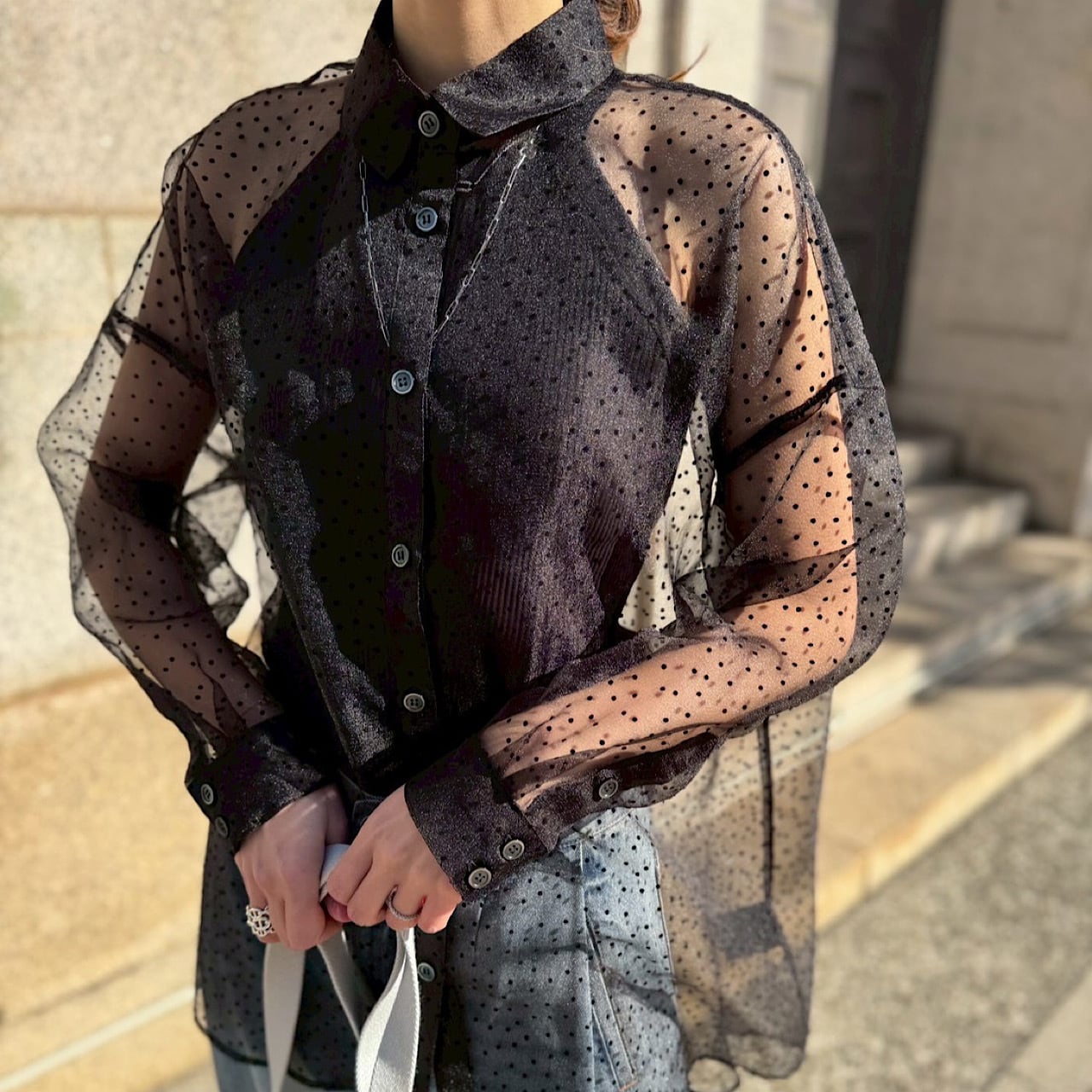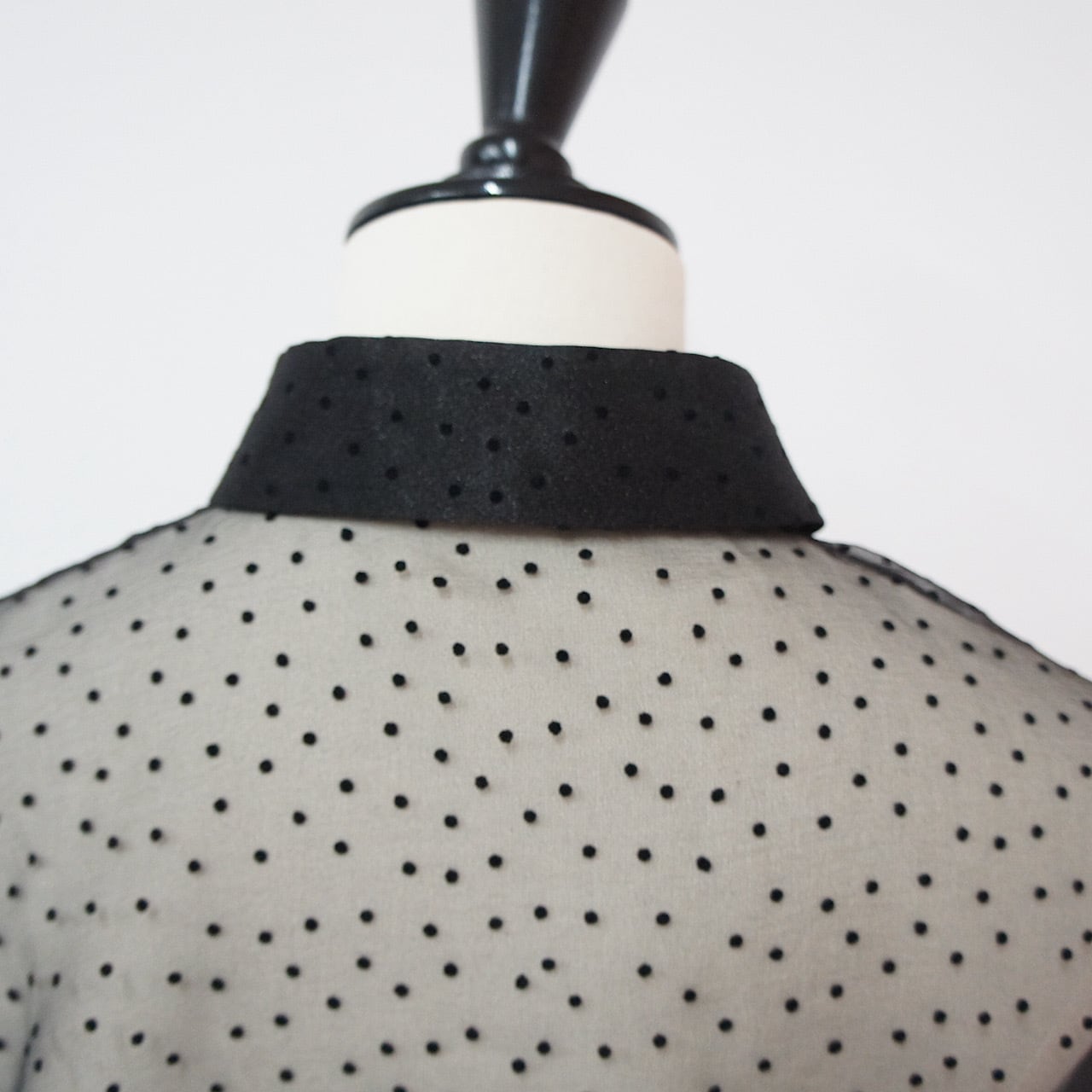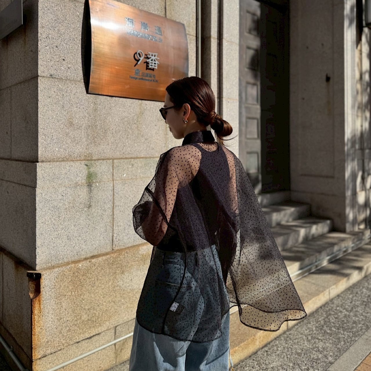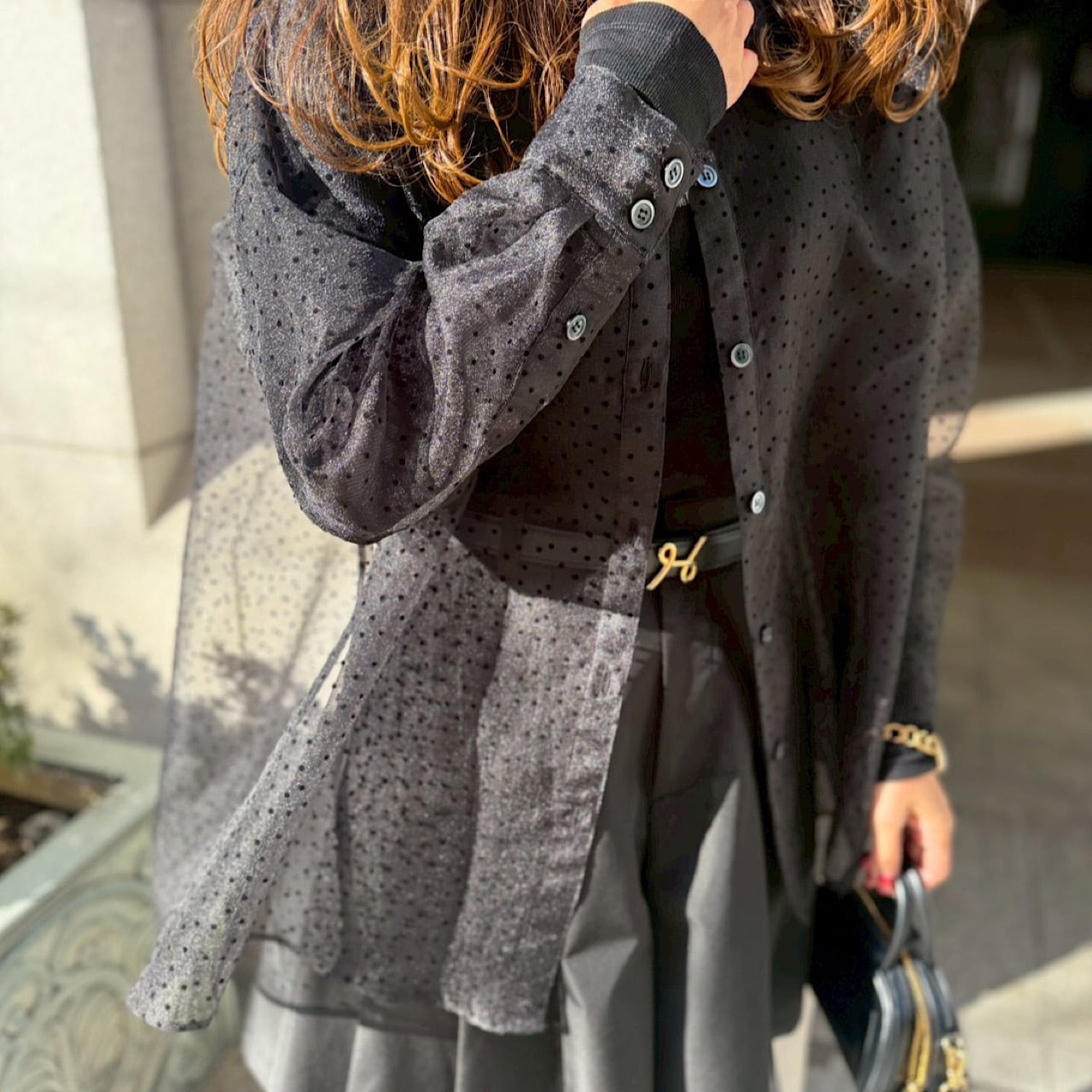 繊細なドット柄が上品に映える、シアー素材のドットブラウス。程よい透け感があり、軽やかで女性らしい印象を演出します。