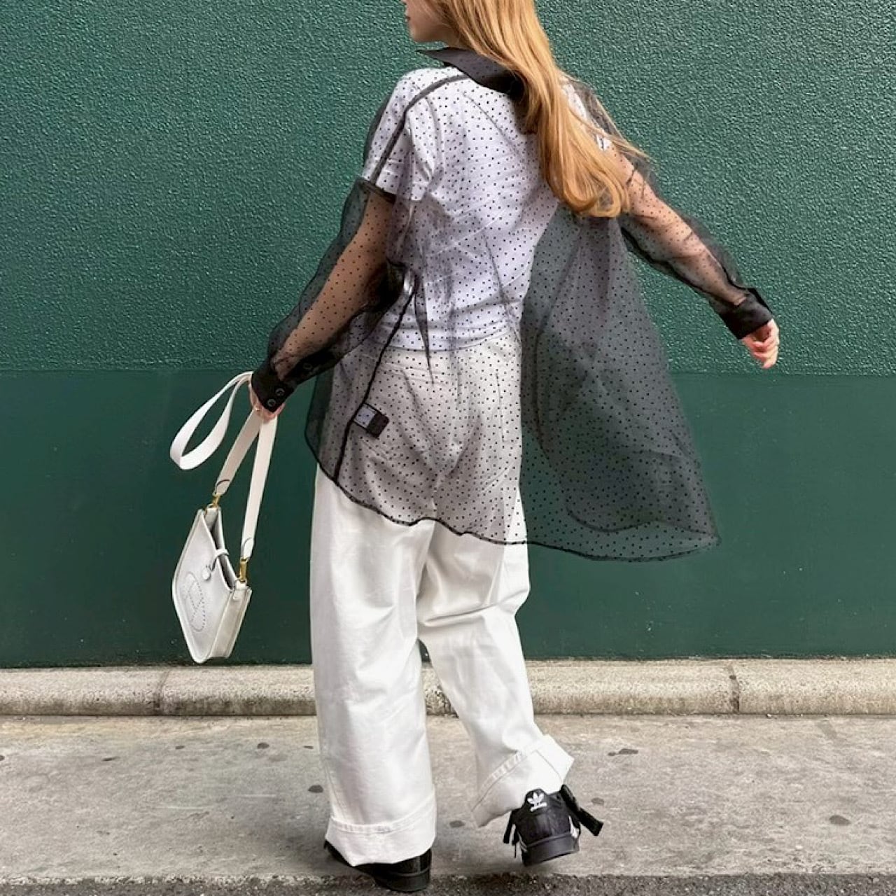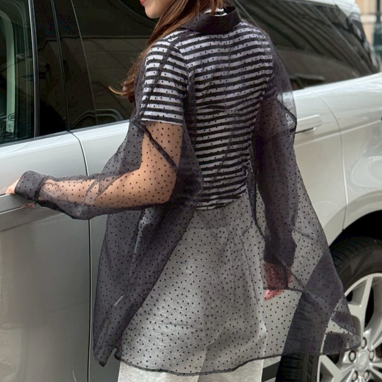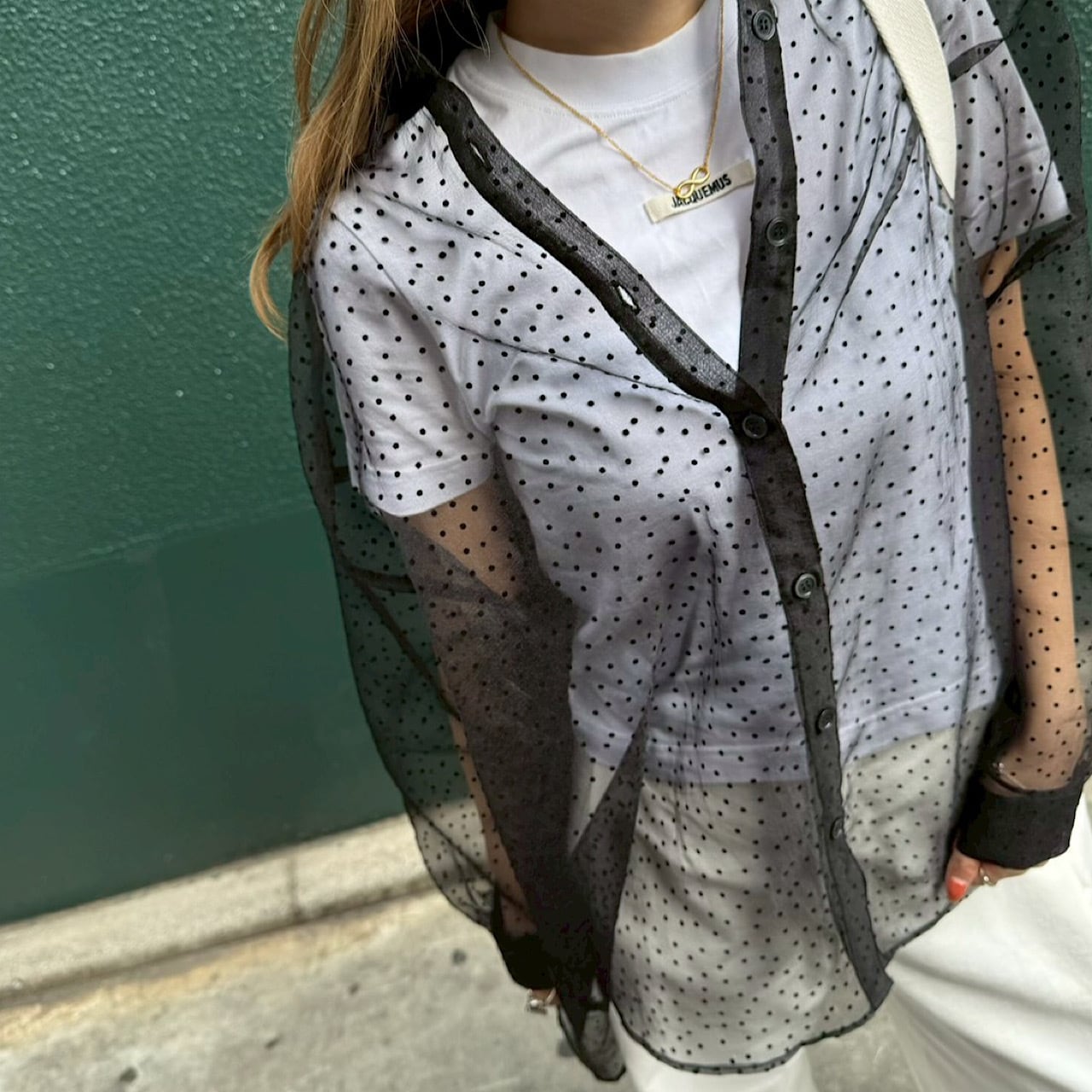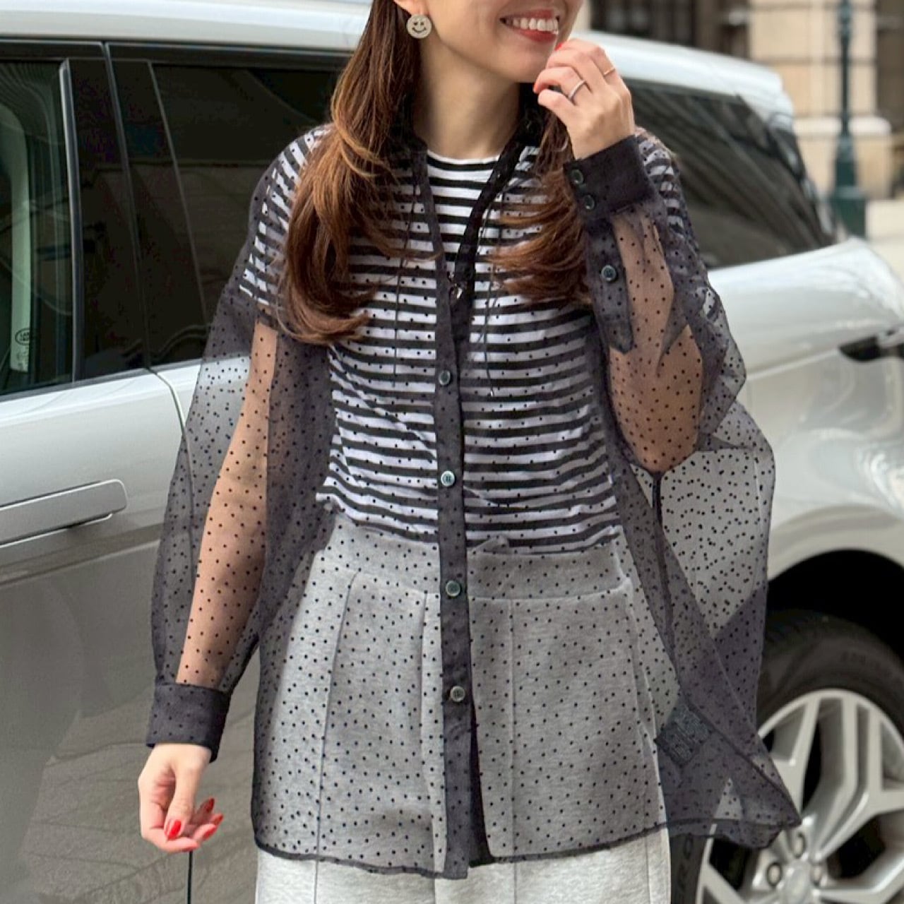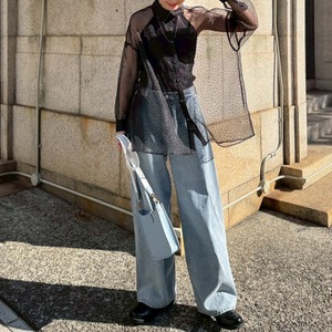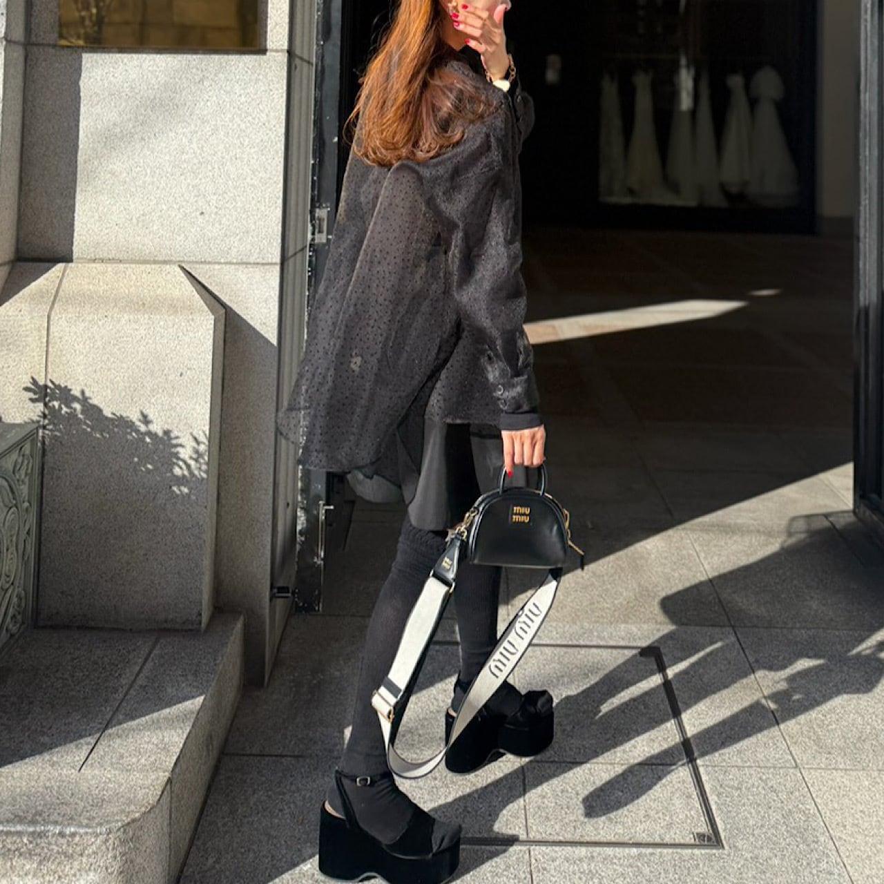 繊細なドット柄が上品に映える、シアー素材のドットブラウス。程よい透け感があり、軽やかで女性らしい印象を演出します。