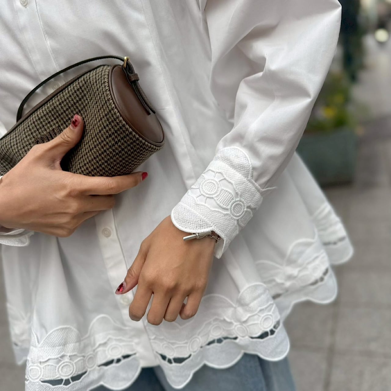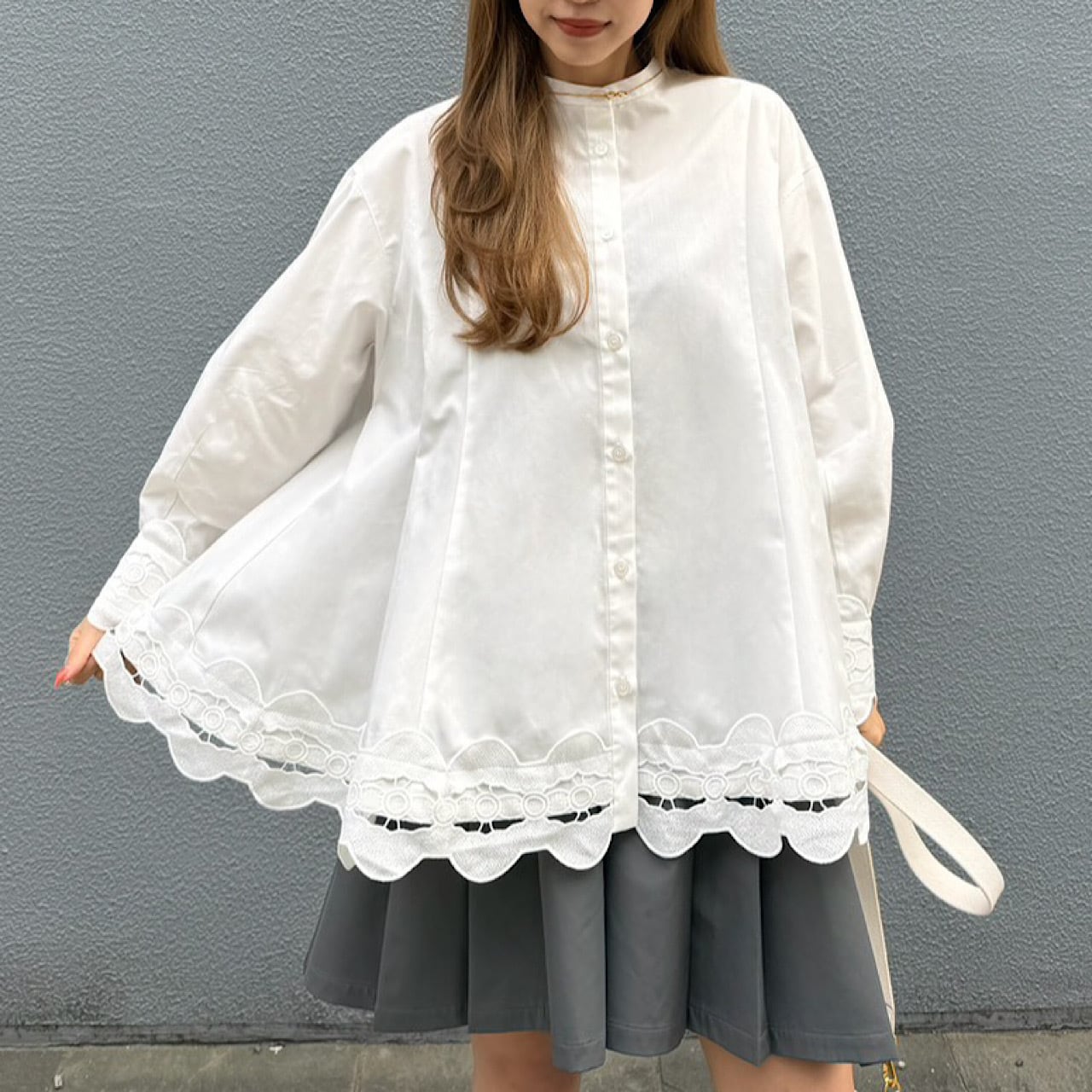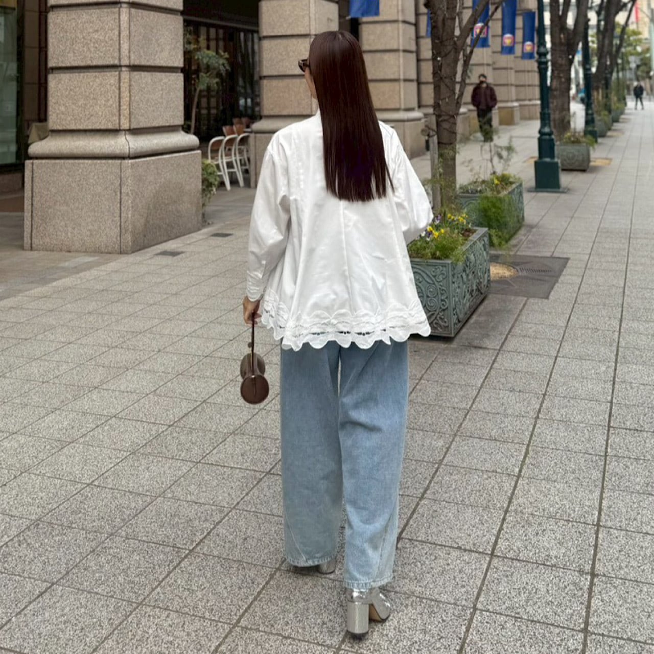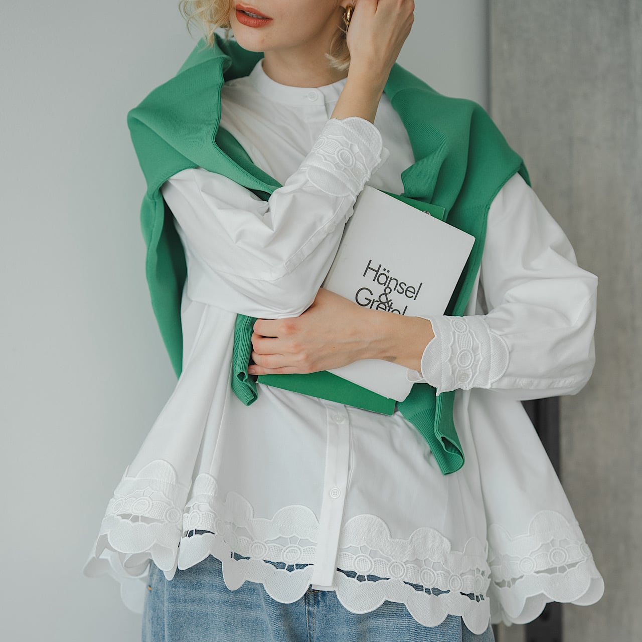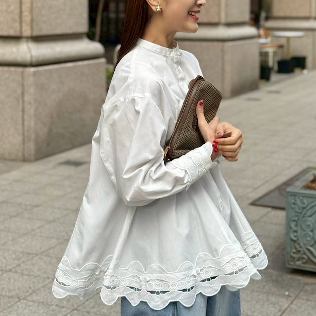 甘くなりすぎないレースデザインで主役級でありながらレイヤードや羽織りスタイルにも活躍。きちんと感と抜け感を兼ね備えた大人のためのブラウス。