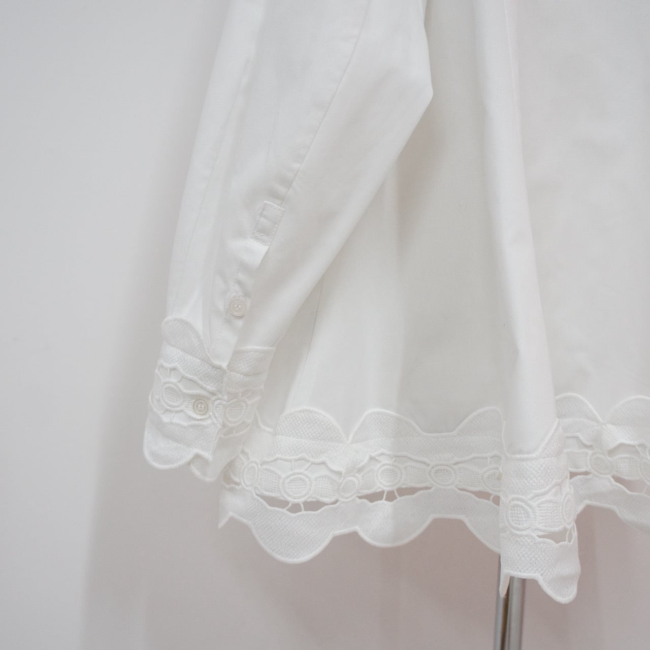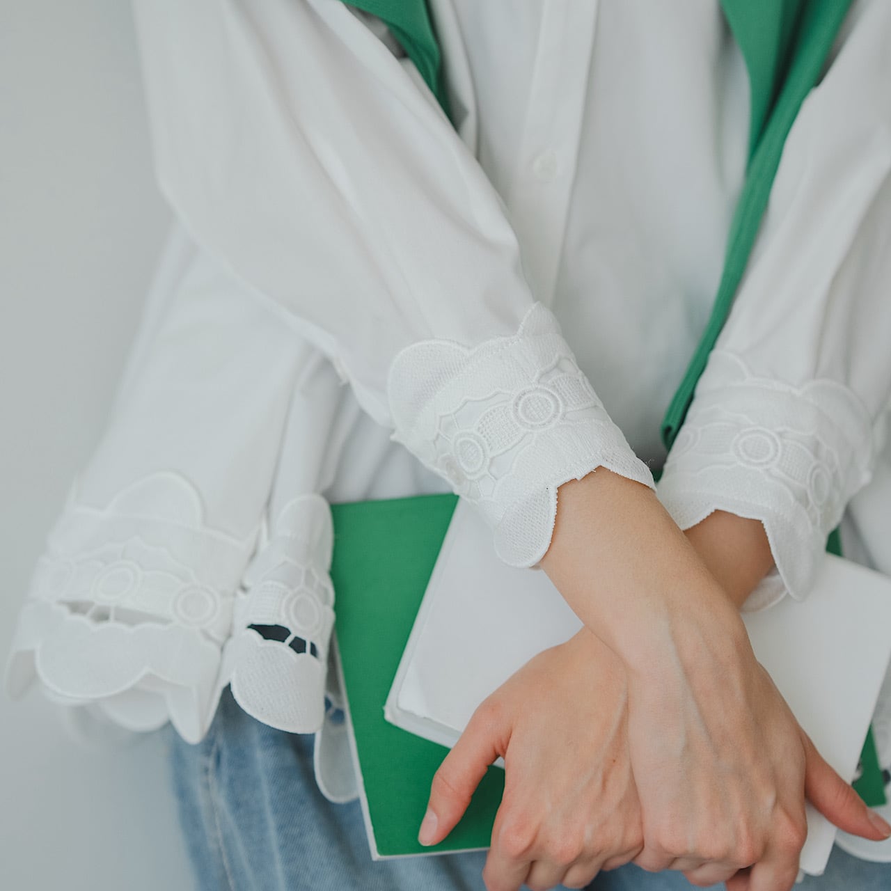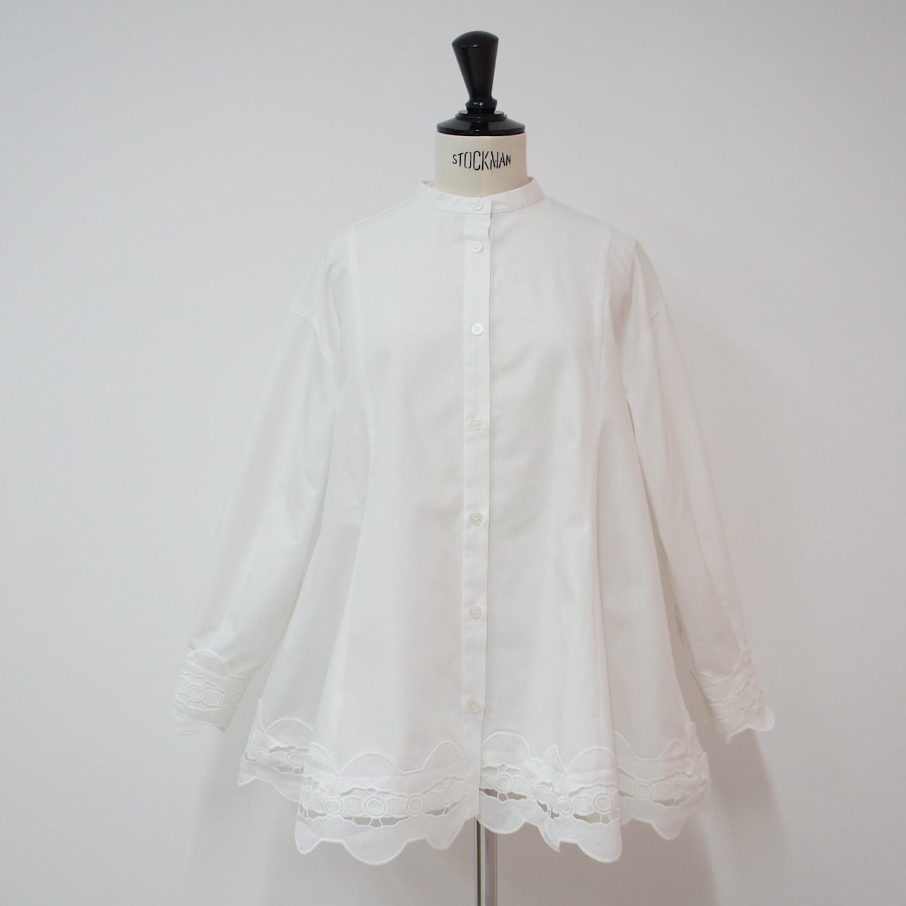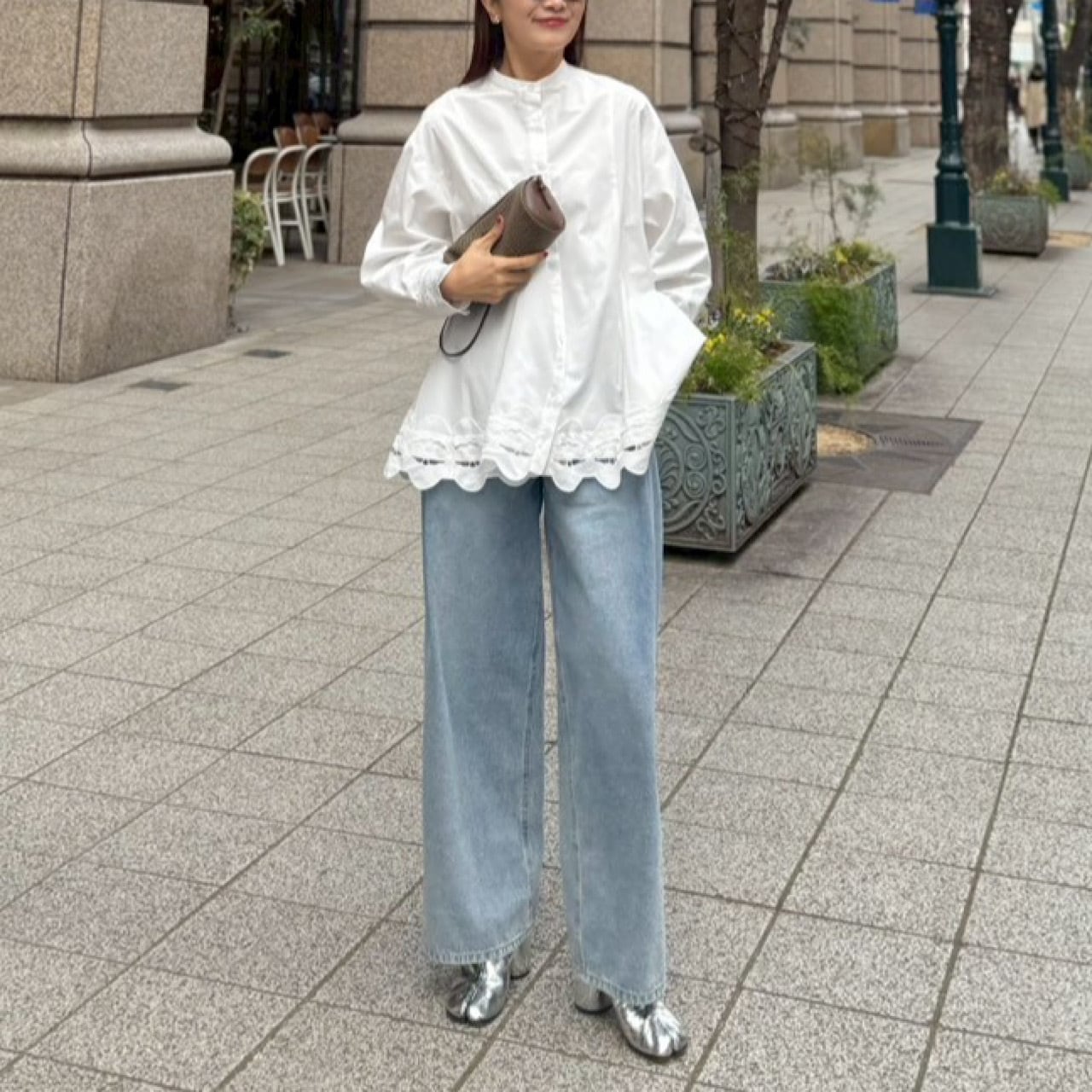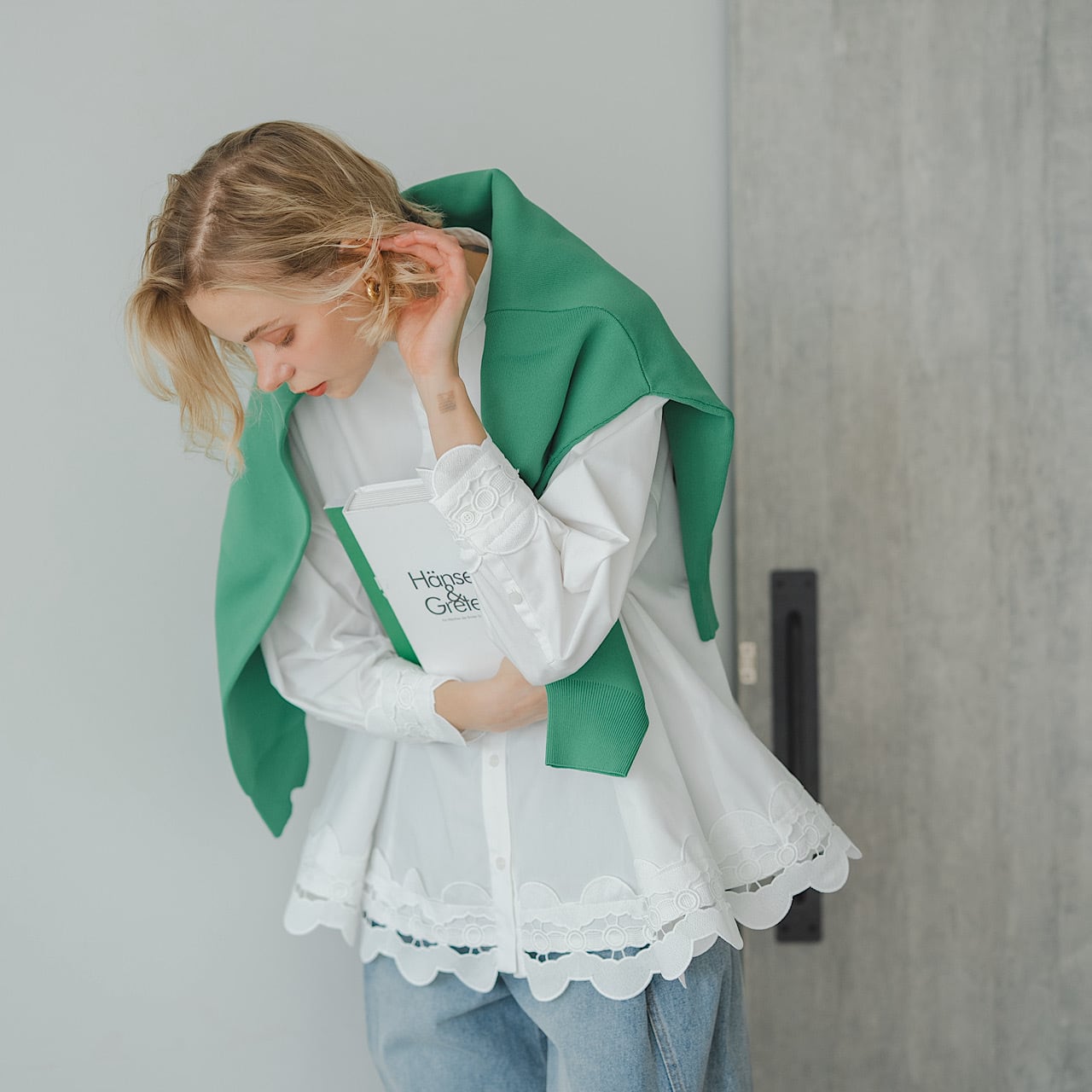 甘くなりすぎないレースデザインで主役級でありながらレイヤードや羽織りスタイルにも活躍。きちんと感と抜け感を兼ね備えた大人のためのブラウス。