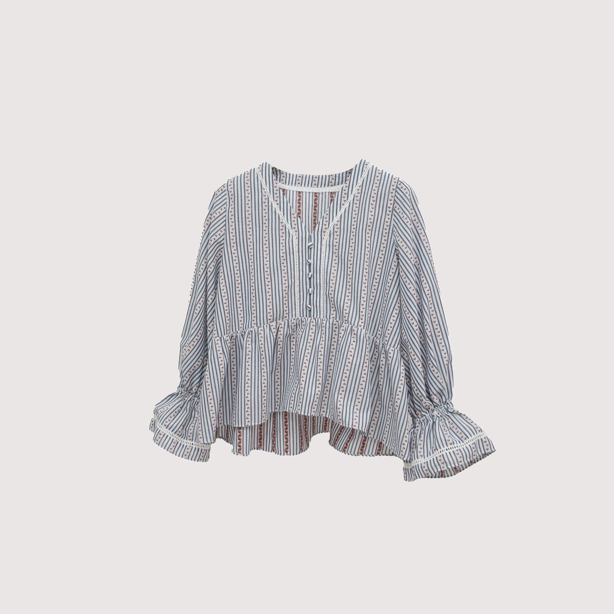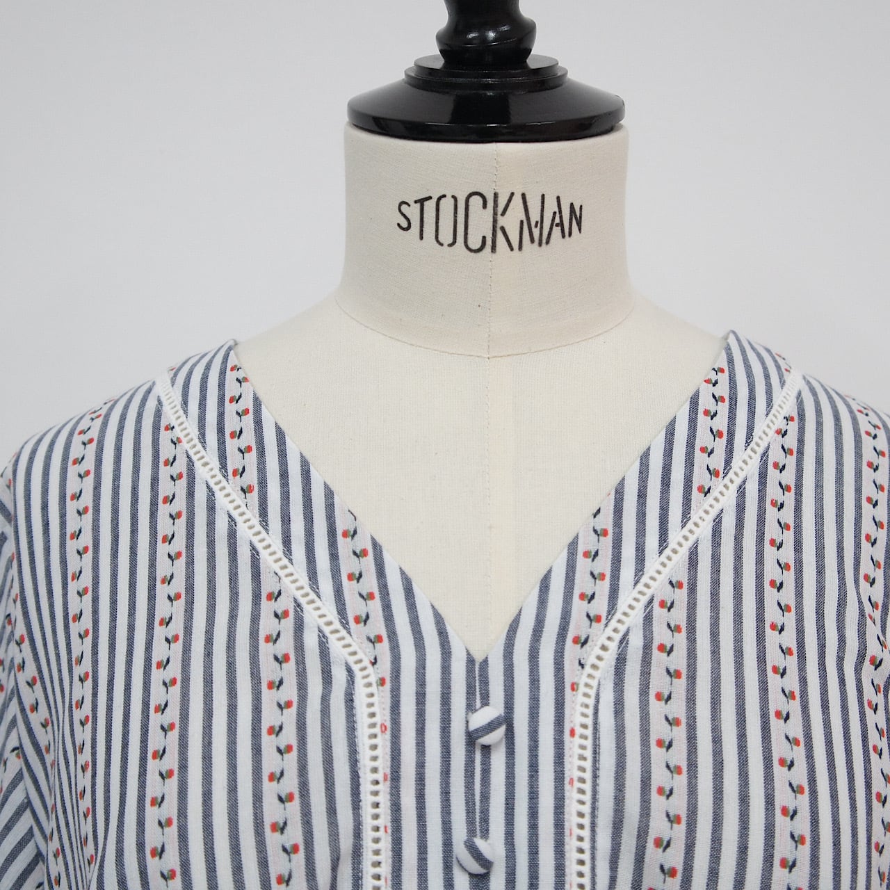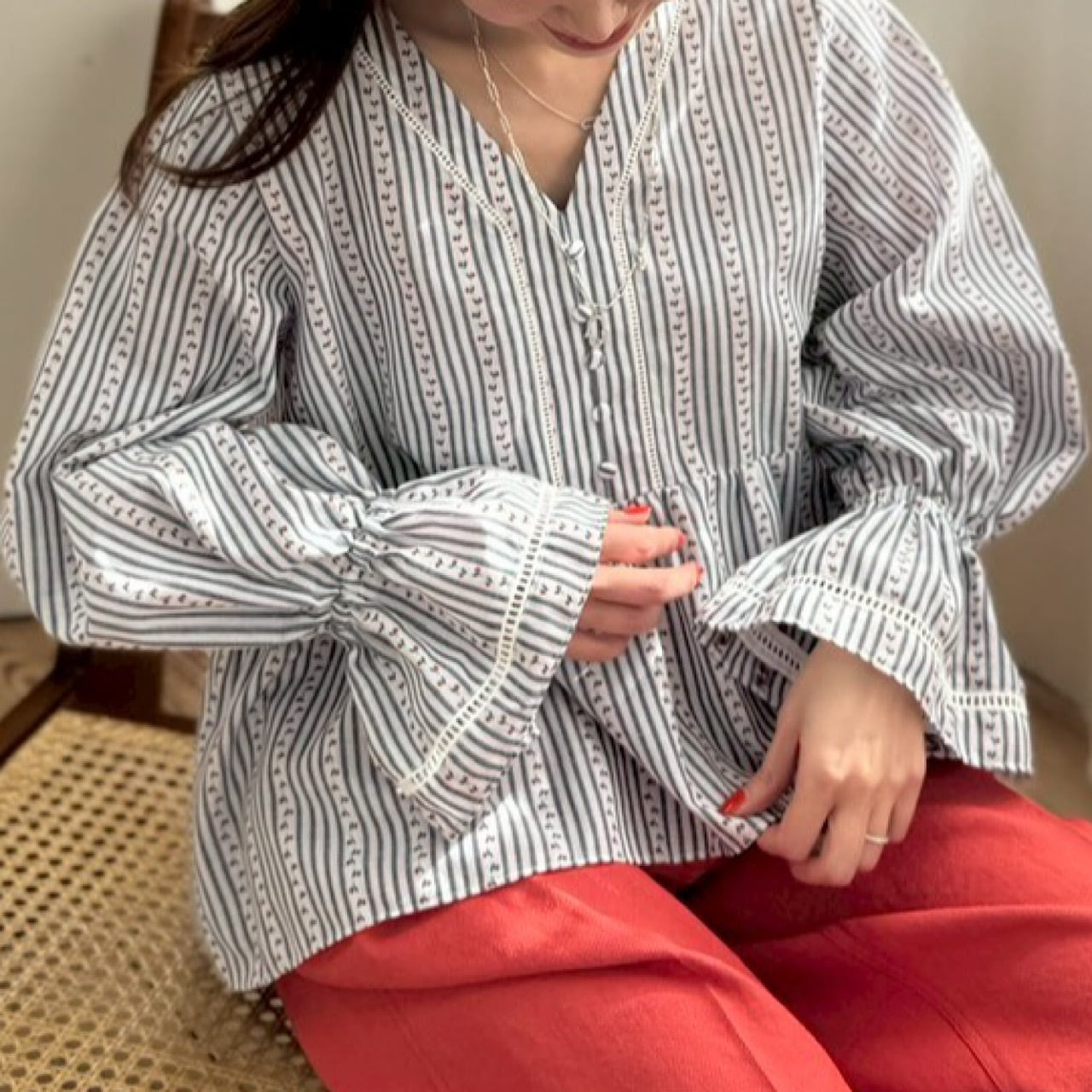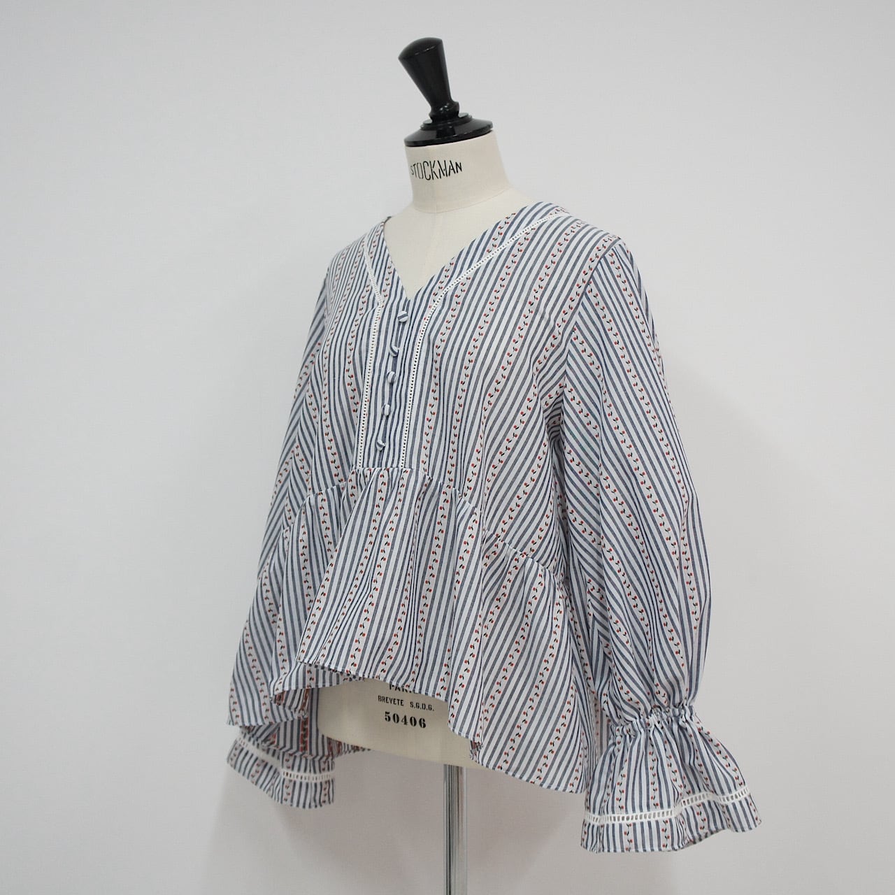 繊細なストライプにラダーデザインをあしらった上品で女性らしいブラウス。