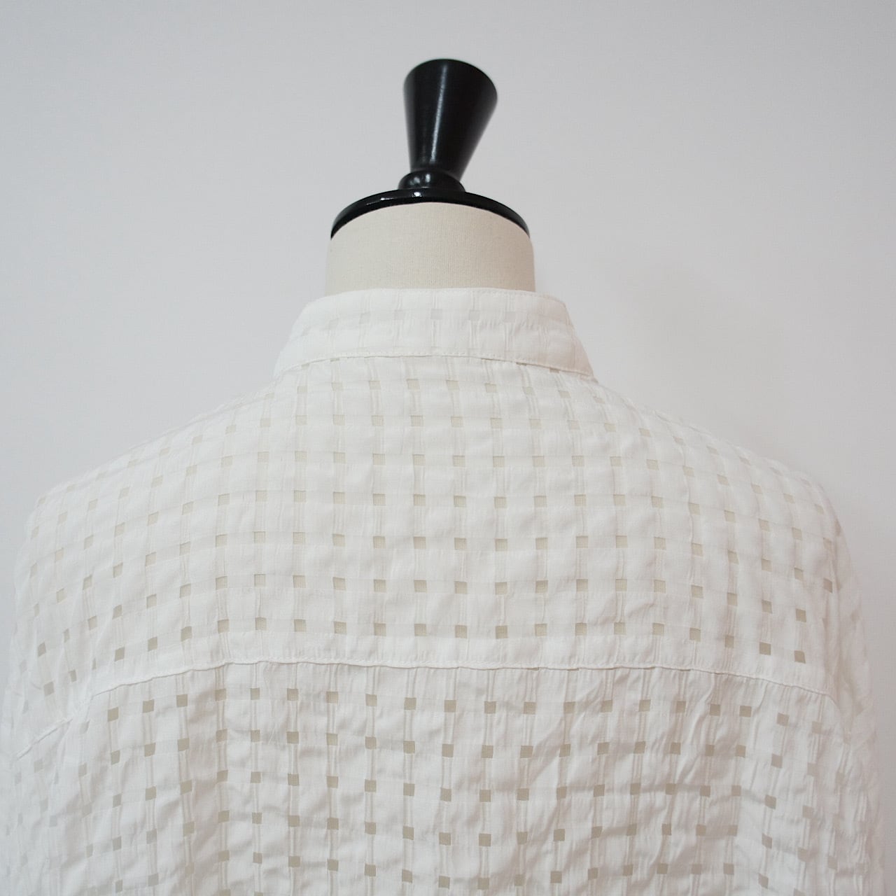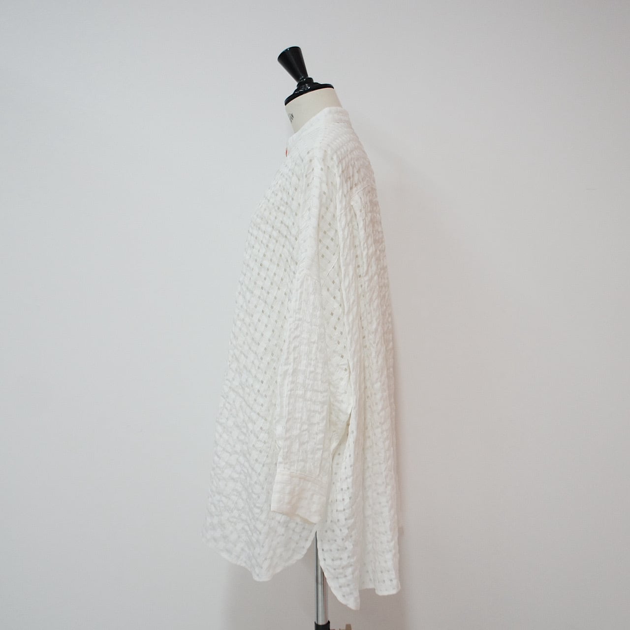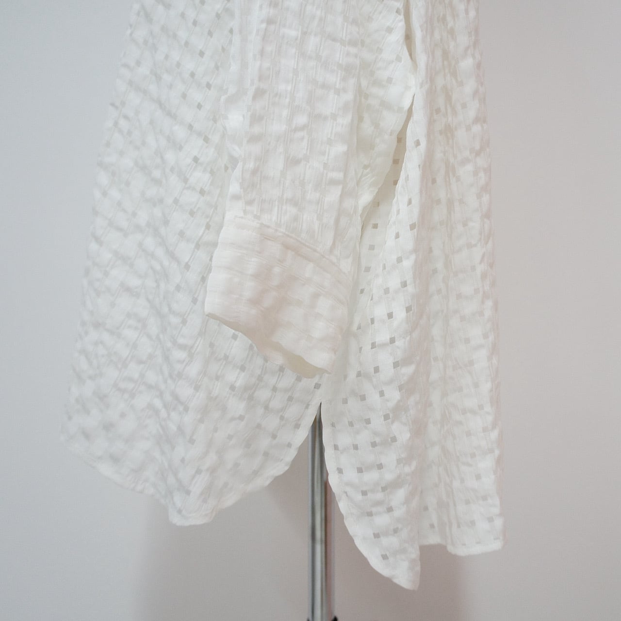 皺加工を施した生地に主張しすぎない細いラインのチェック柄のデザインはインナーとの相性も良く使いやすい。