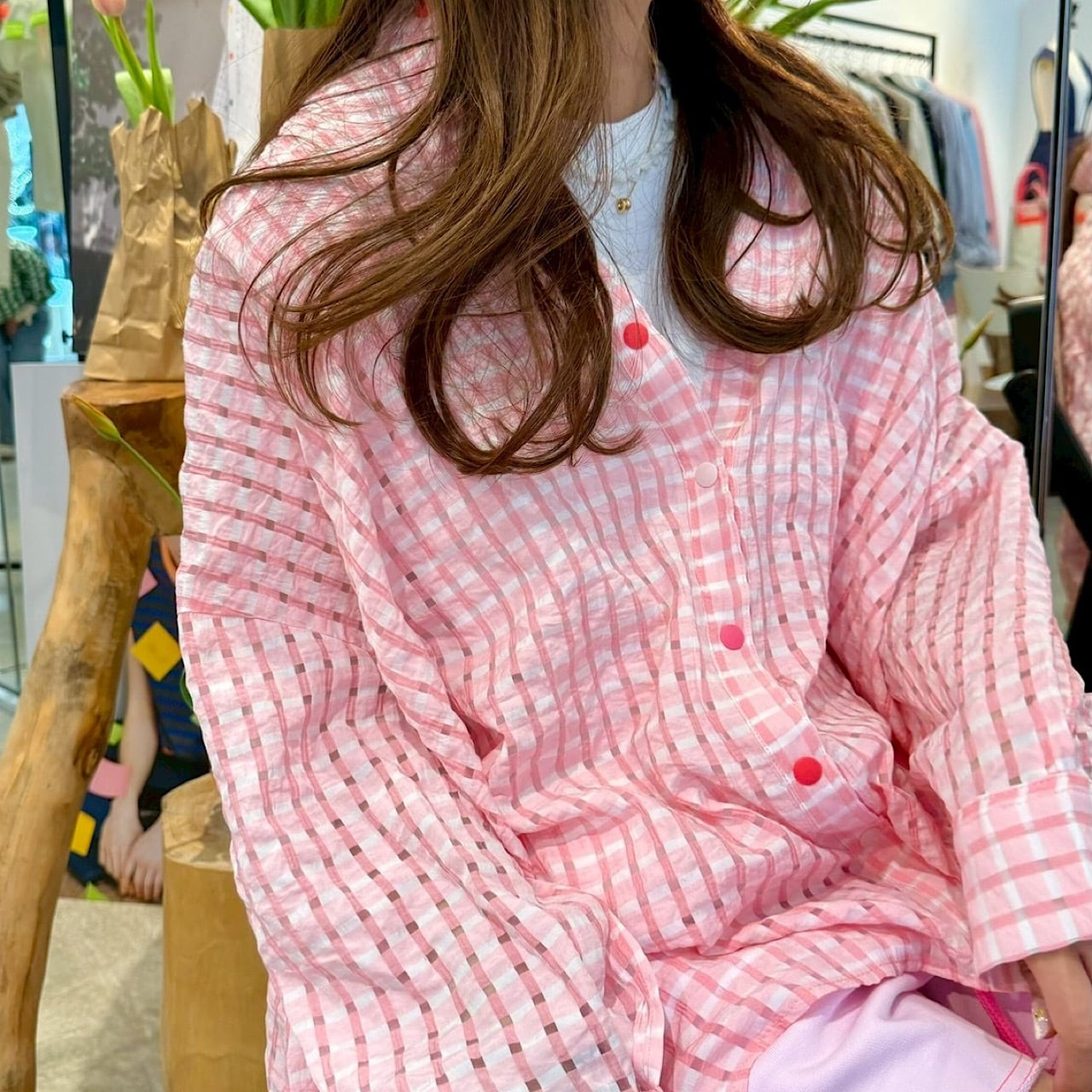 皺加工を施した生地に主張しすぎない細いラインのチェック柄のデザインはインナーとの相性も良く使いやすい。