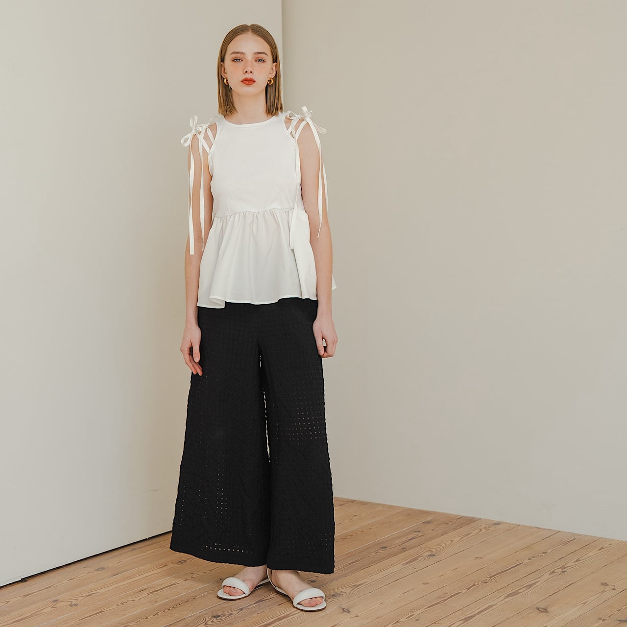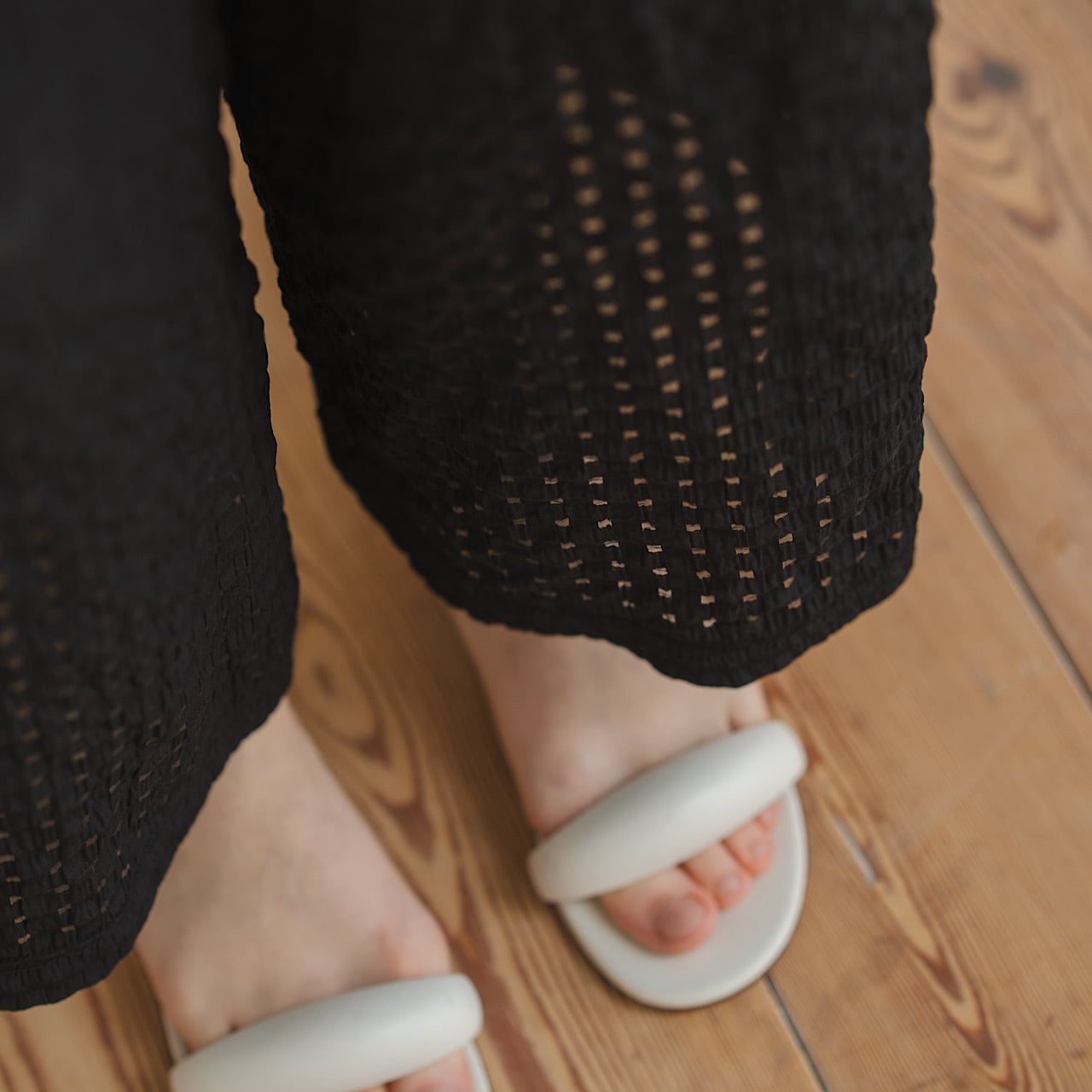 広がりすぎないワイドシルエットで、脚のラインを美しく見せてくれます。